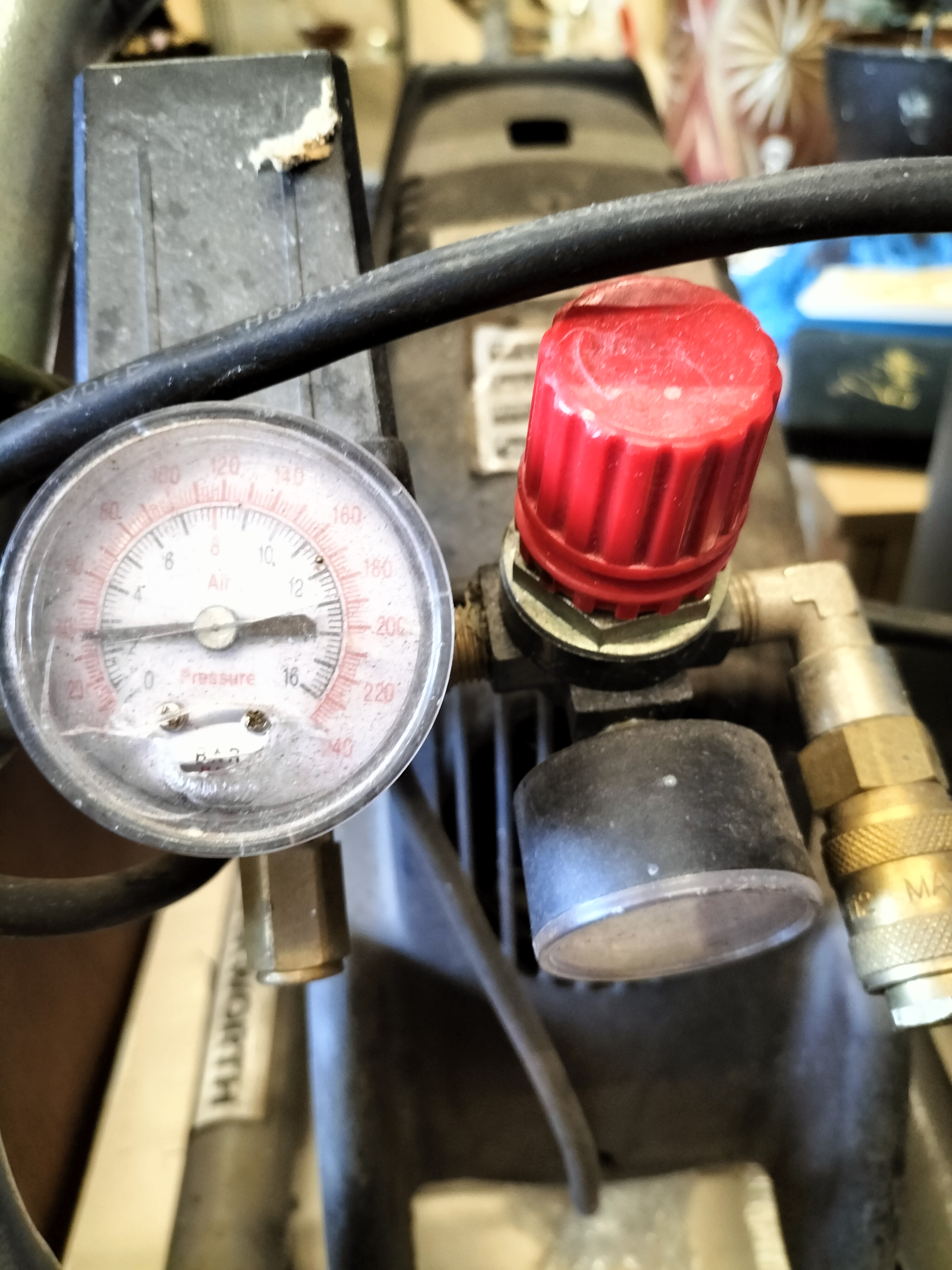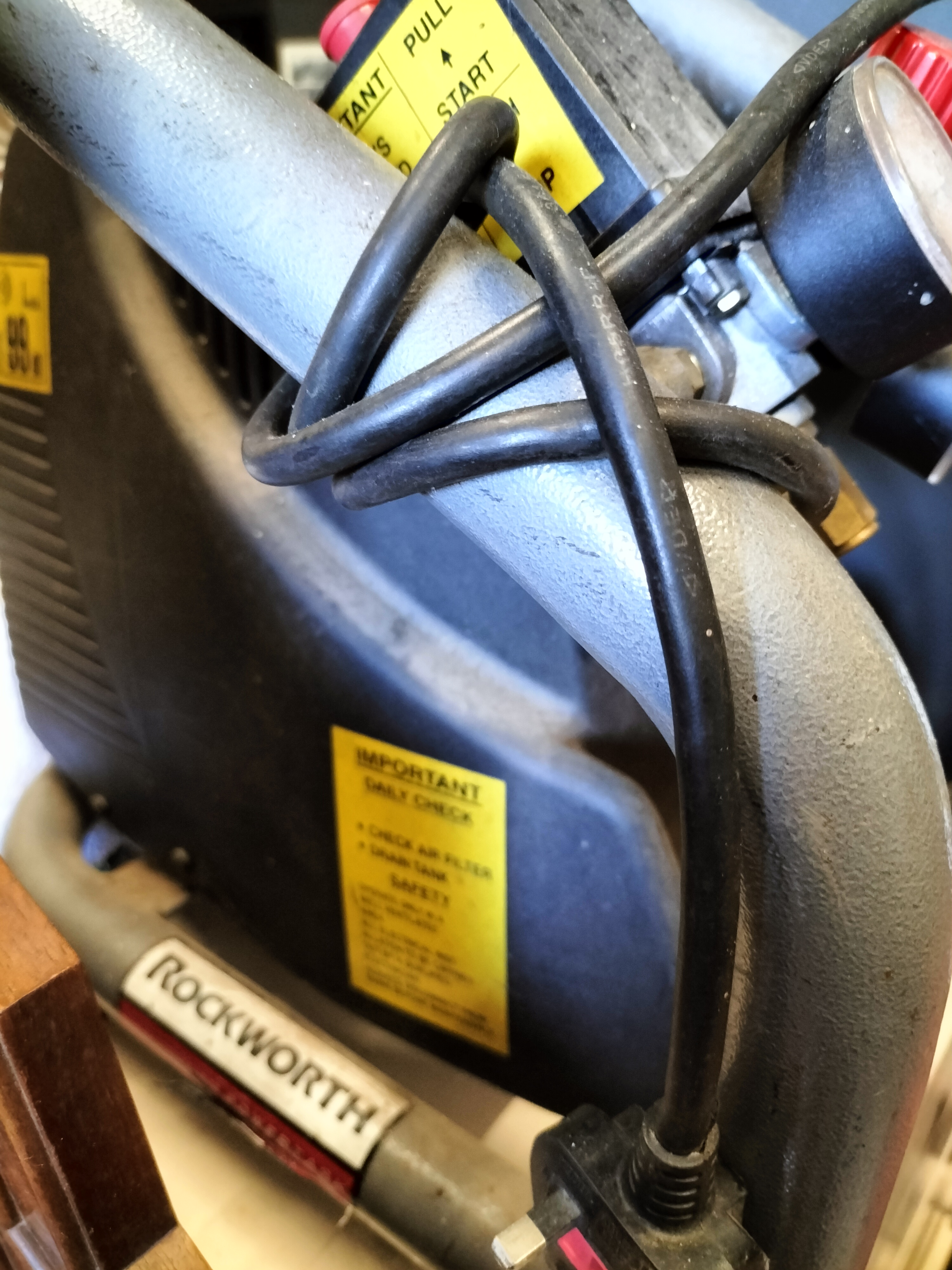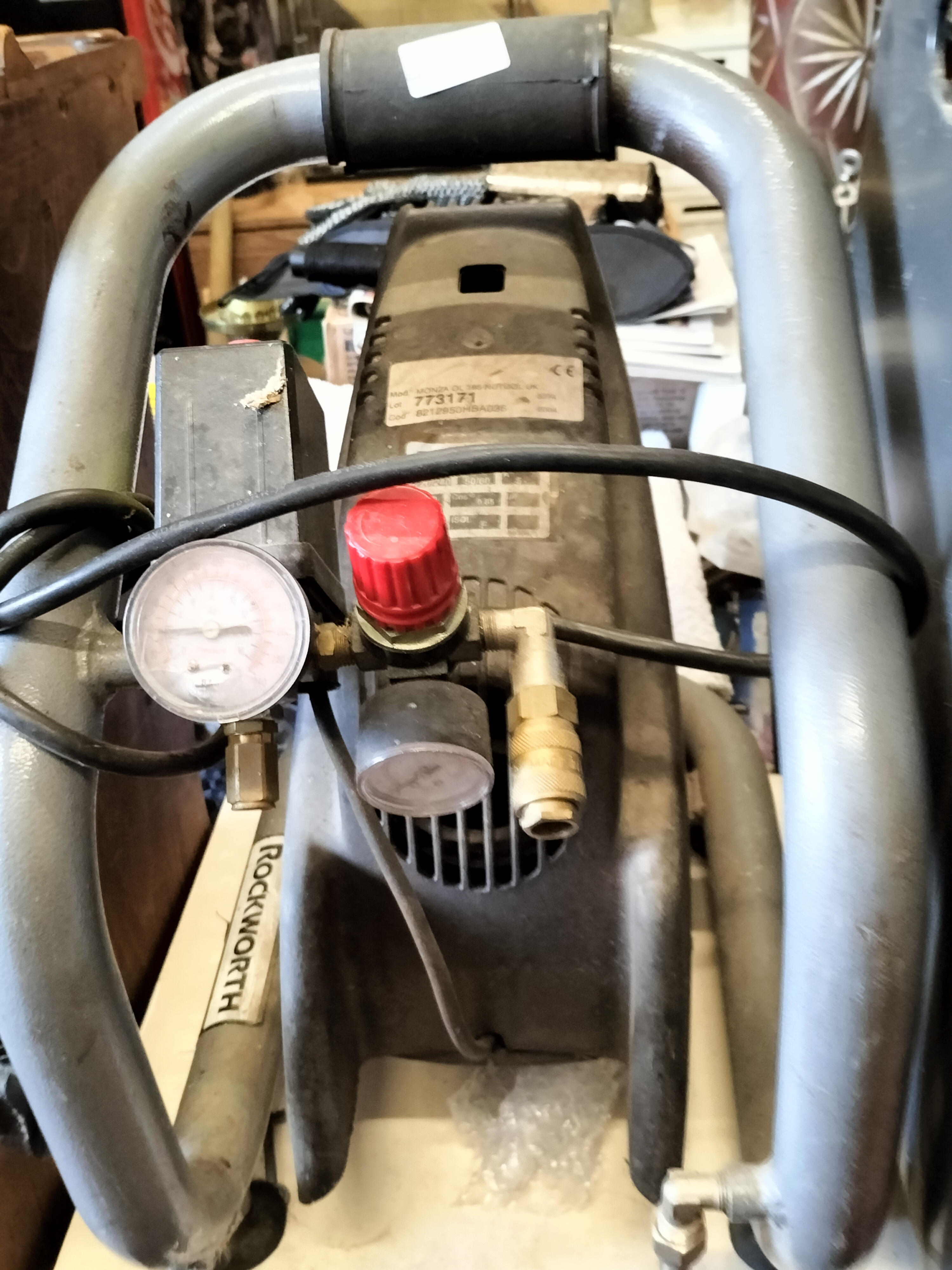 A Rockworth Monza DL 195 portable air compressor by Nutool UK featuring a grey and black finish with dual pressure gauges and a red regulator knob.