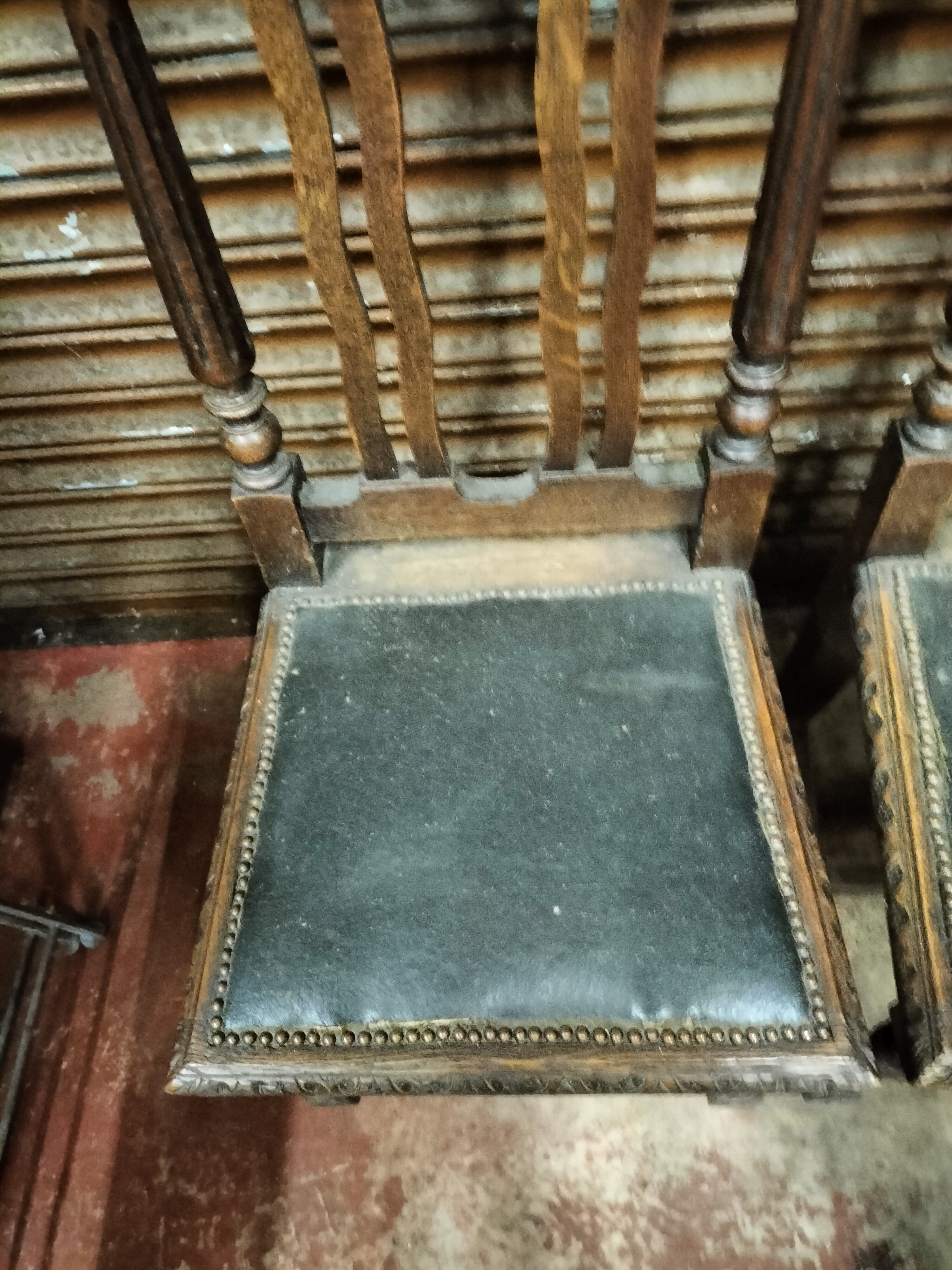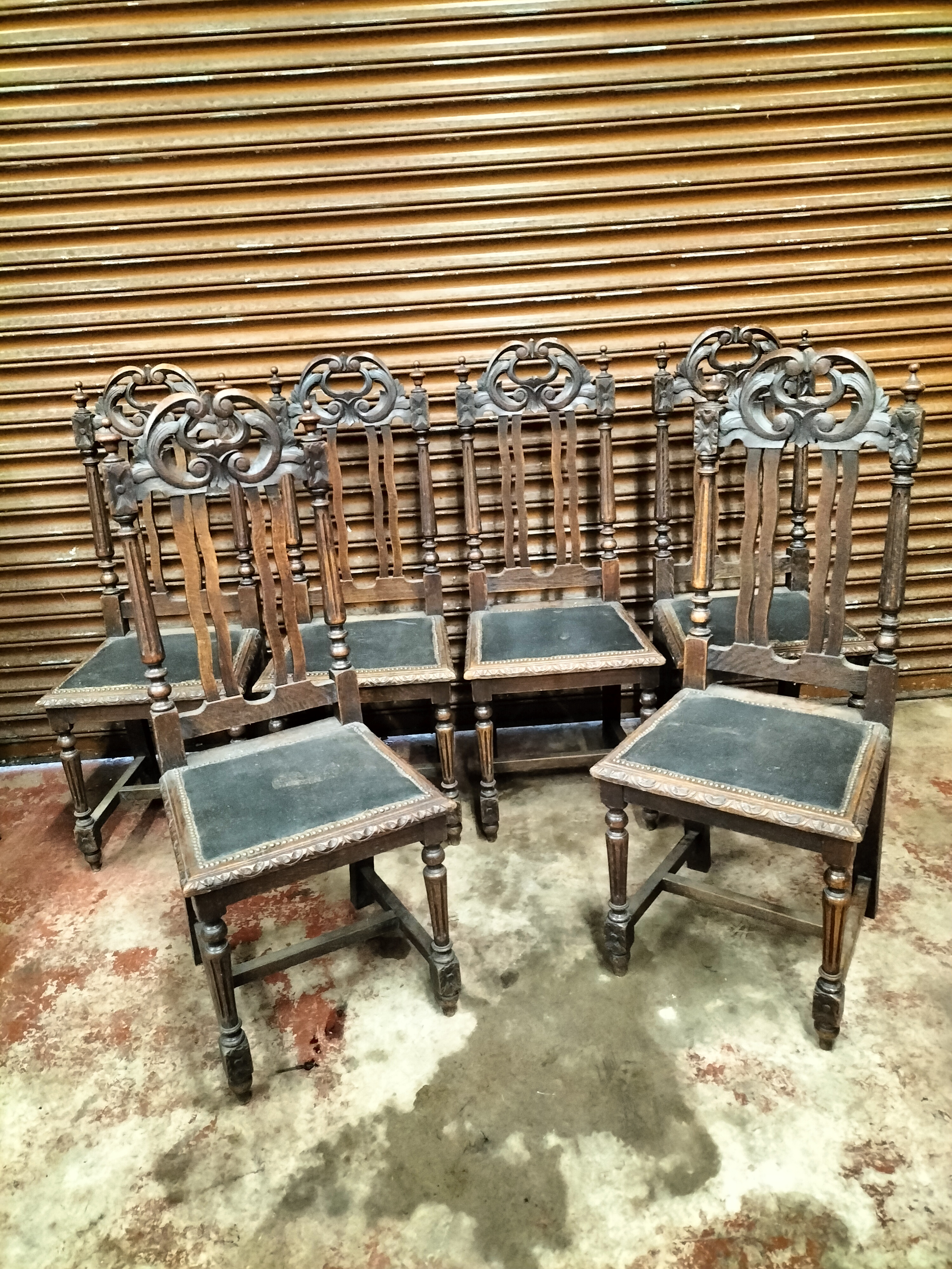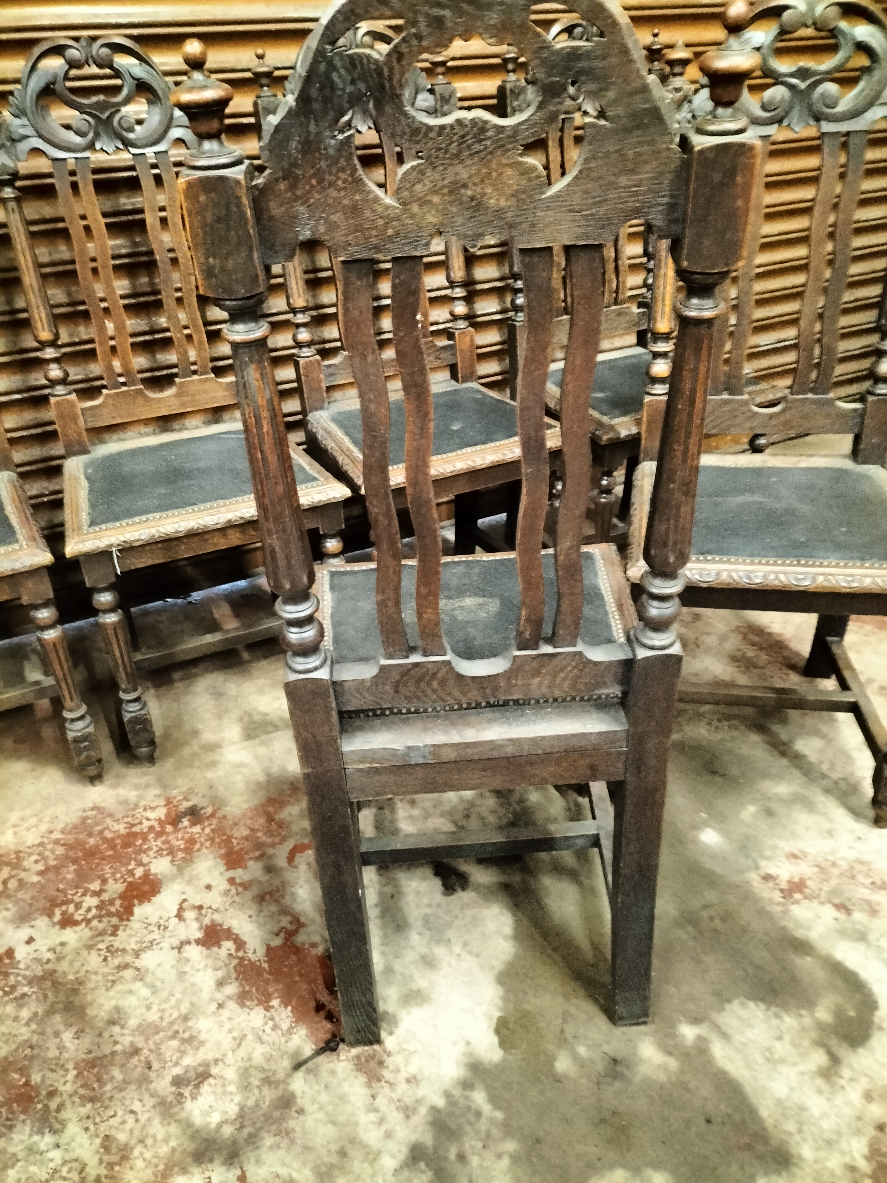 A collection of dark brown ornate wooden dining chairs featuring decoratively carved backs and dark upholstered seats.