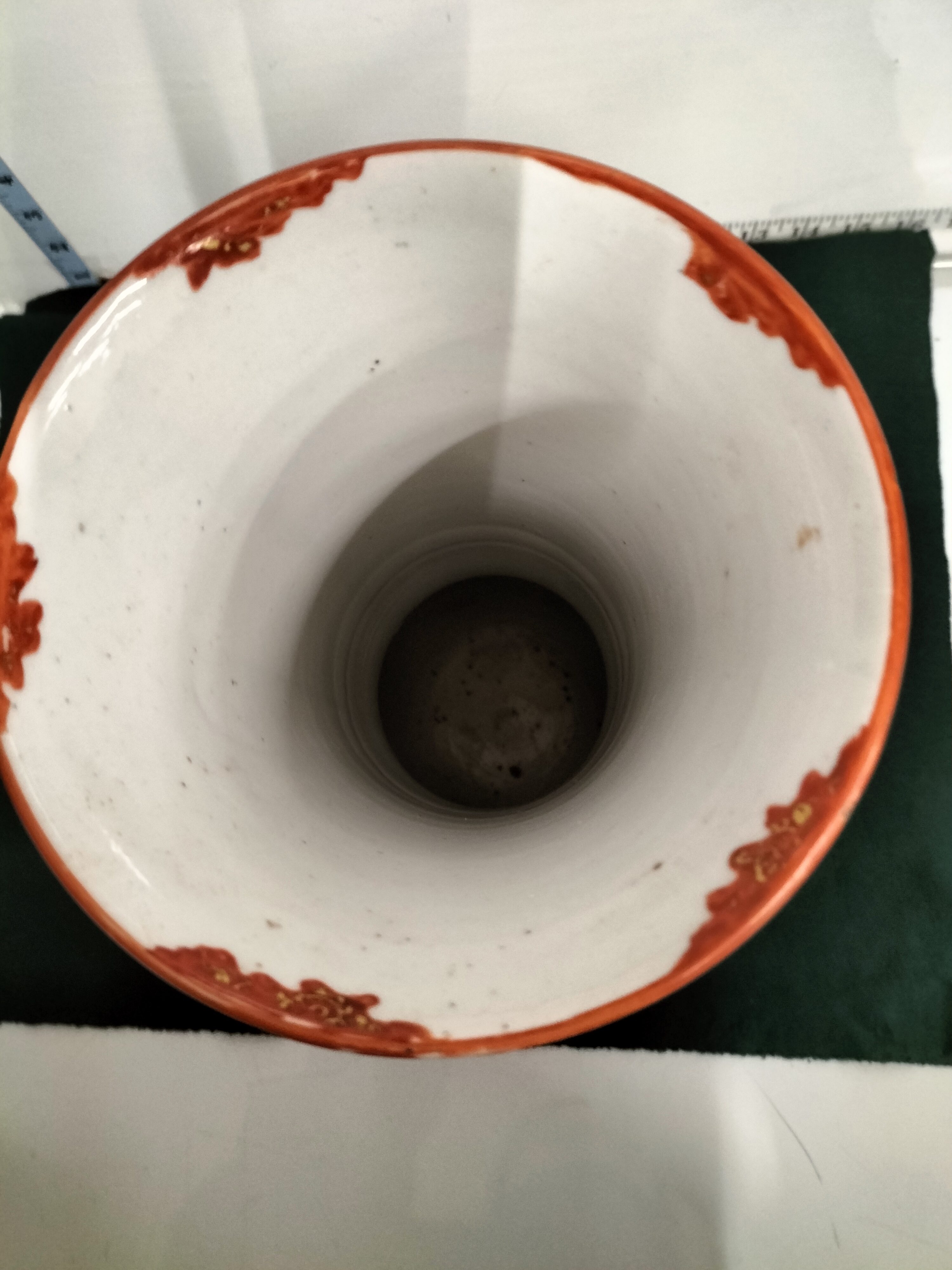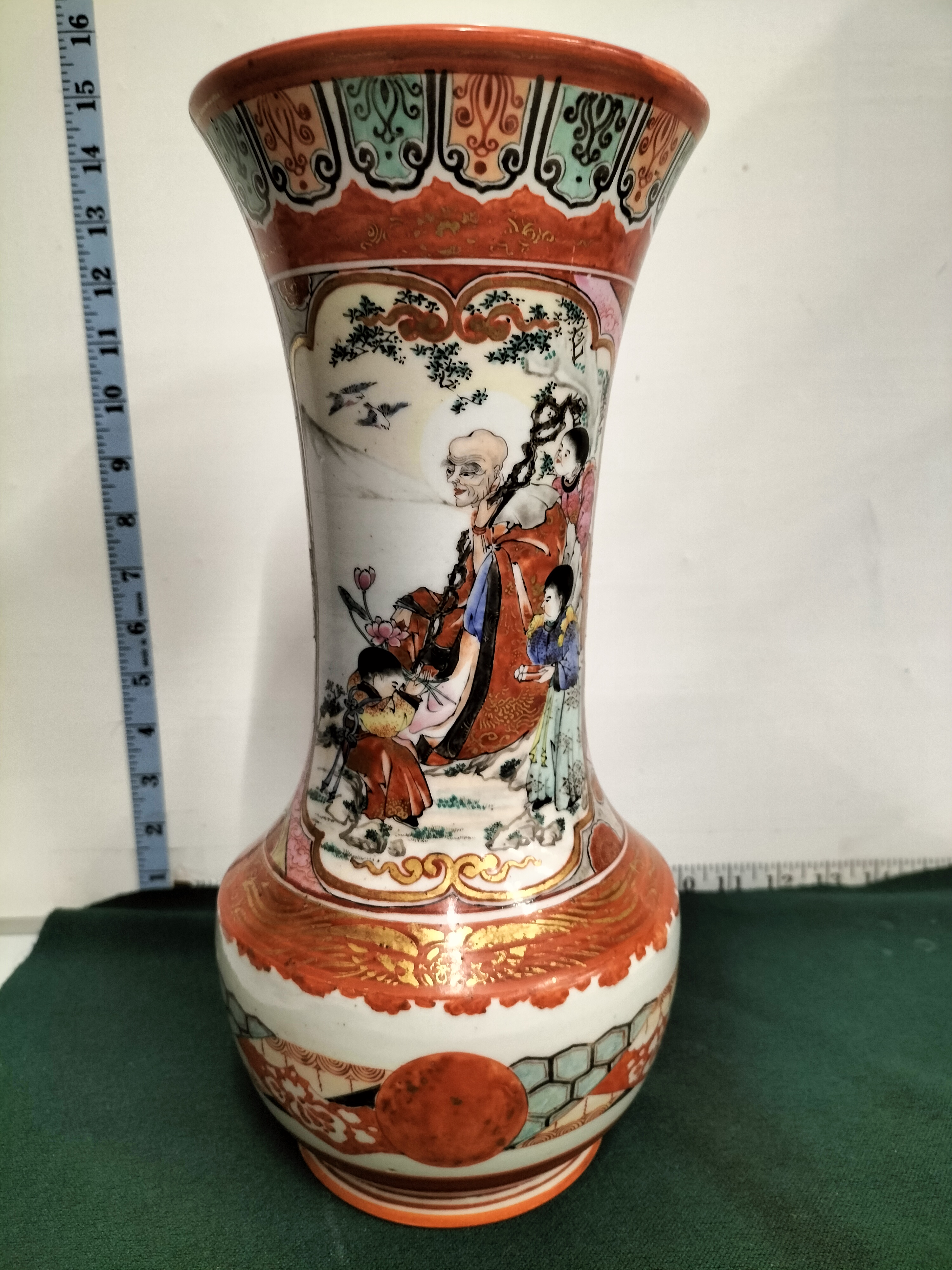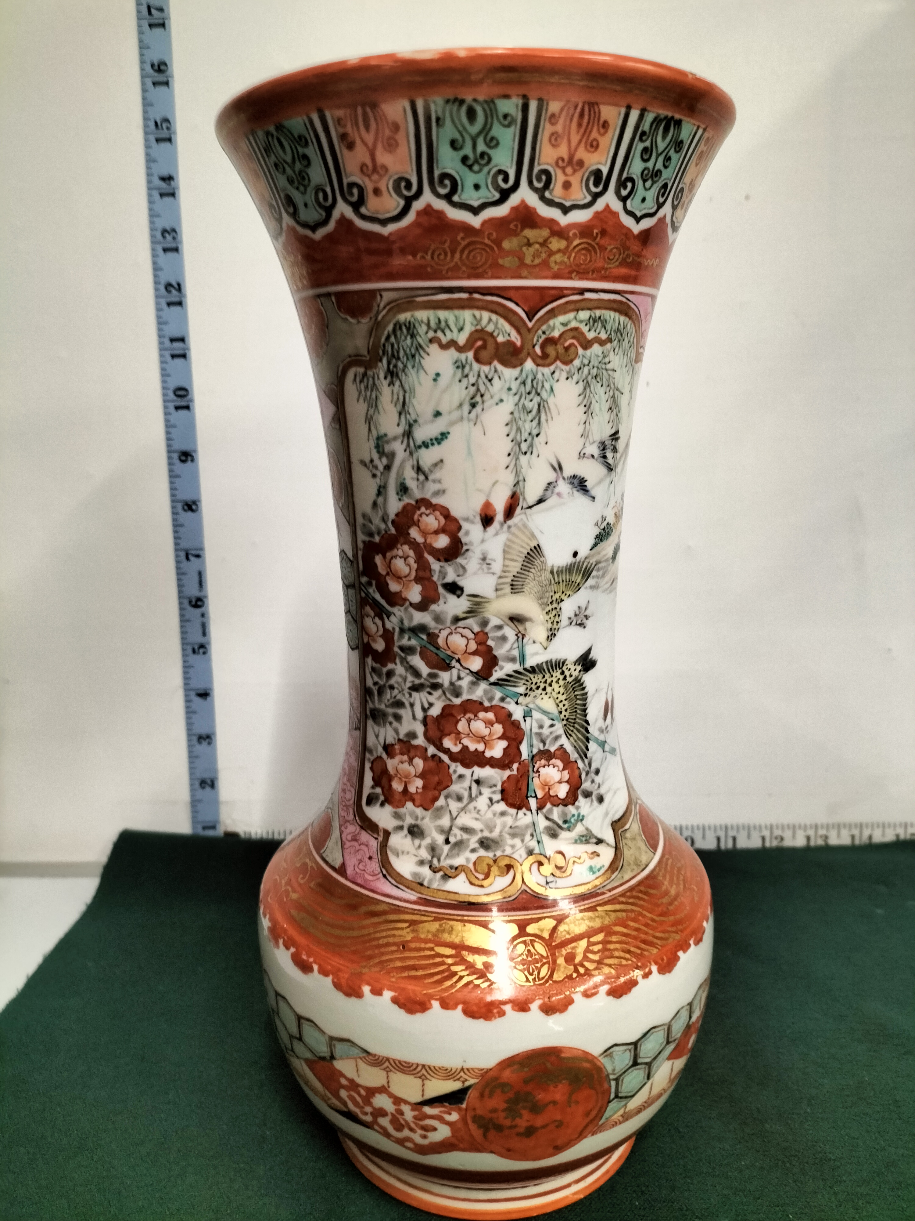 A Japanese Kutani porcelain vase featuring hand-painted figure and bird scenes in iron-red, gold, and polychrome enamels on a white ground, measuring approximately 15.5 inches in height.