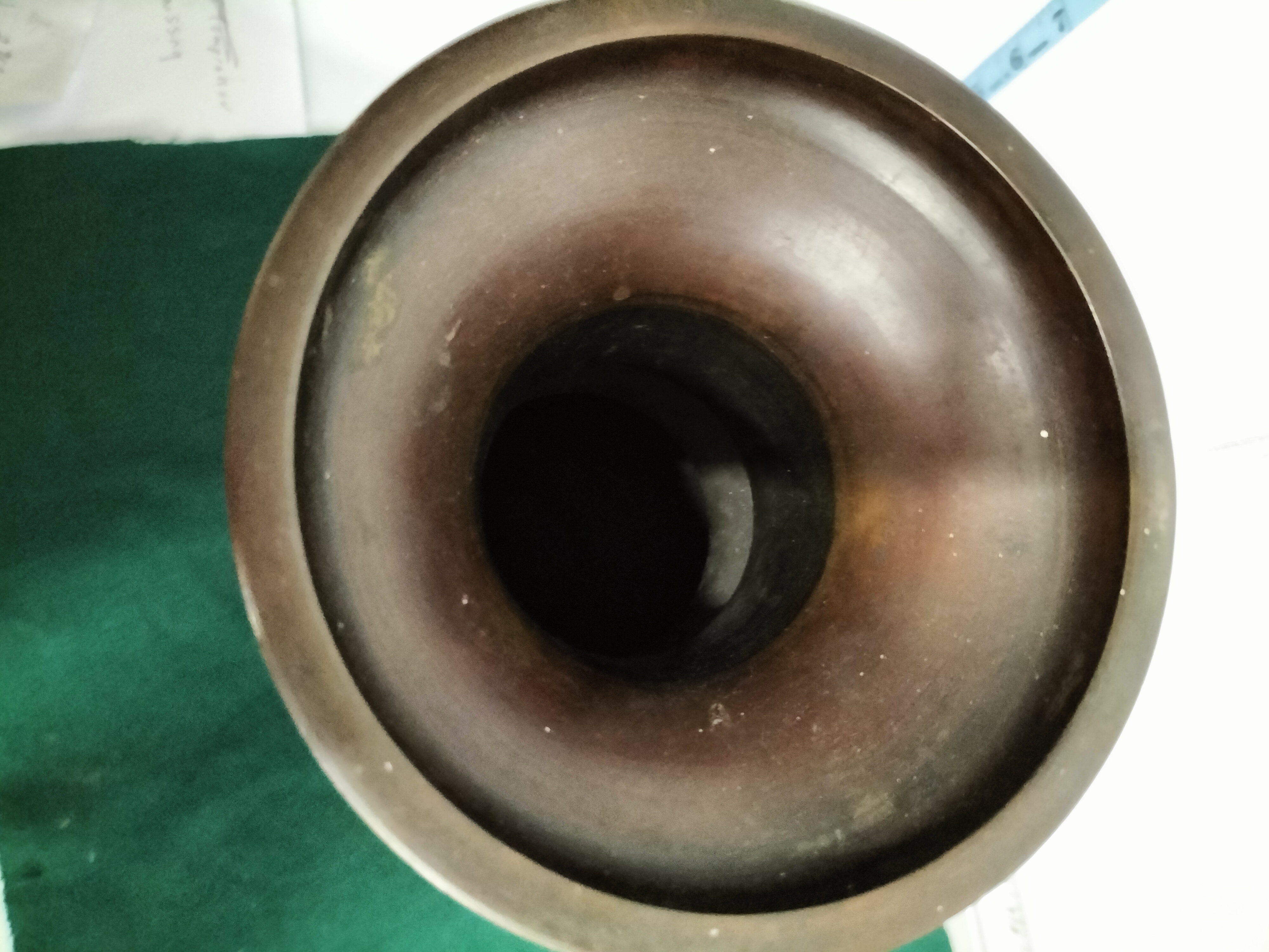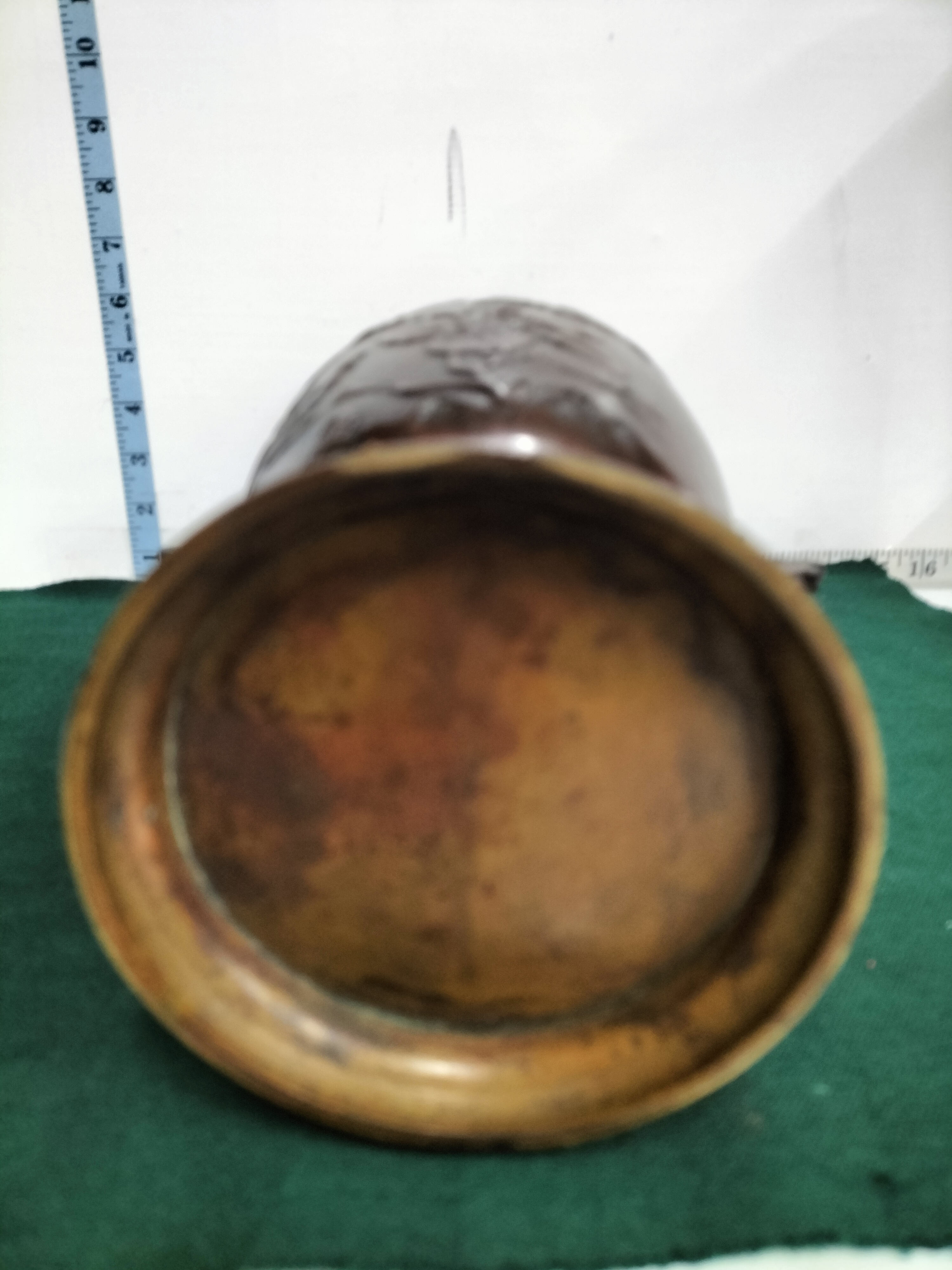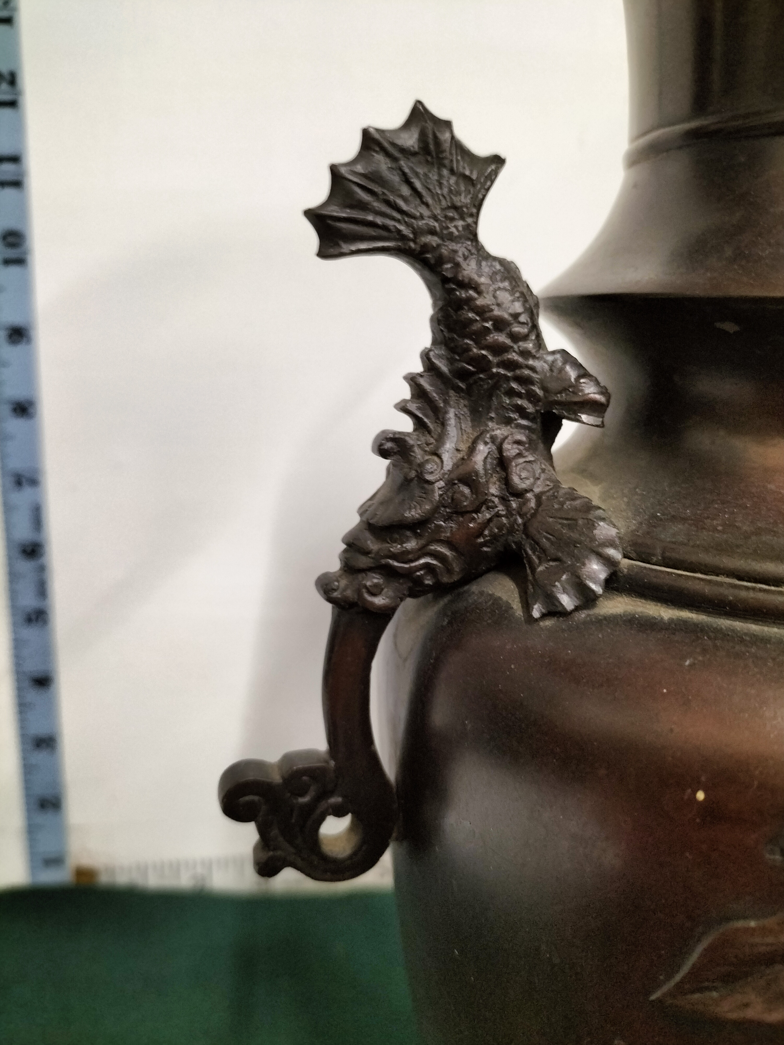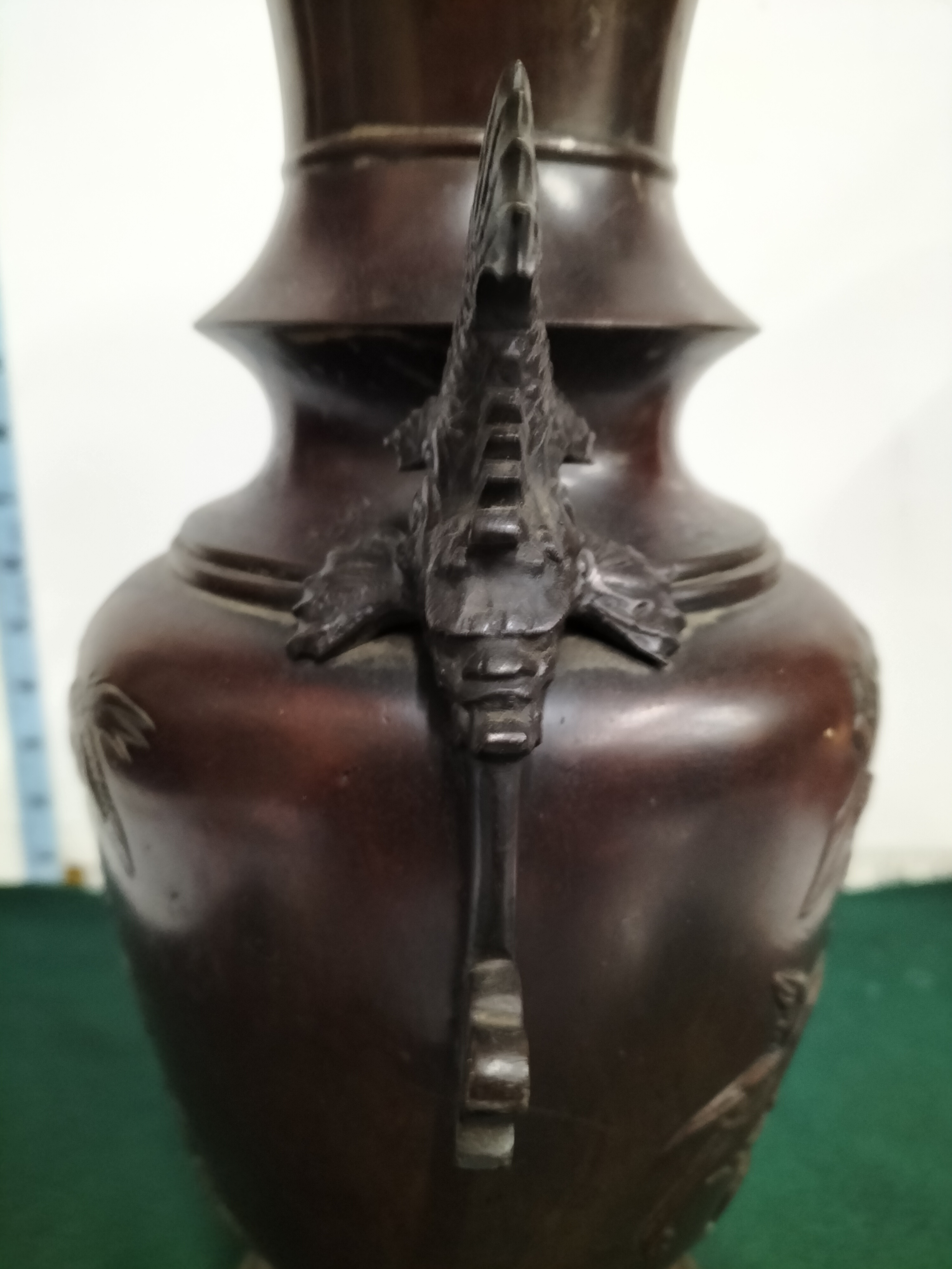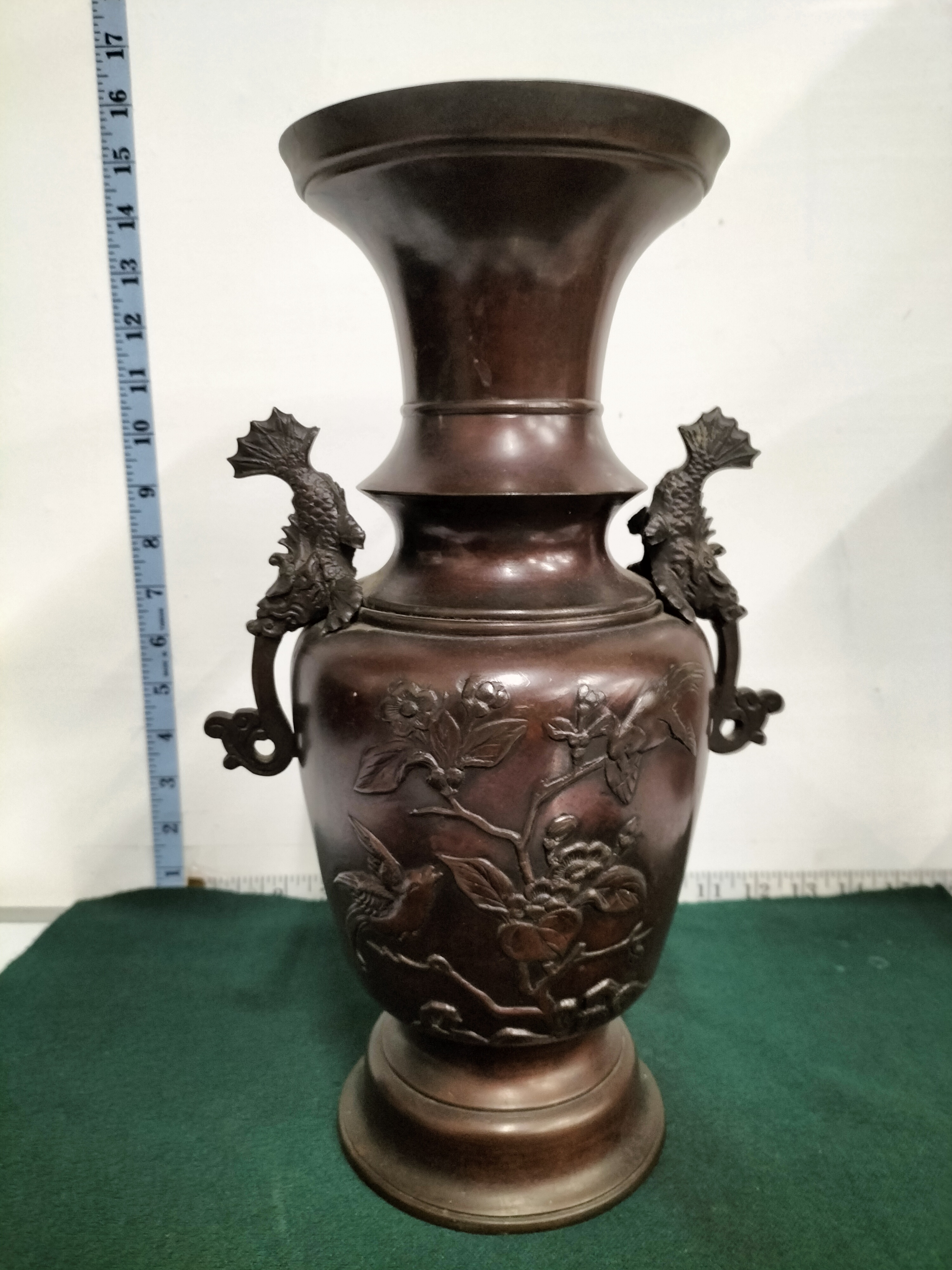 A large bronze-toned metal vase featuring relief-carved avian and floral motifs with mythical fish handles, measuring approximately 42 cm in height.