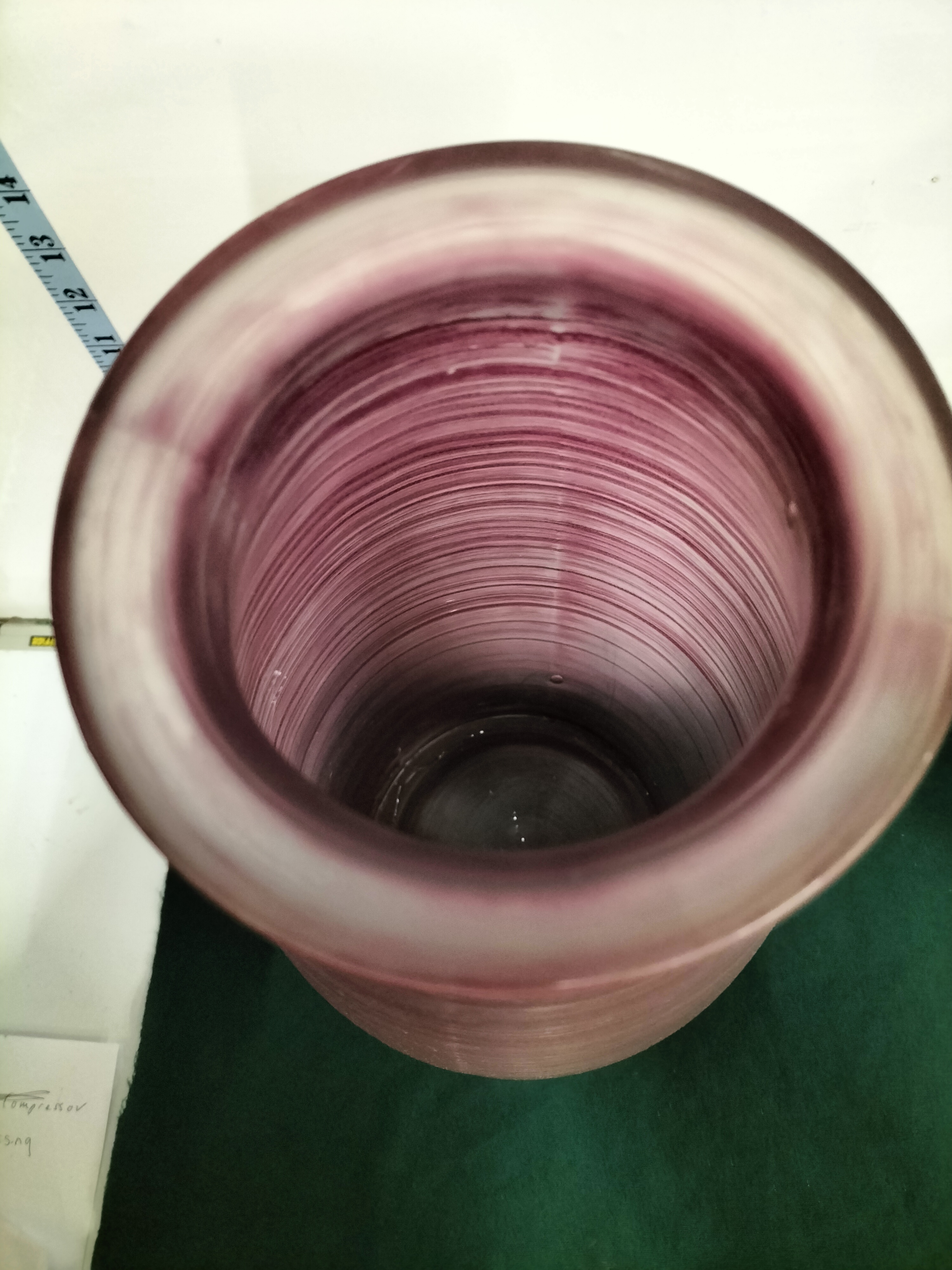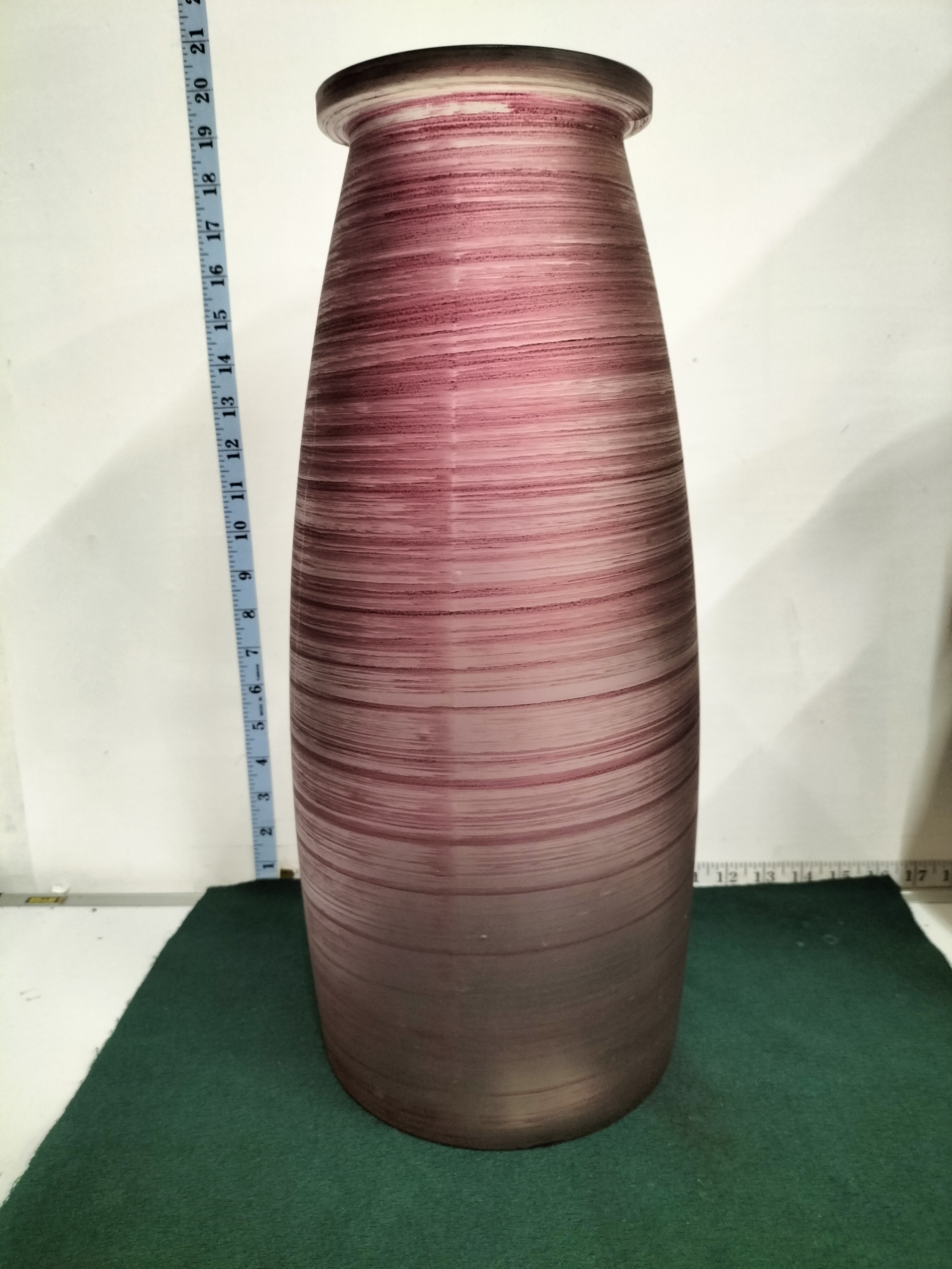 A tall cylindrical frosted amethyst glass vase featuring fine horizontal textured lines and measuring approximately 20 inches in height.