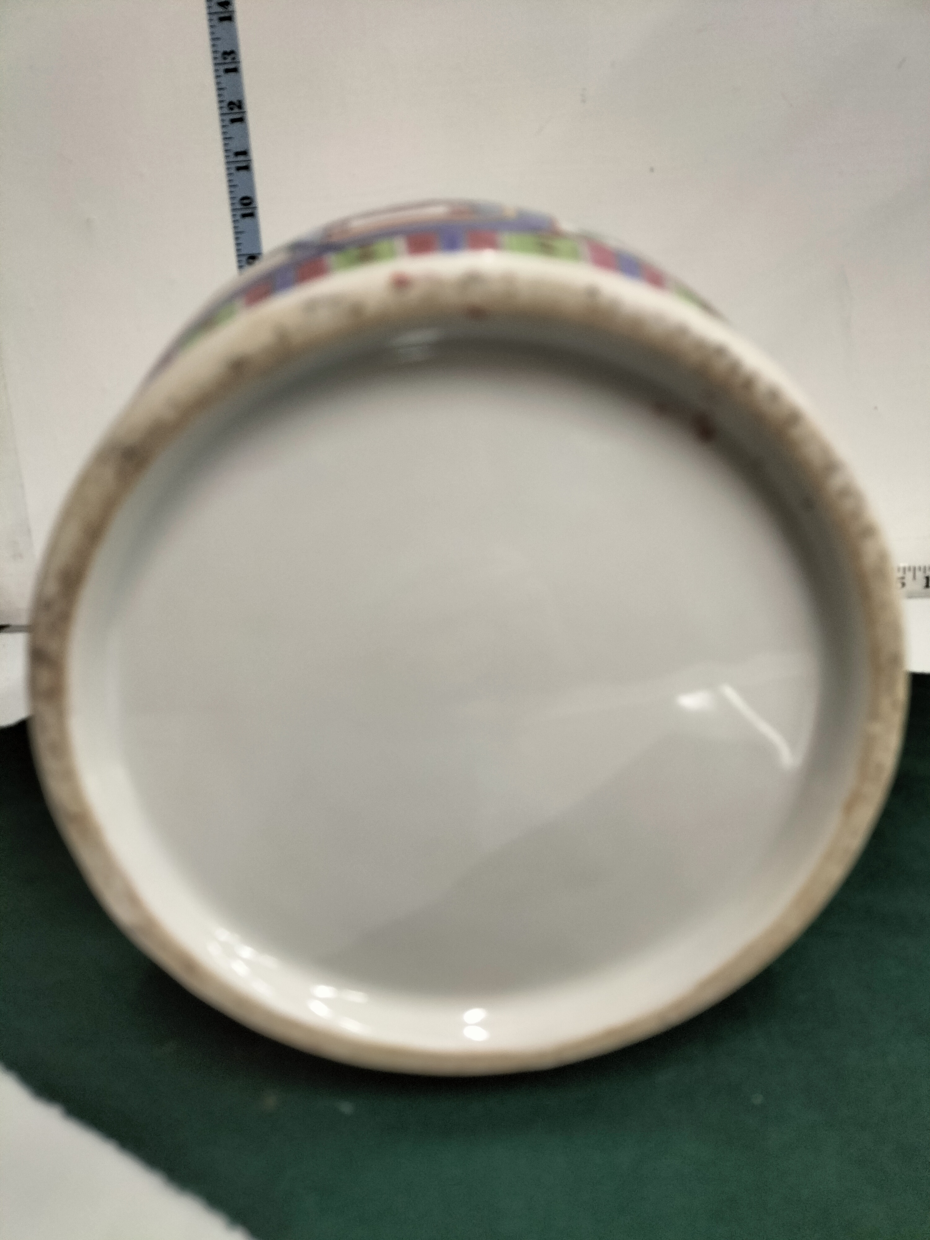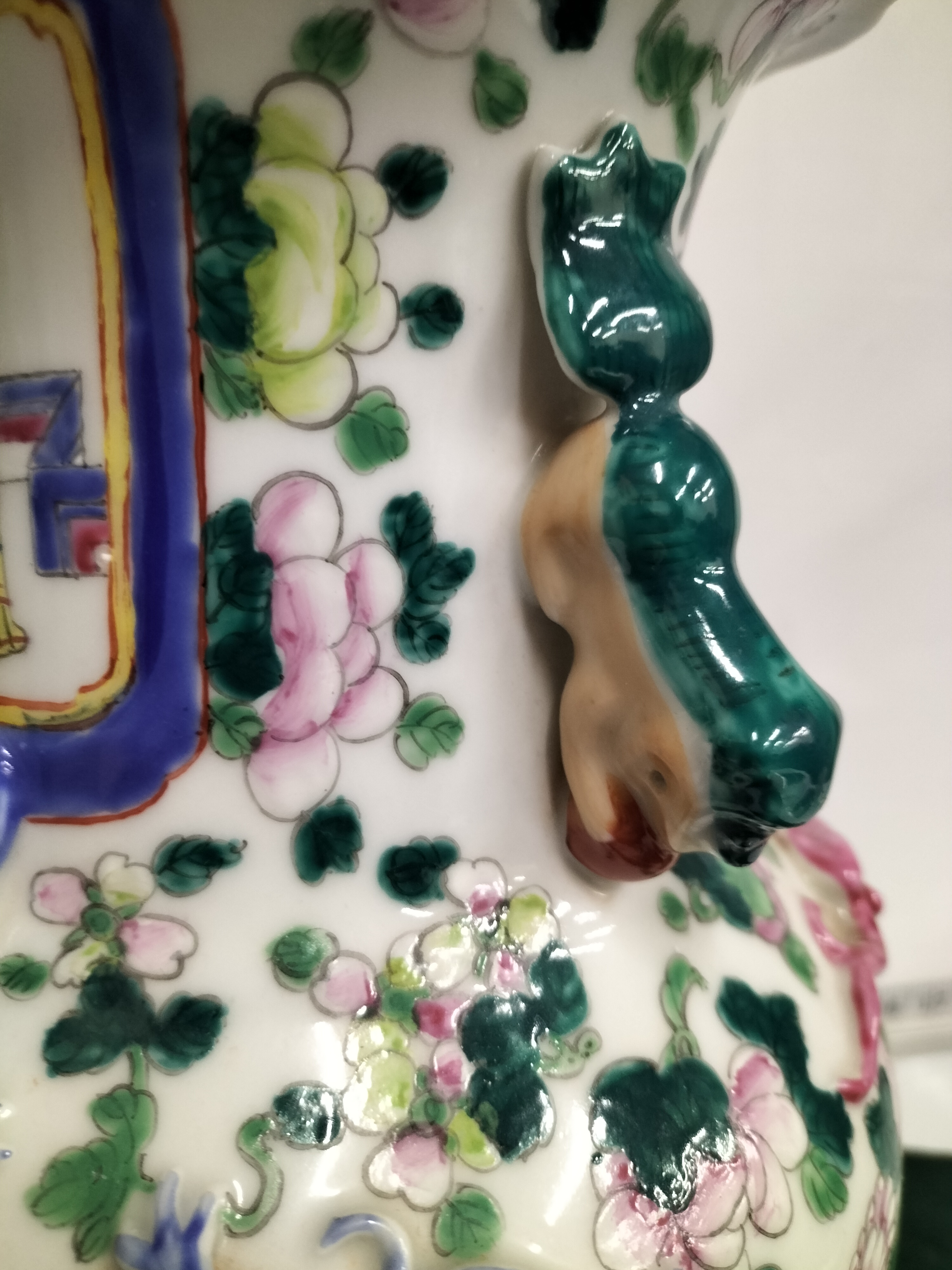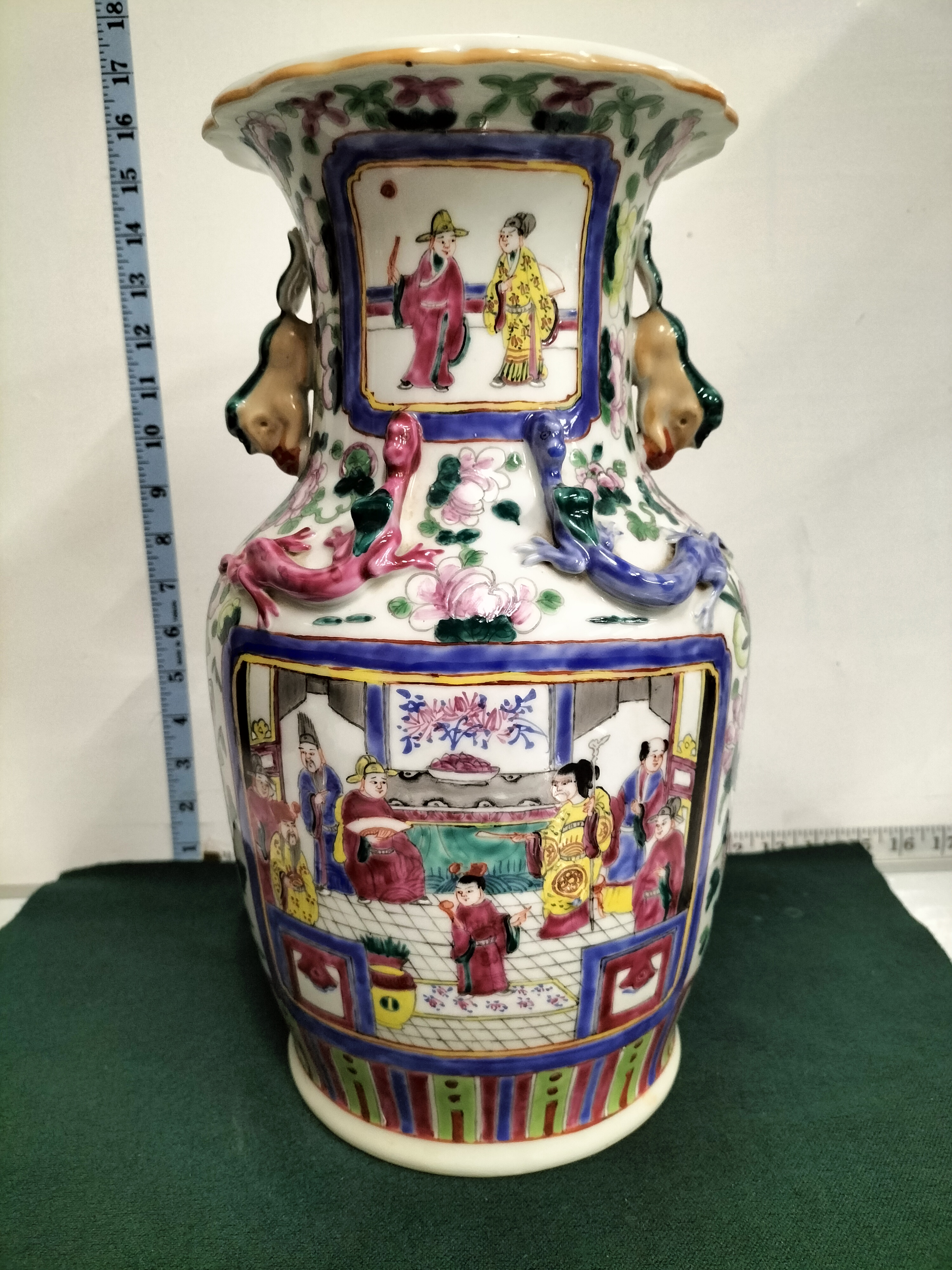 A Chinese famille rose Canton medallion porcelain vase featuring hand-painted figurative scenes, relief-moulded lizards, and foo dog handles, measuring approximately 17.5 inches in height.
