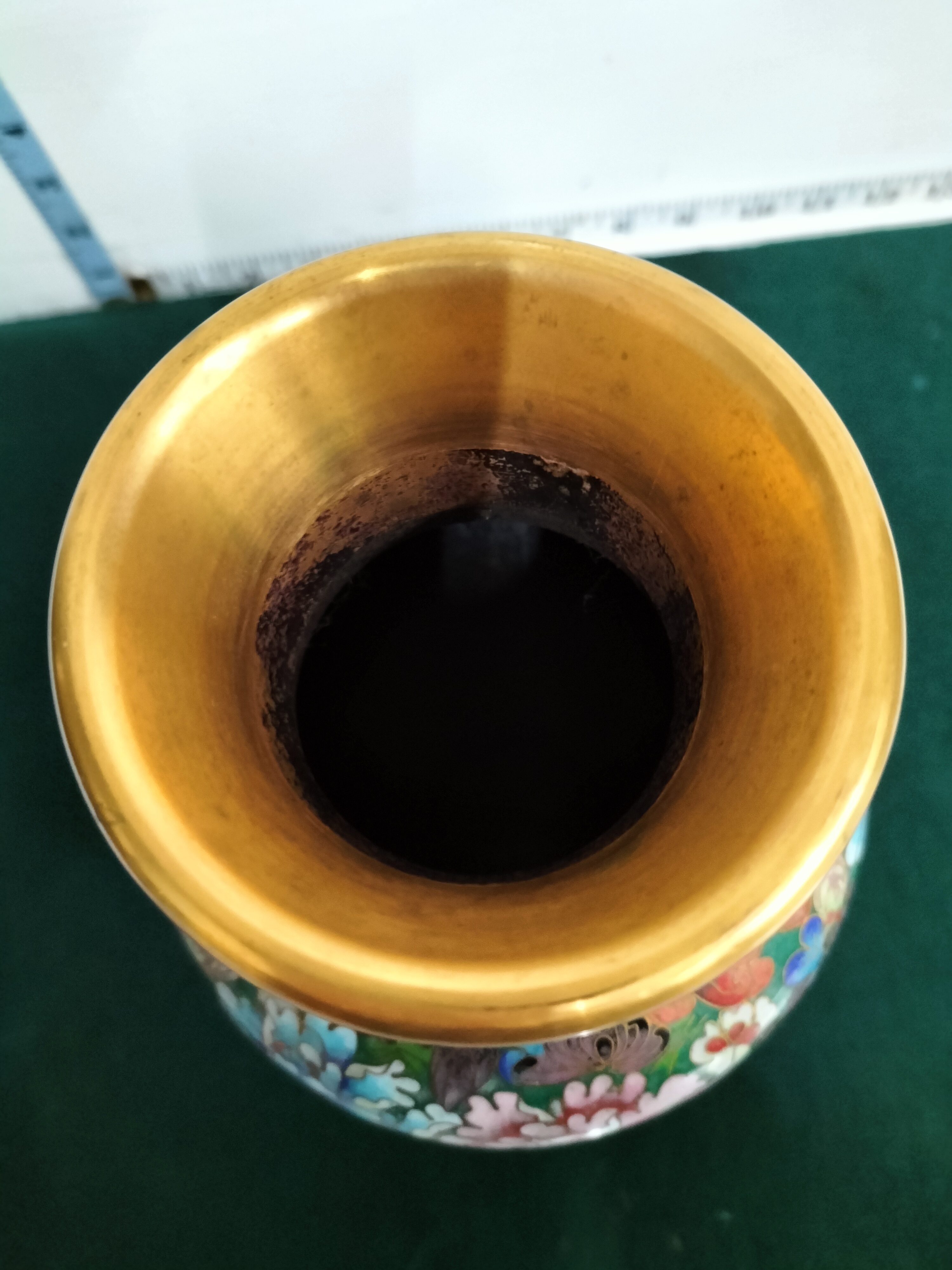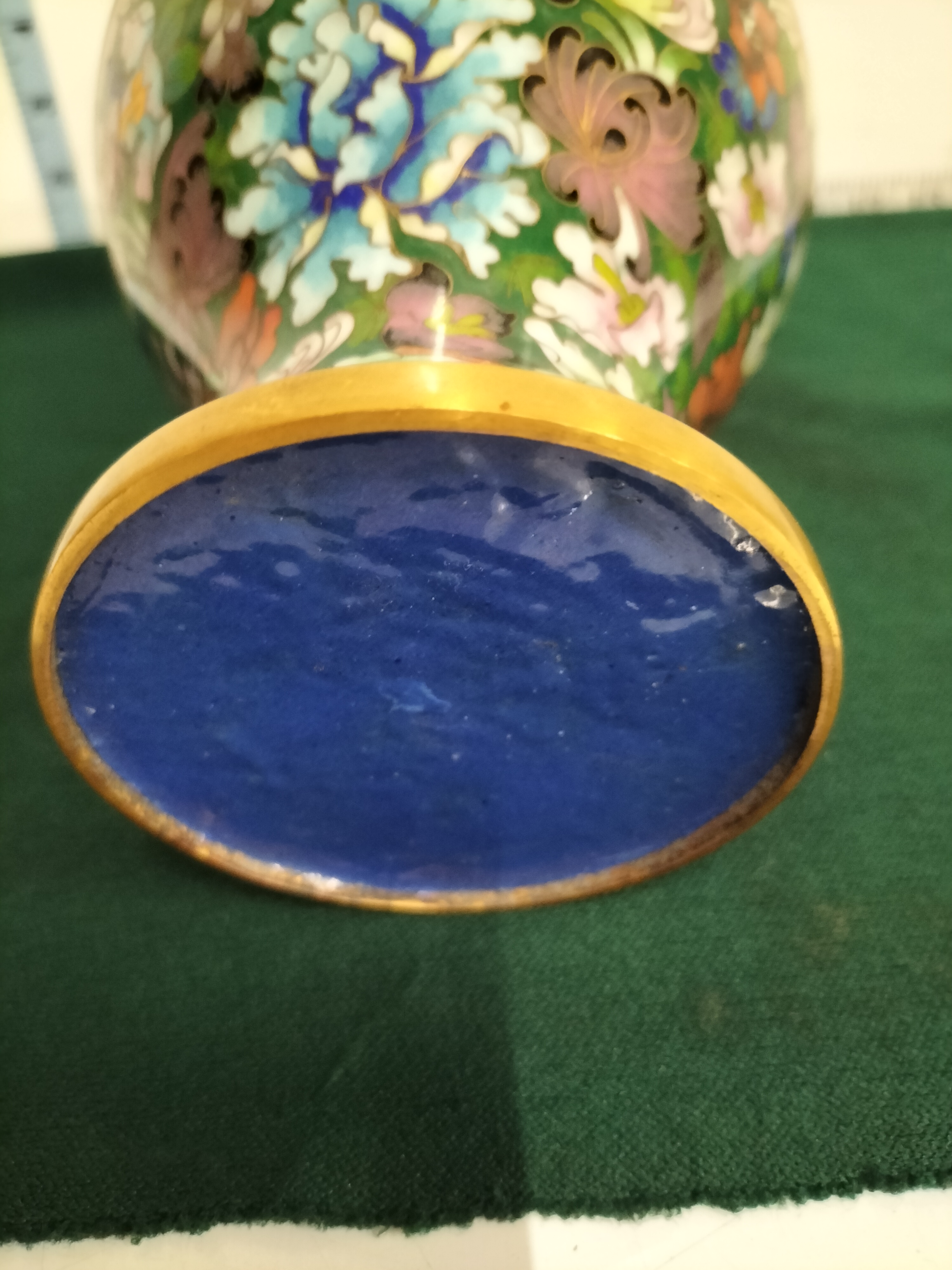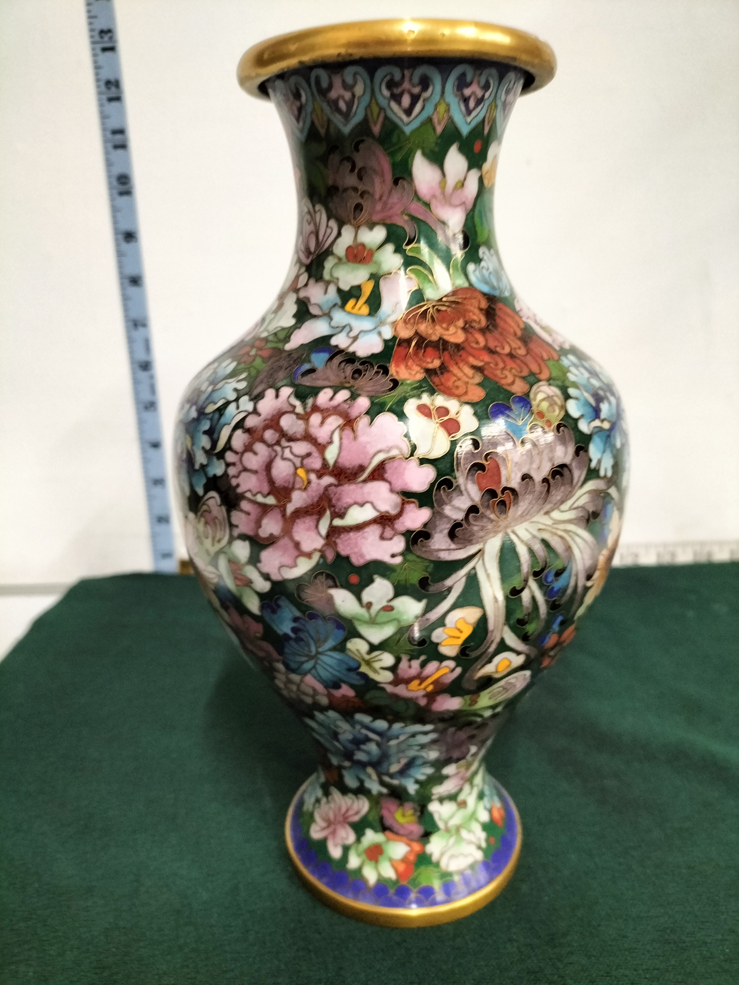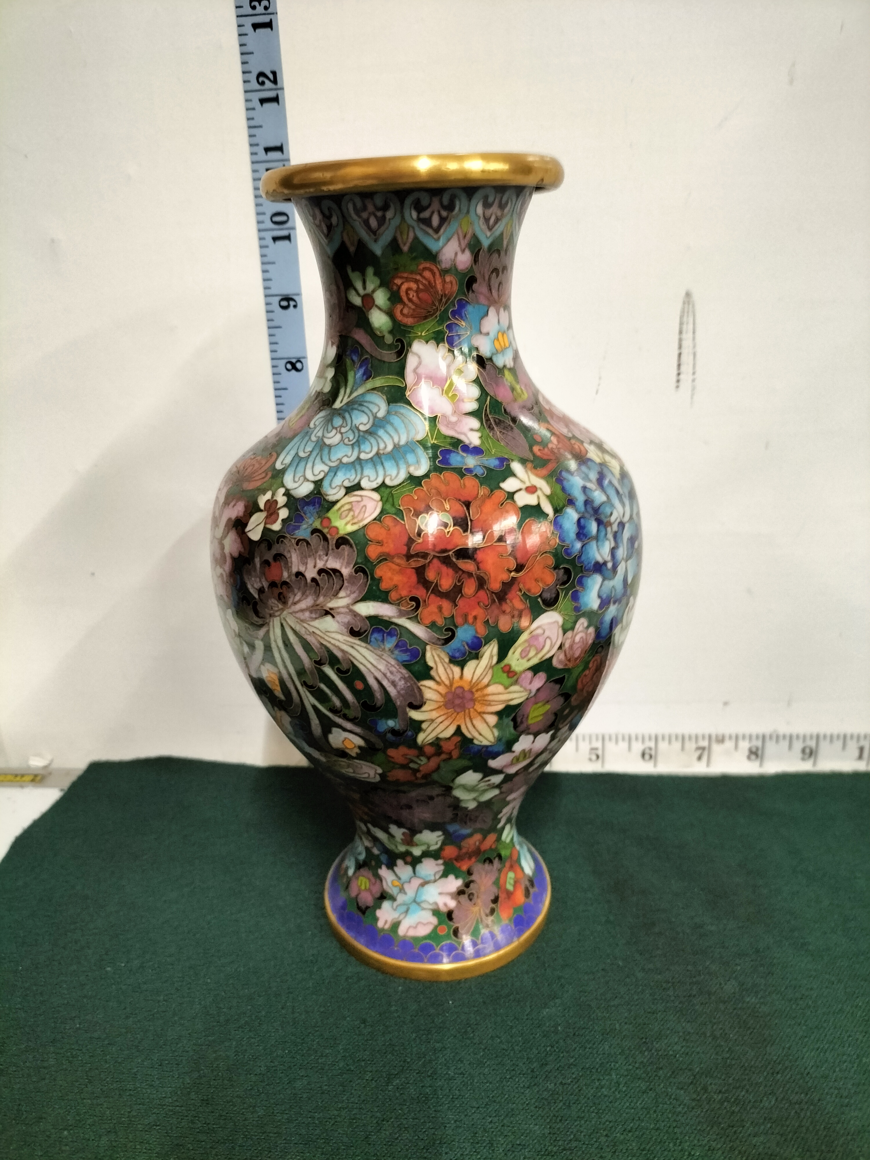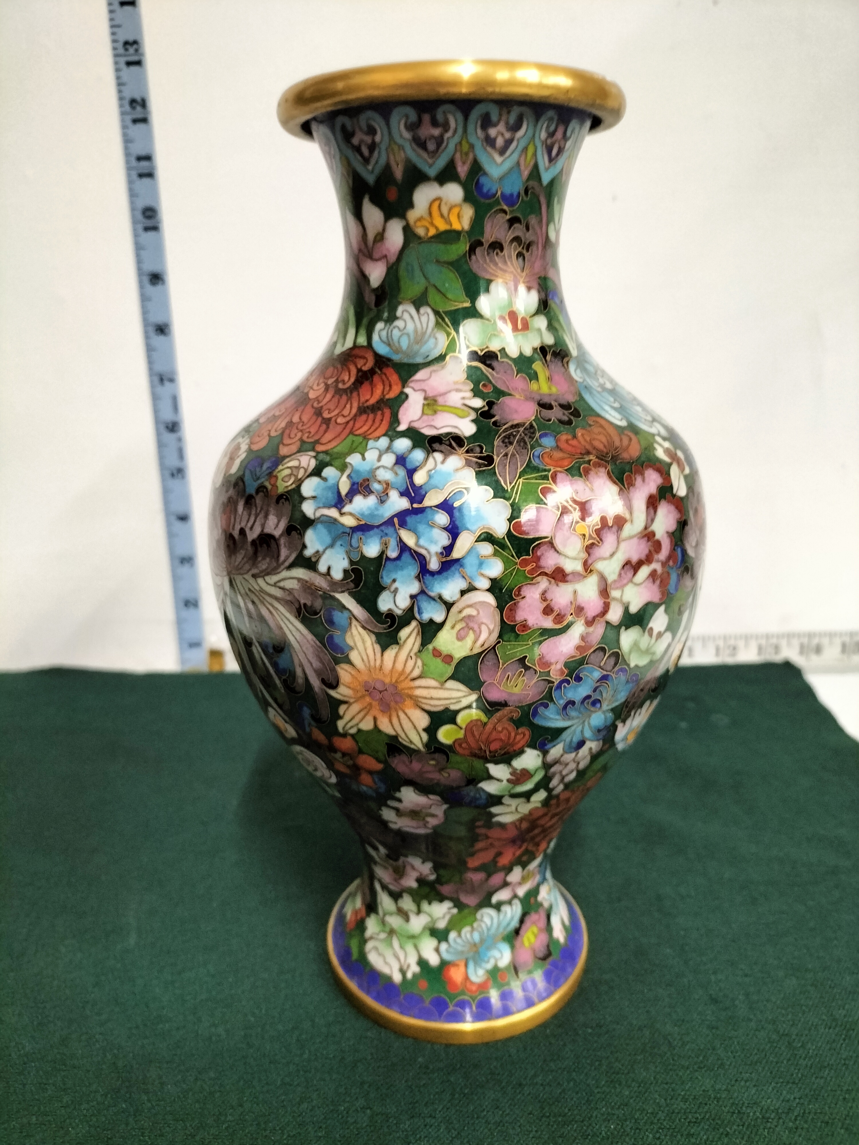A Chinese cloisonne vase featuring a multi-coloured floral design on a green background with gold-toned trim and a blue enamelled base, measuring approximately 13 inches in height.