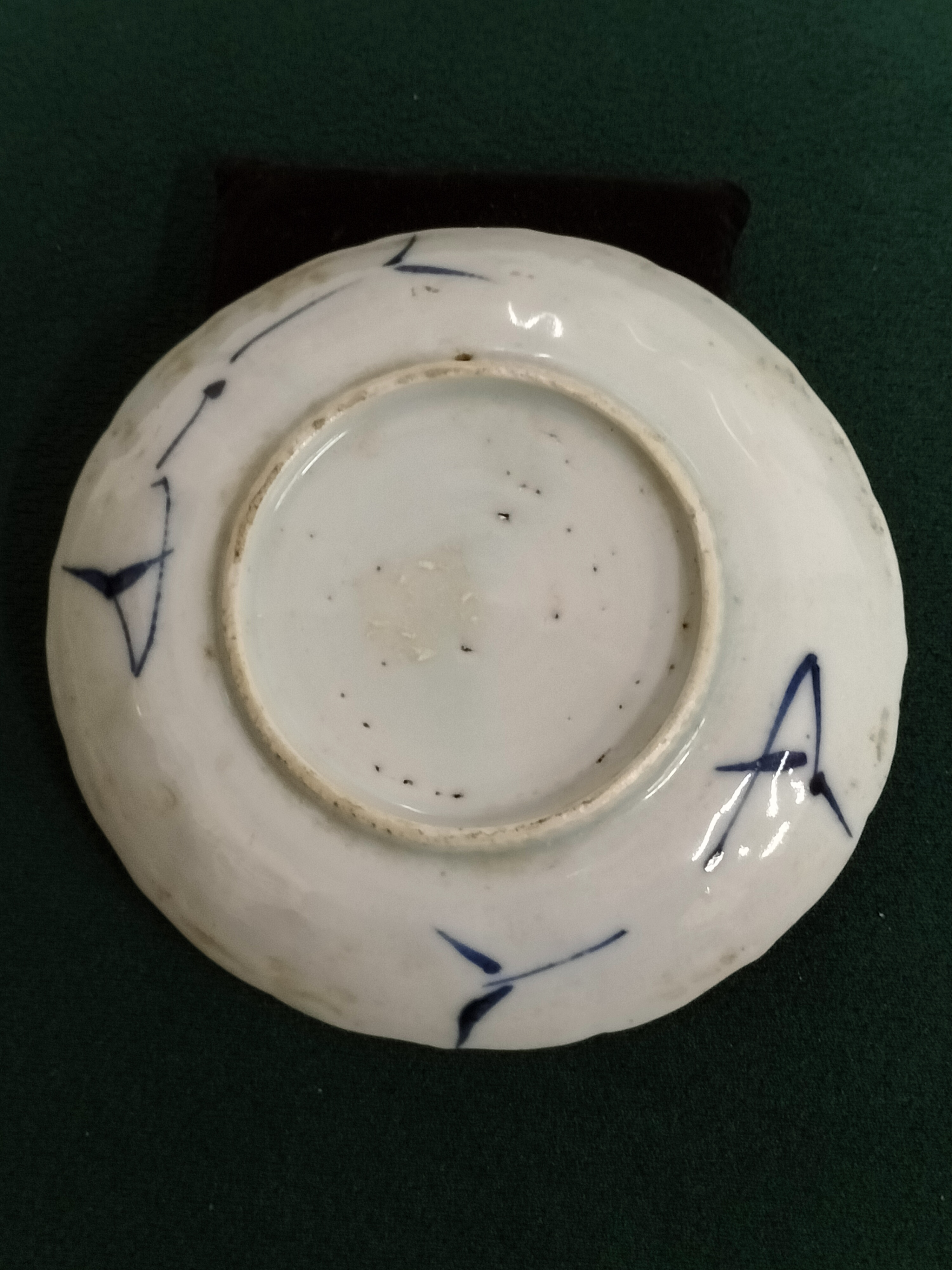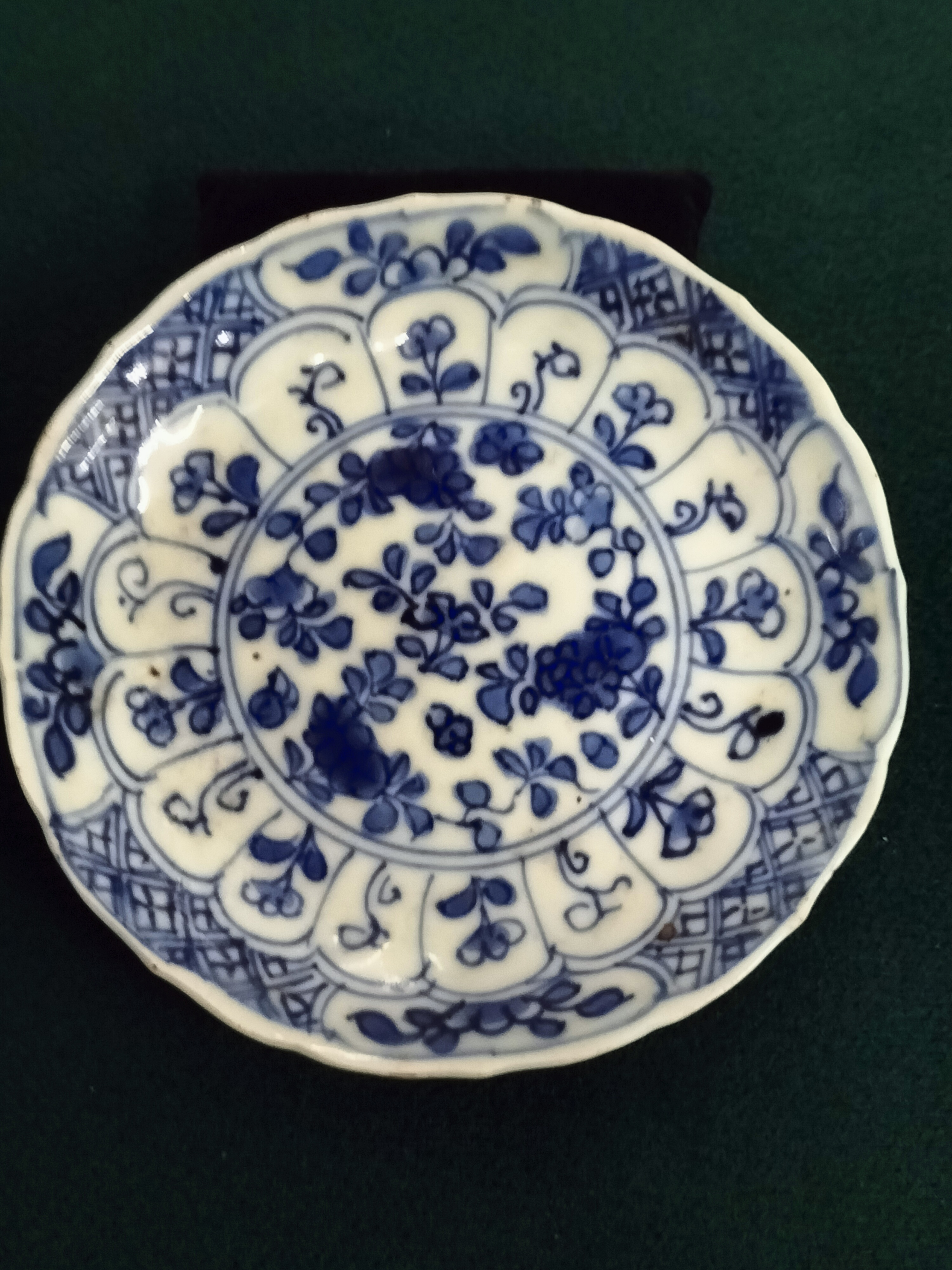 A blue and white ceramic saucer featuring a central floral spray within a lobed border of flowers and geometric lattice designs, with abstract markings to the reverse.