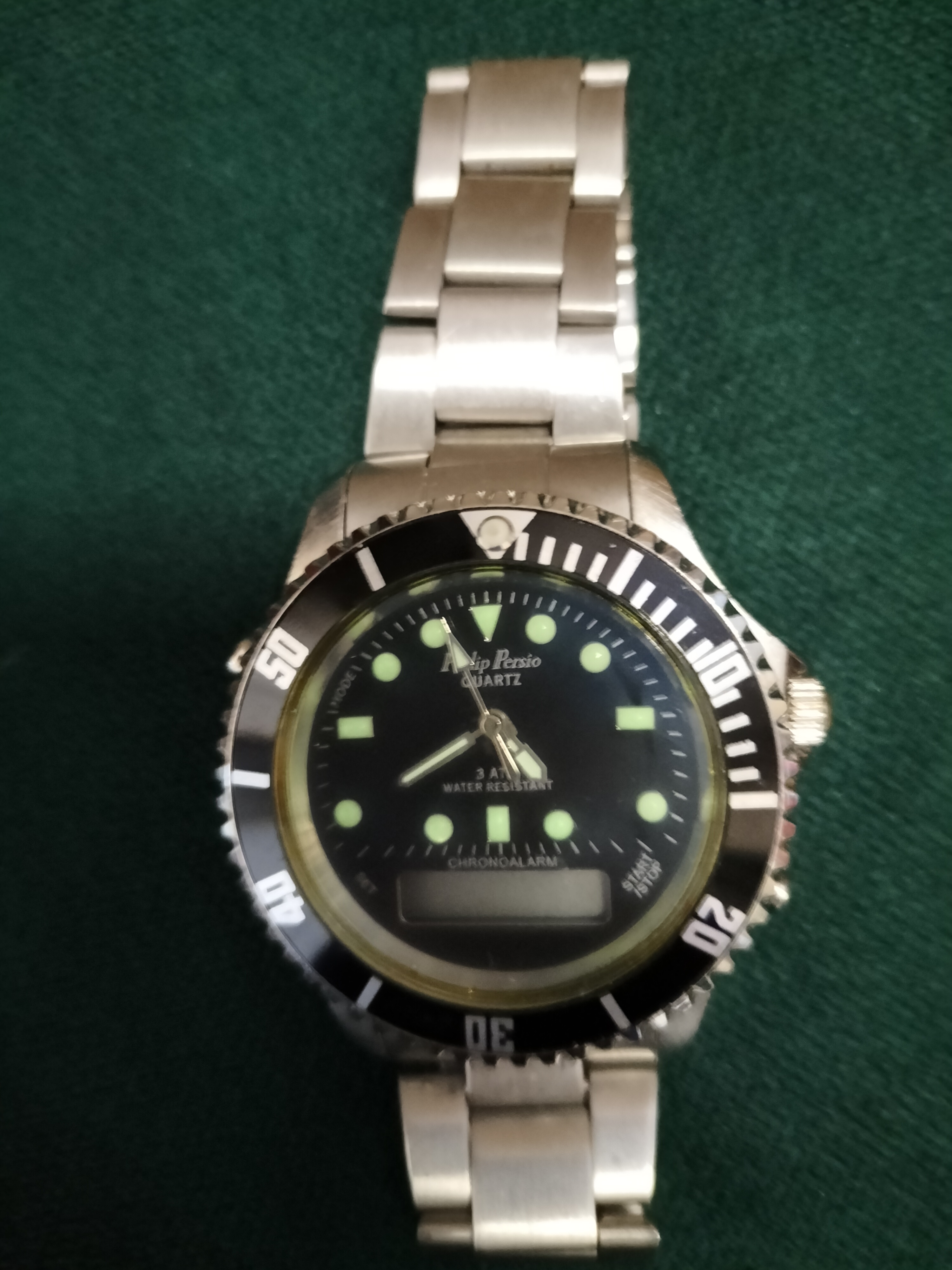 A Philip Persio analog-digital quartz wristwatch featuring a silver-tone metal case and bracelet with a black dial, luminous markers, and 3 ATM water resistance.