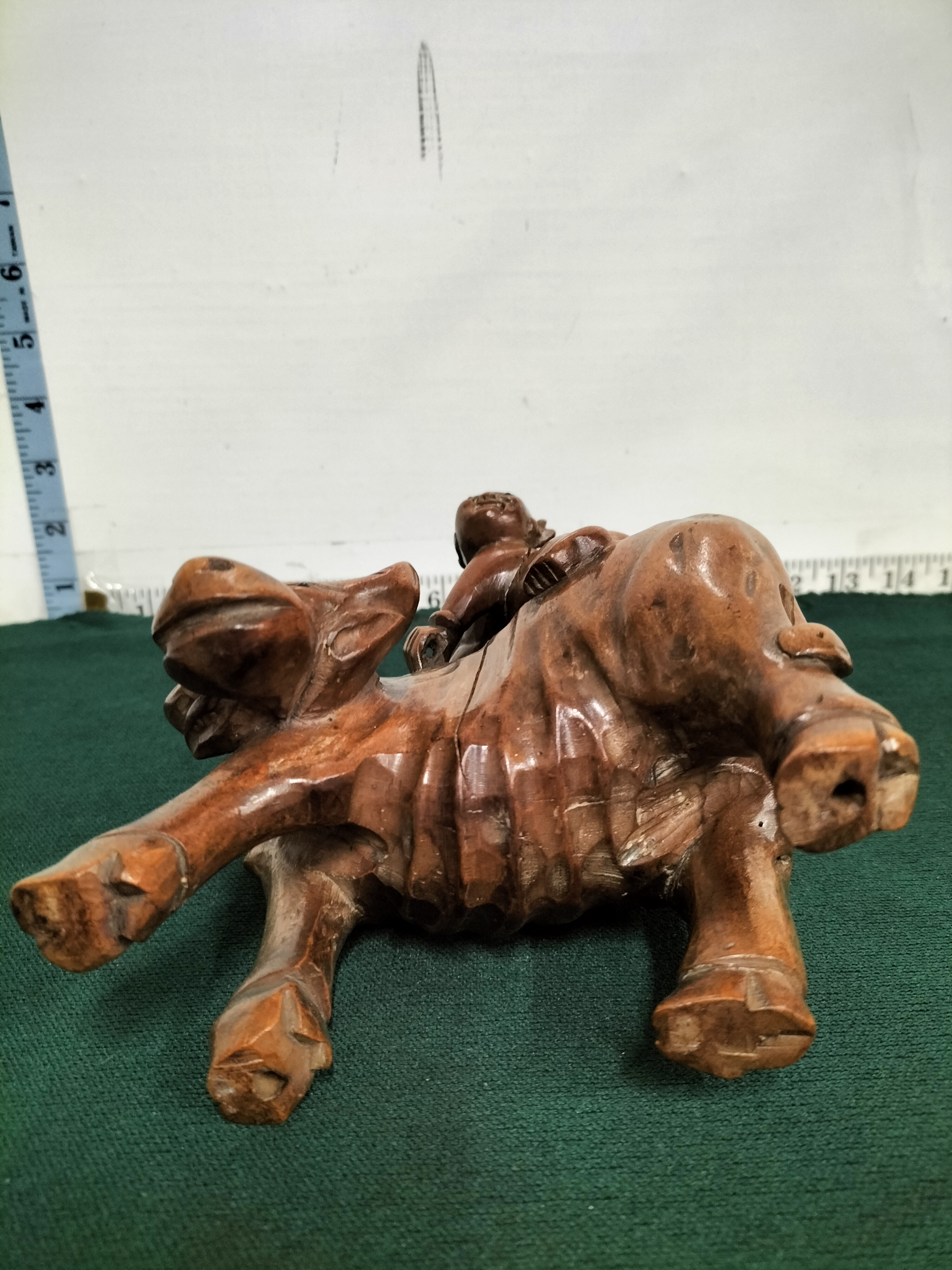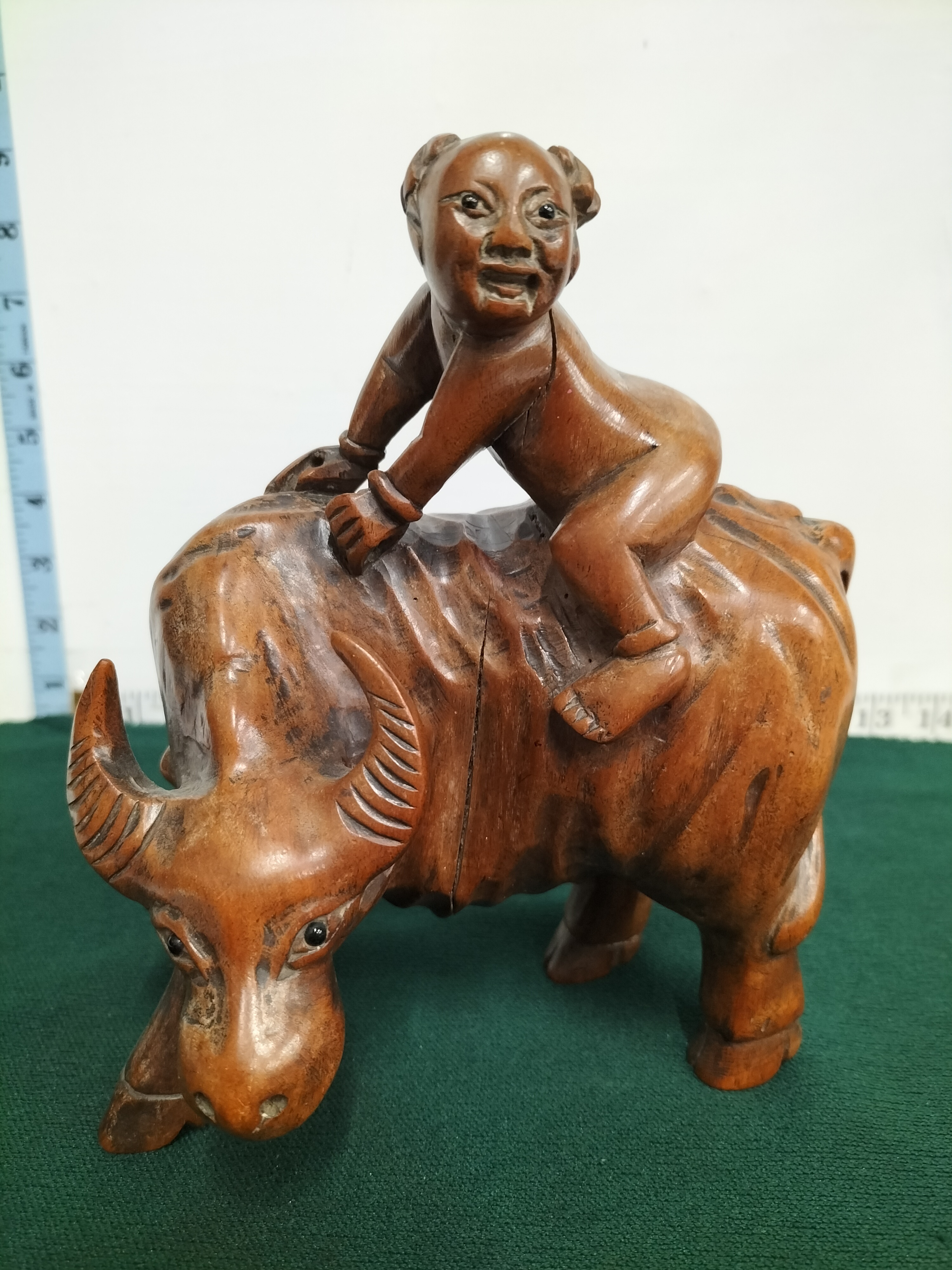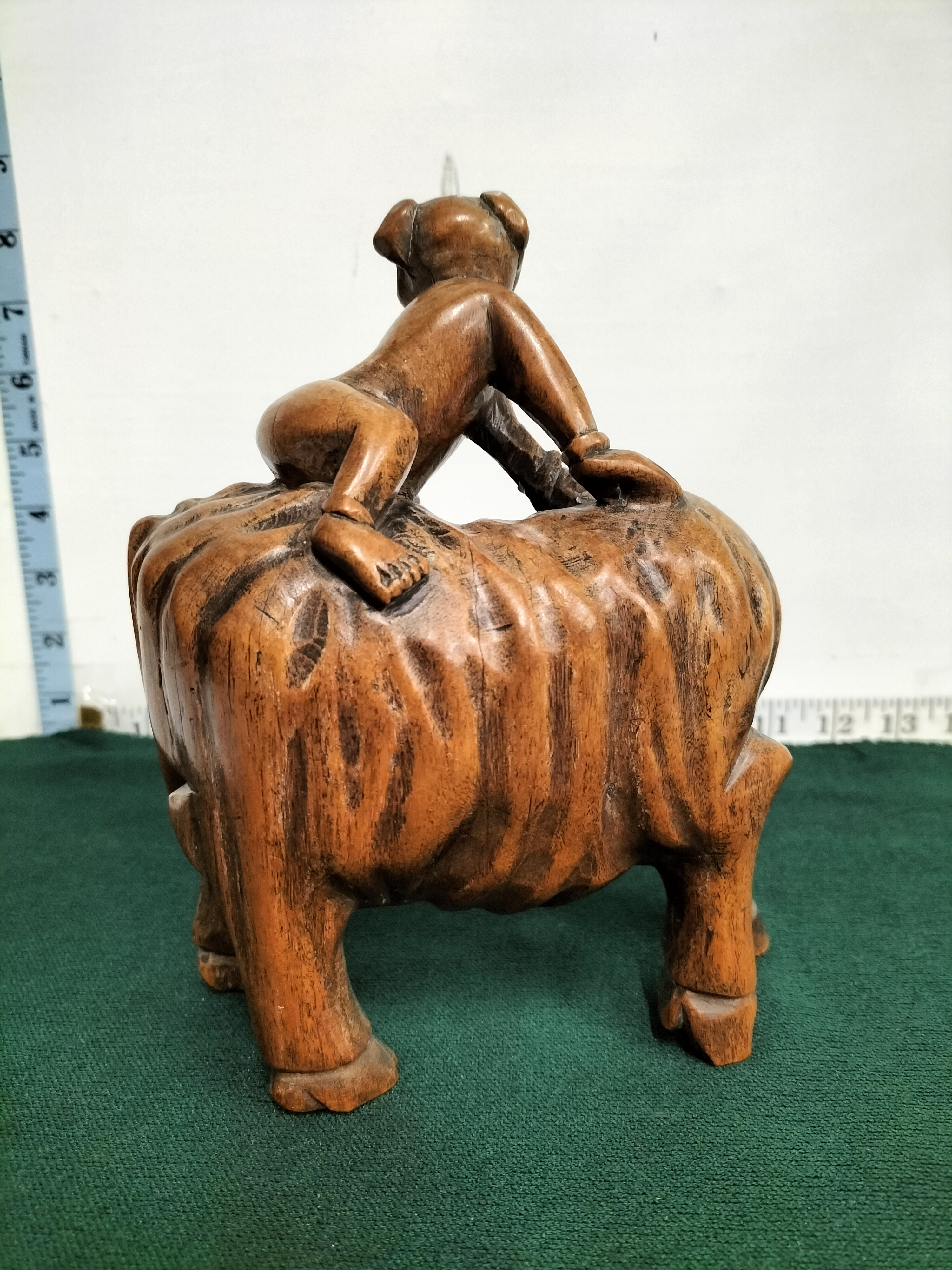 A hand-carved reddish-brown wooden sculpture depicting a child seated atop a water buffalo, measuring approximately 18cm in height.