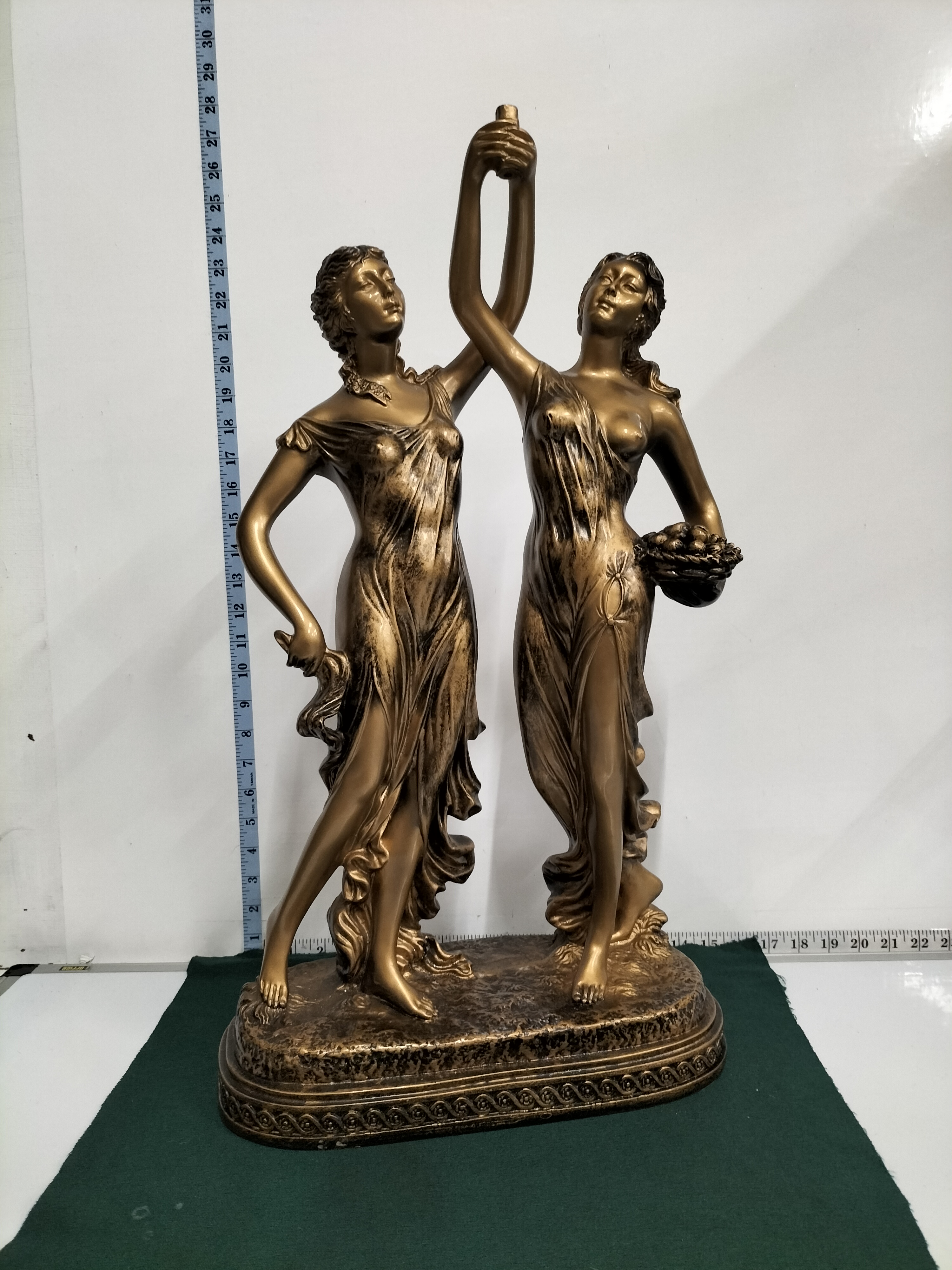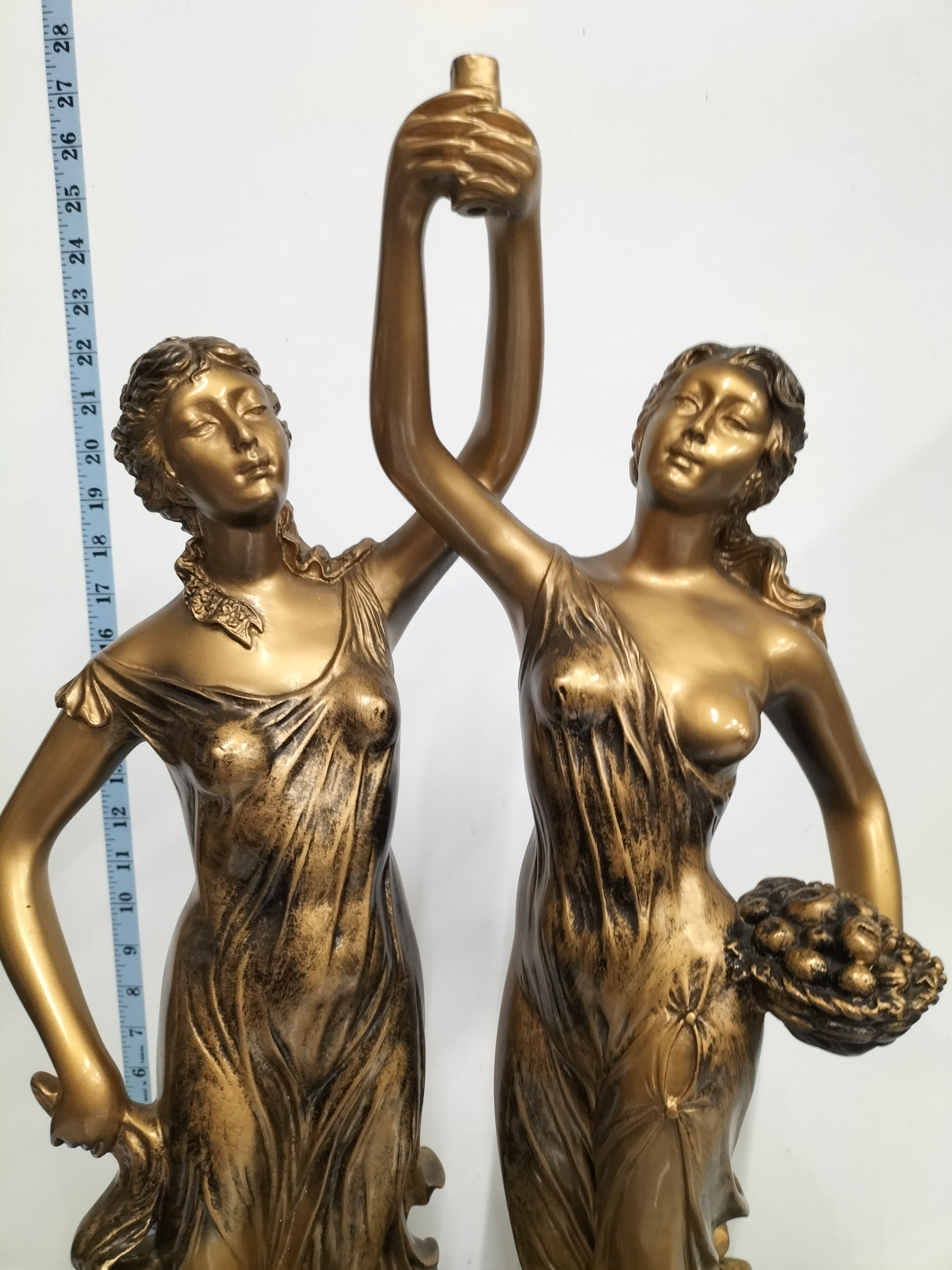 This large decorative figural sculpture depicts two female figures in classical-style flowing drapery. The composition features the figures with their inner arms raised and joined at a central point, which terminates in a small socket. One figure is depicted carrying a basket of fruit. The piece is crafted from a cast material with a patinated gold and bronze-toned metallic finish. The sculpture is set upon an oval base adorned with a moulded repeating scroll-pattern border. The styling exhibits a Neo-Classical influence. No maker’s marks or signatures are visible.