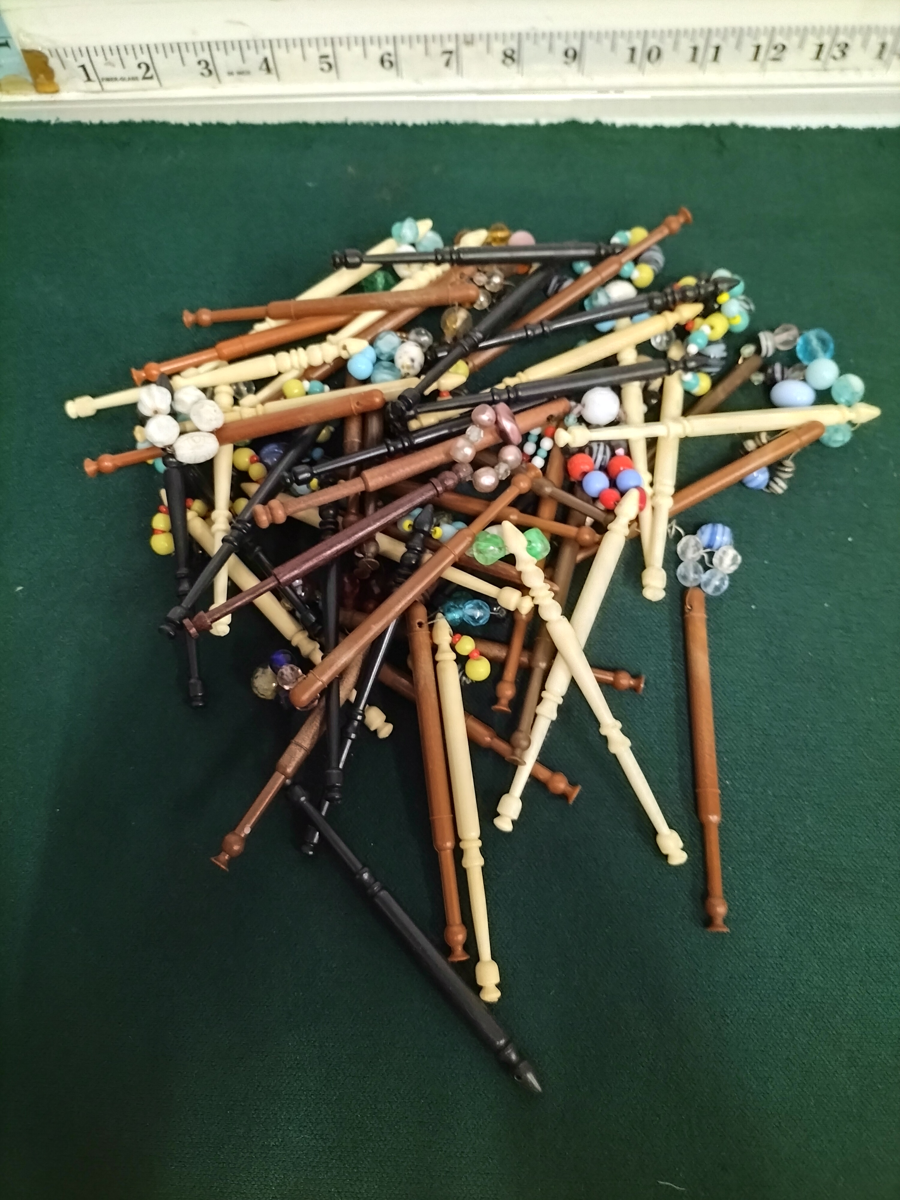 A collection of wood and plastic lacemaking bobbins in various shades, many featuring multicoloured beaded spangles, measuring approximately 4 to 5 inches in length.