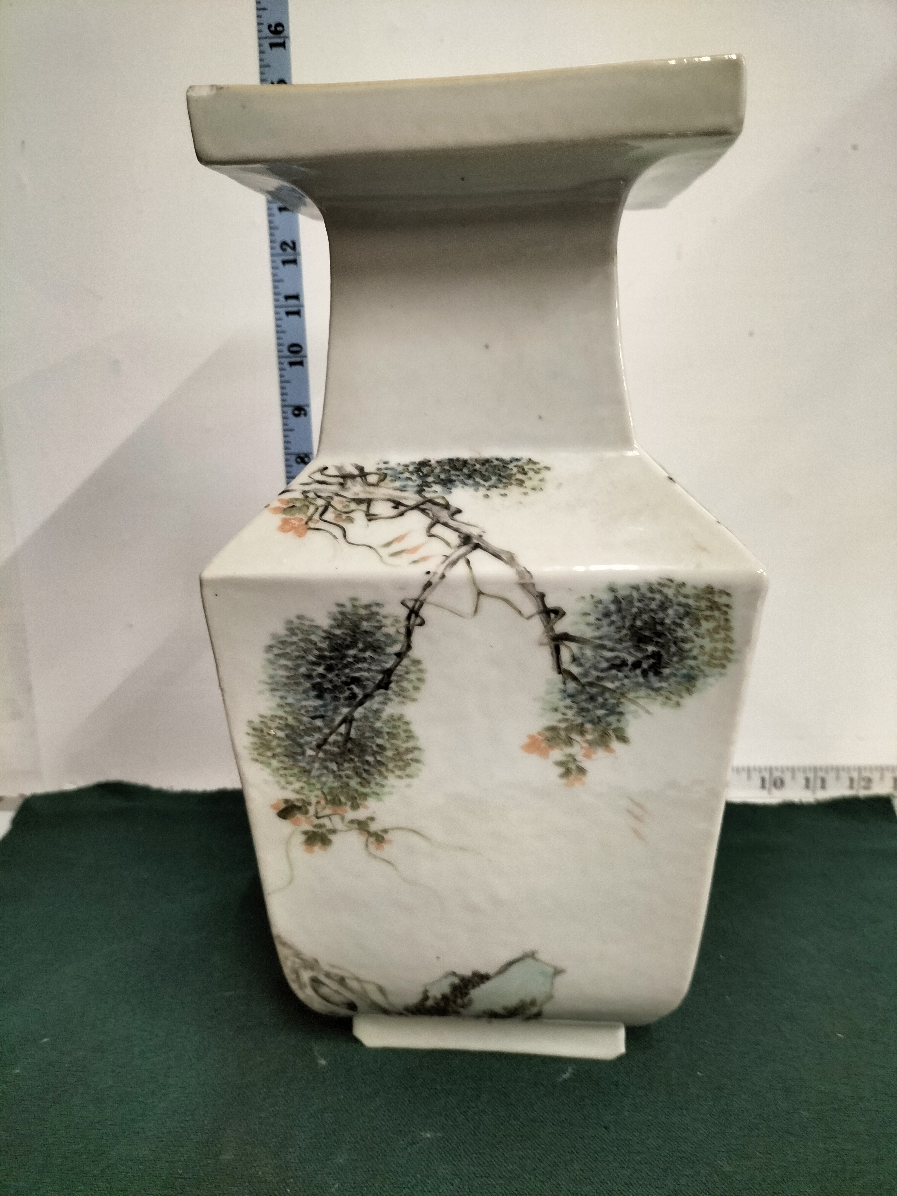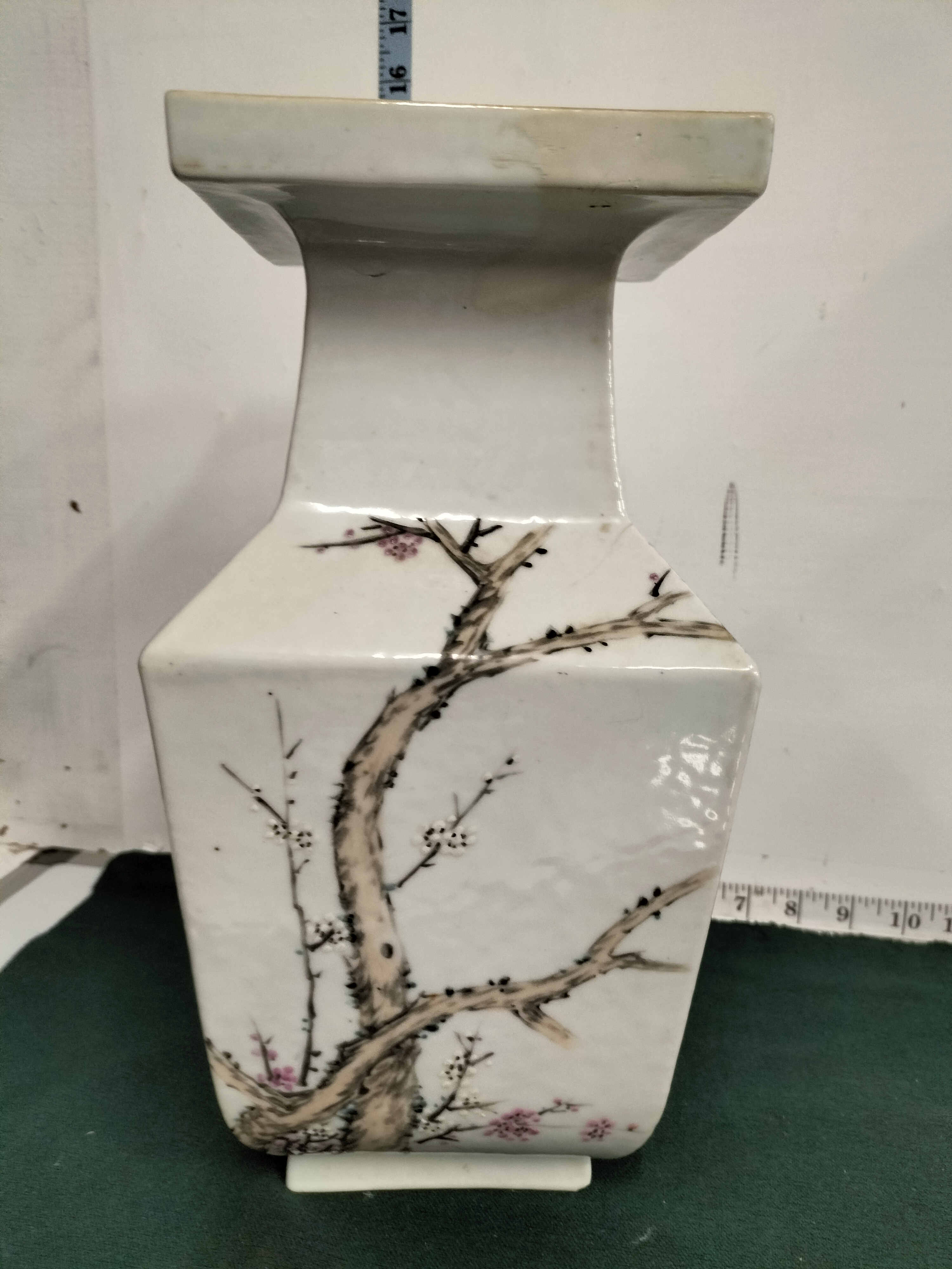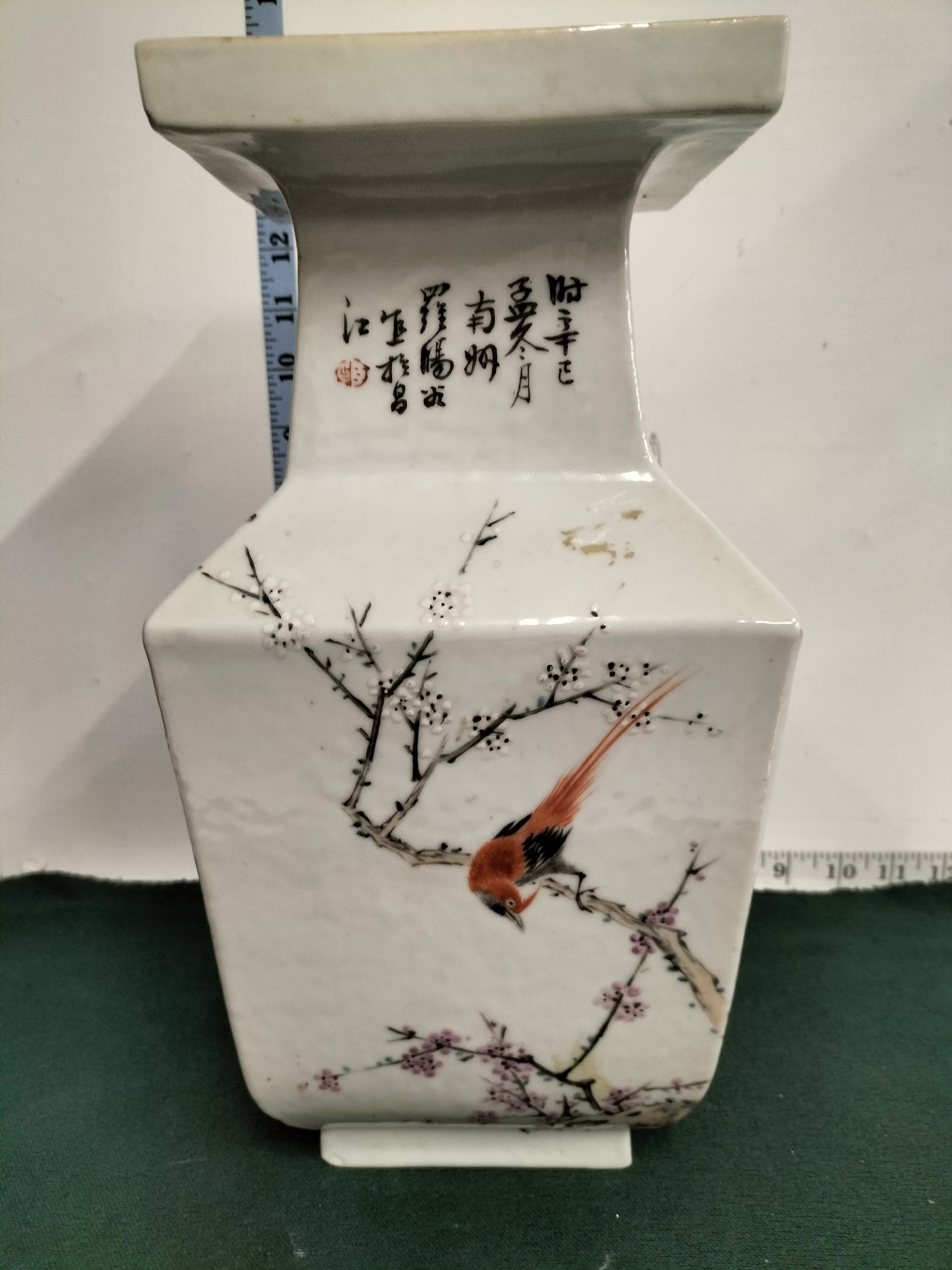 A Chinese porcelain vase Circa 1830’s of square form featuring a tapered body rising to a wide, flat rim. The exterior is decorated in polychrome enamels with various bird and flower motifs across the four sides. One face depicts a black bird perched on a gnarled tree trunk, while another shows a long-tailed paradise flycatcher amongst flowering plum branches. Additional sides feature pine boughs and floral studies. The neck is inscribed on one side with archaic-style Chinese characters in red enamel, which translate as May there be auspicious celebrations and harmony. The opposite side of the neck displays black calligraphy including a cyclical date for the Xinsi year and a red seal mark. The underside is undecorated with a recessed base.