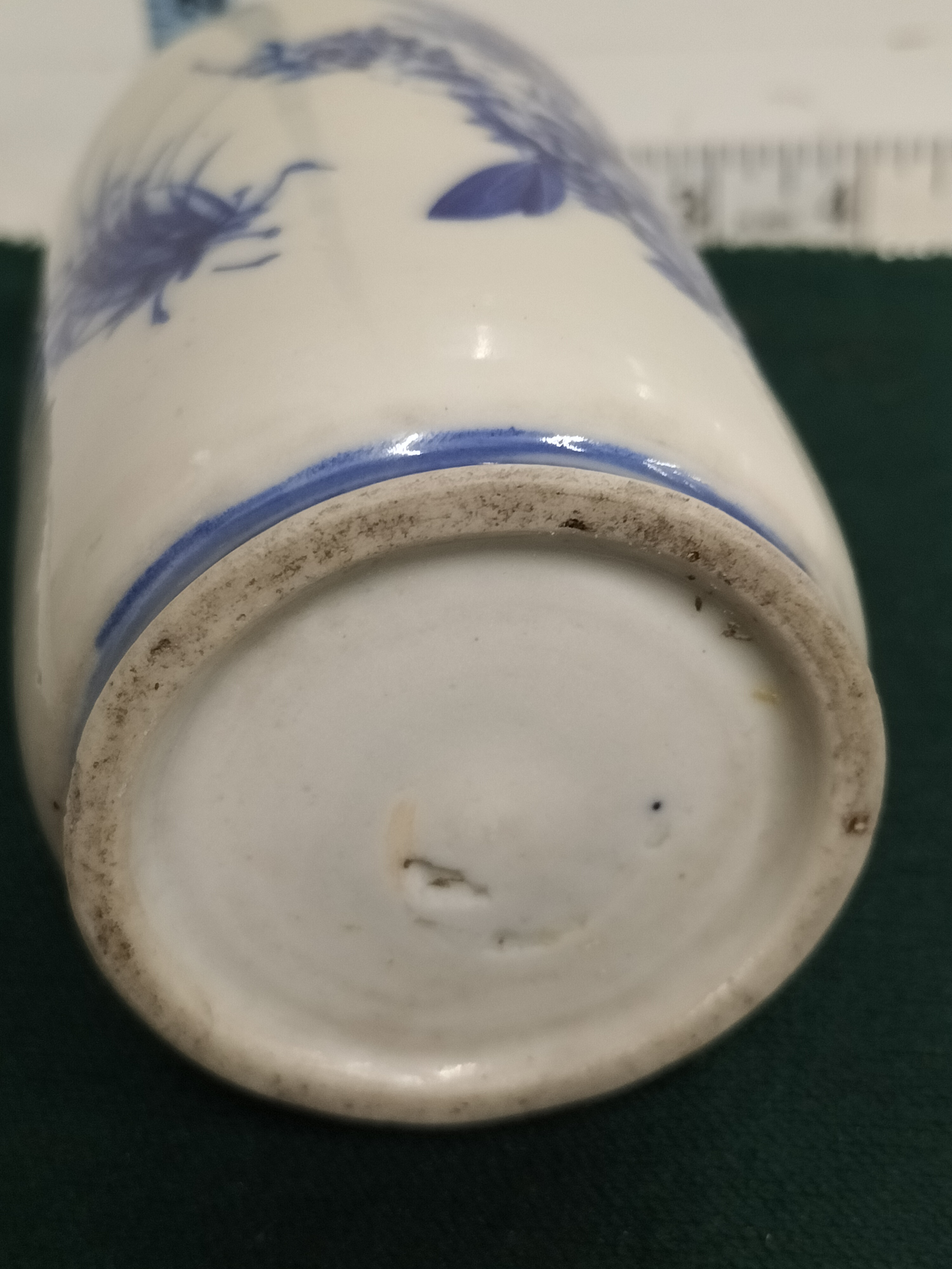 The porcelain body is in good condition with minor surface wear and small firing imperfections visible on the unglazed foot rim and glazed base. The metal cap exhibits significant oxidation and tarnish.