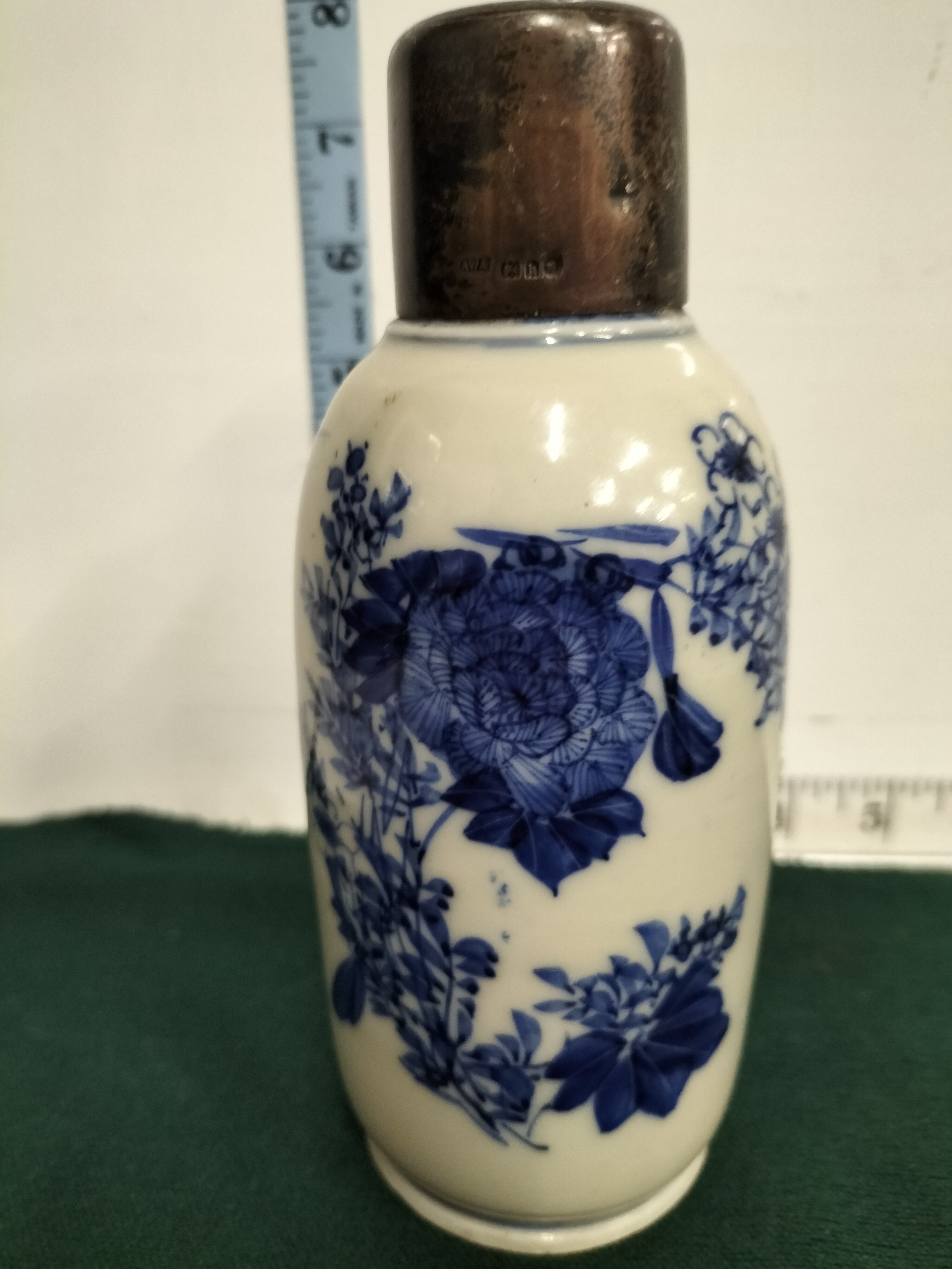 A porcelain bottle of cylindrical form decorated in underglaze blue with peony blossoms and foliate branches in the Chinoiserie style. The vessel is fitted with a dome-shaped, silver-toned metal cap. The cap displays several hallmarks, including the maker’s mark AWA. The porcelain body features a glazed base and an unglazed foot rim.