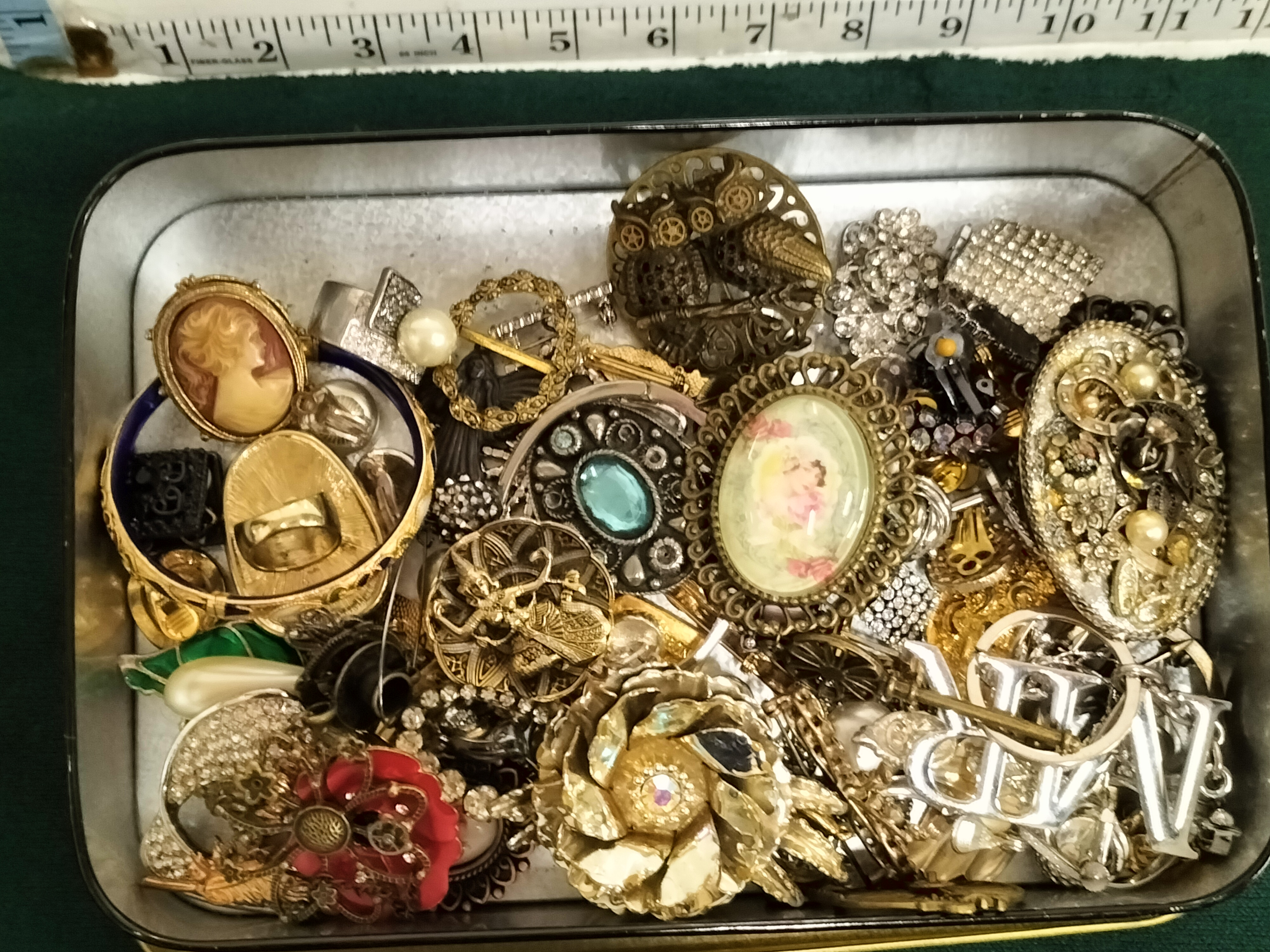A collection of assorted costume jewellery in gold, silver, and bronze tones, featuring various brooches, rings, and decorative pins with floral, cameo, and rhinestone designs, with the container measuring approximately 22cm in width.