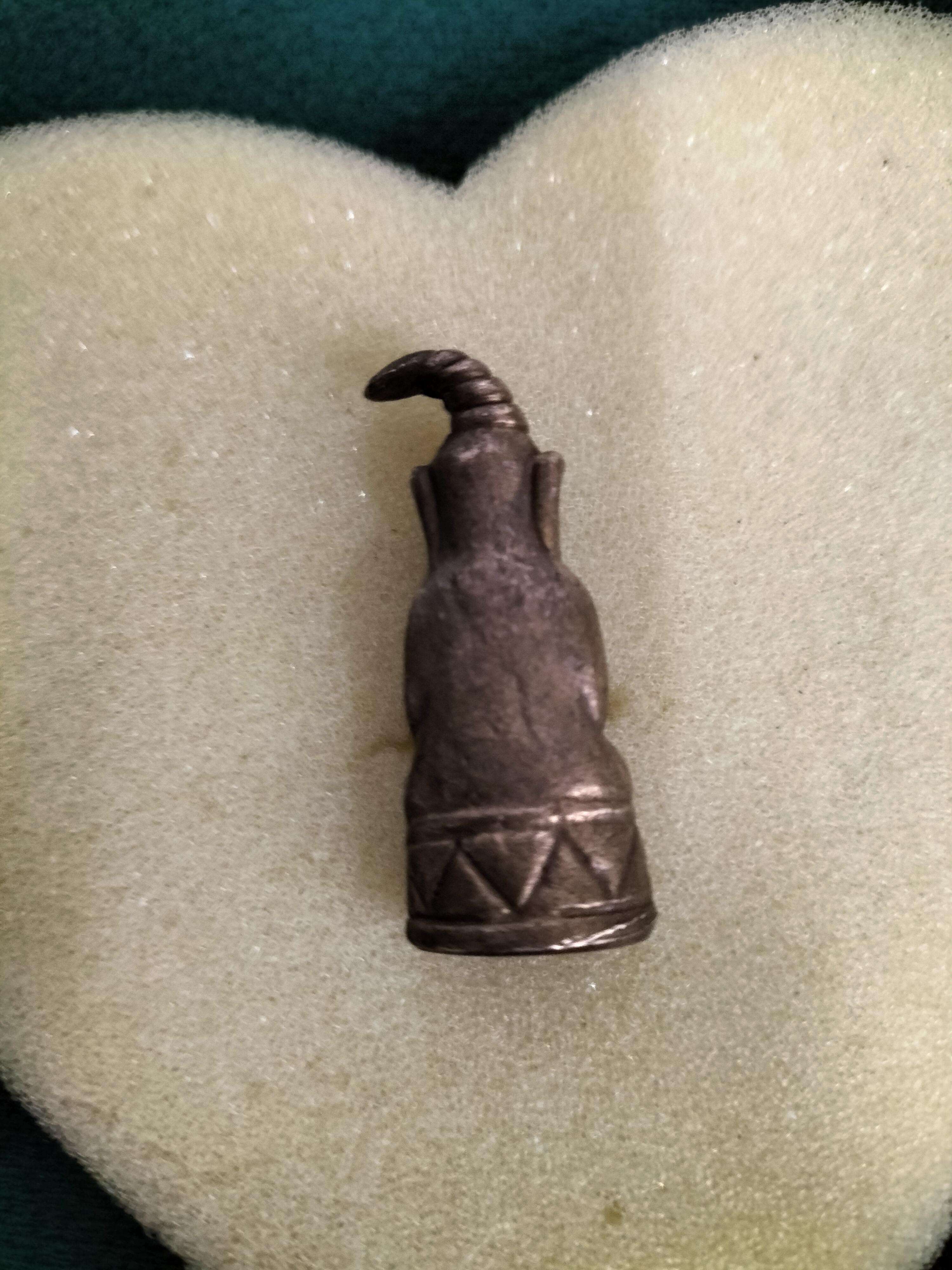 A dark bronze-coloured figurine of a seated figure signed featuring a curved headdress and a circular mark to the base.