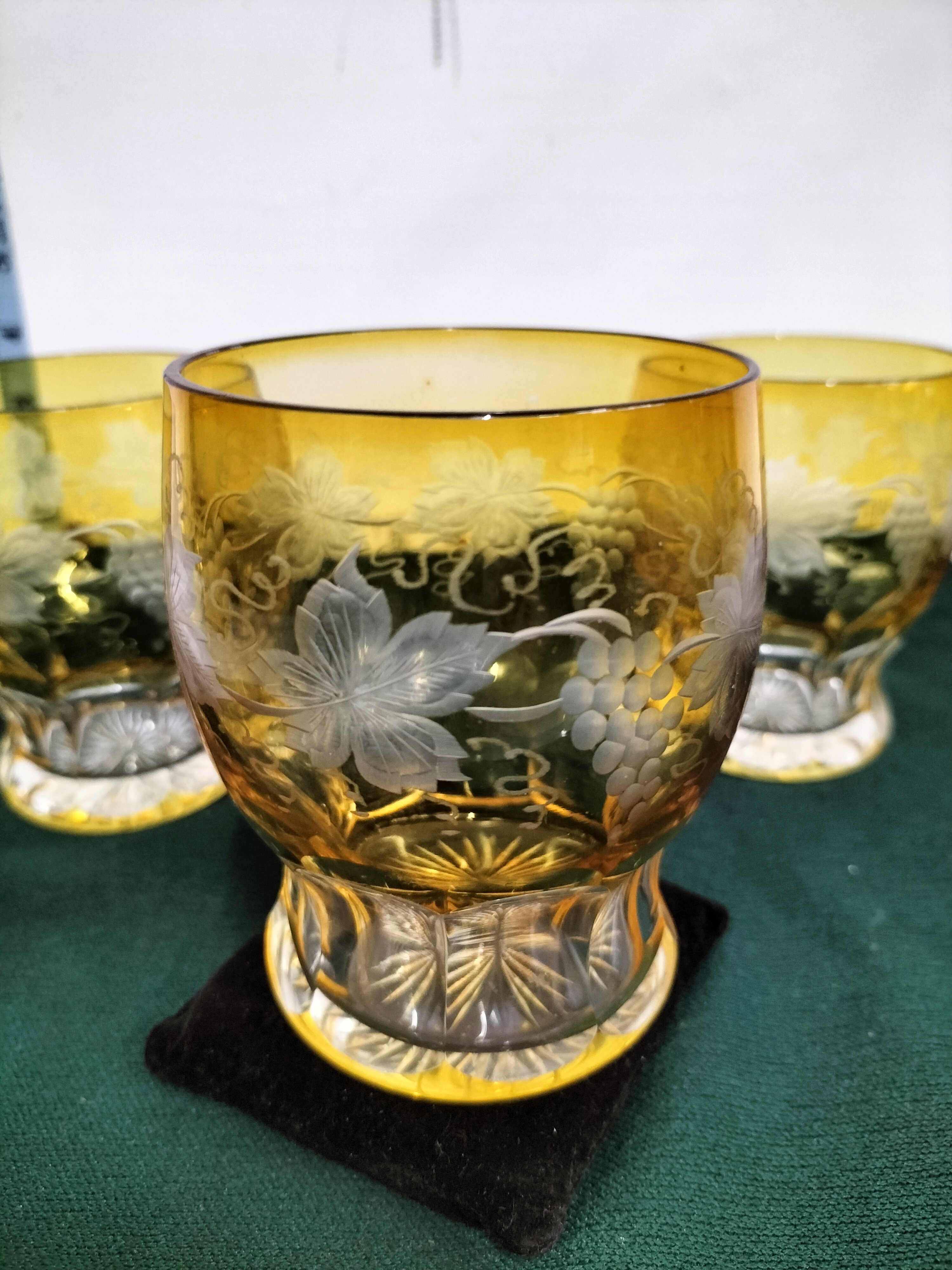 A trio of Bohemiun moser amber-coloured glass tumblers decorated with frosted etched grapevine and leaf patterns and finished with cut-glass starburst bases, each measuring approximately 9cm in height.