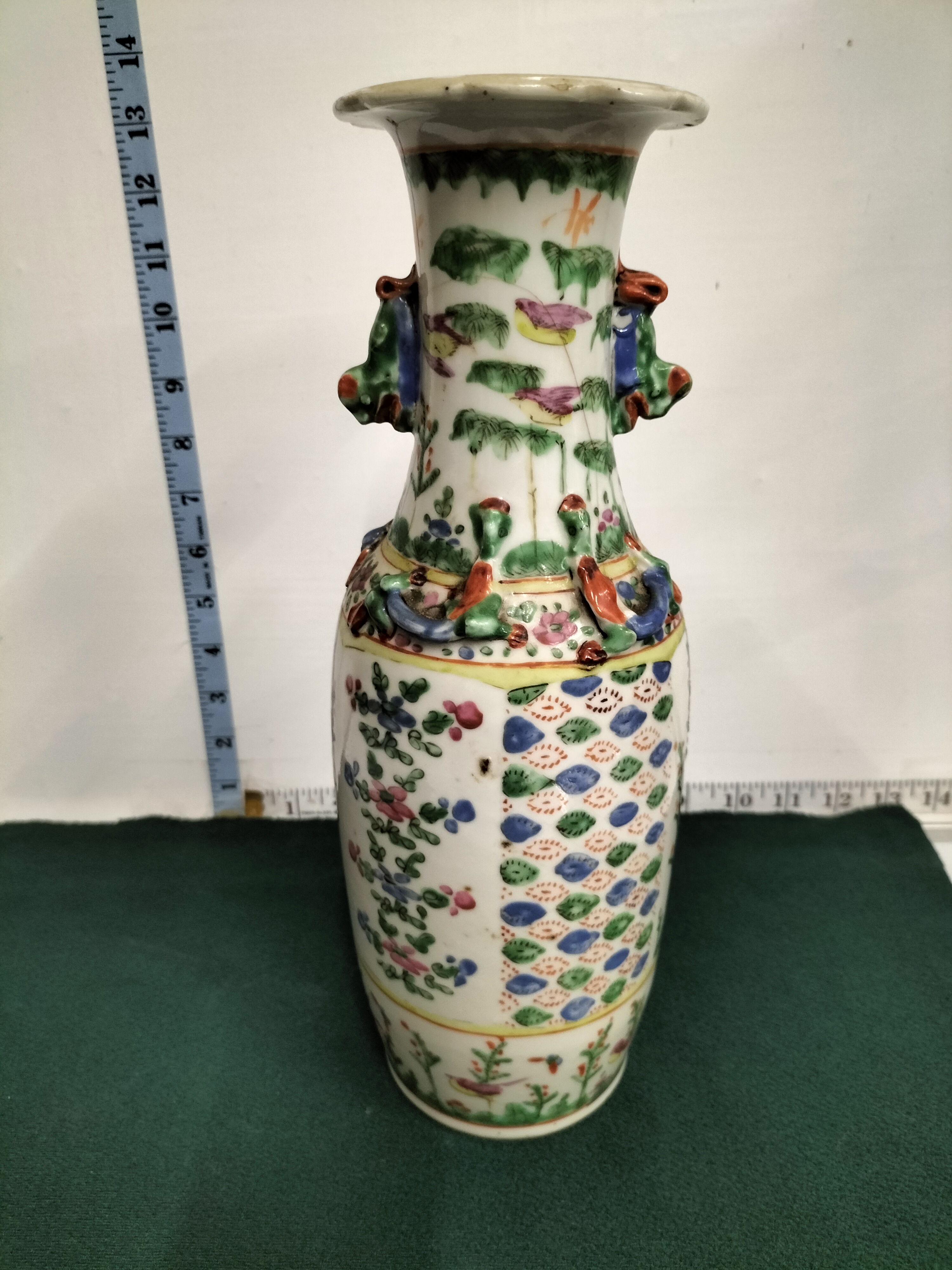 A white porcelain vase decorated with multicoloured hand-painted motifs of birds, fish, and flora, featuring applied handles and figures, measuring approximately 14 inches in height.