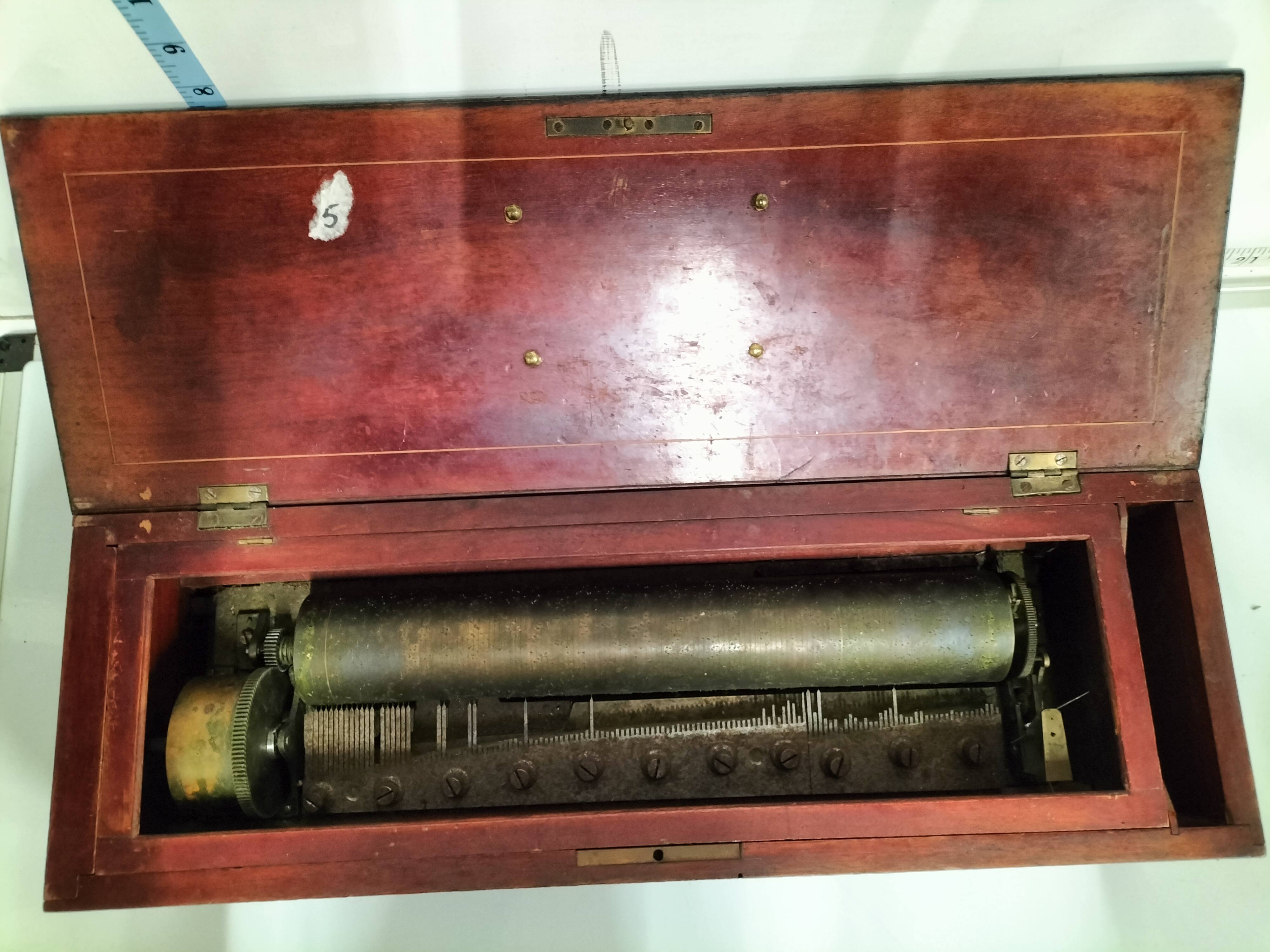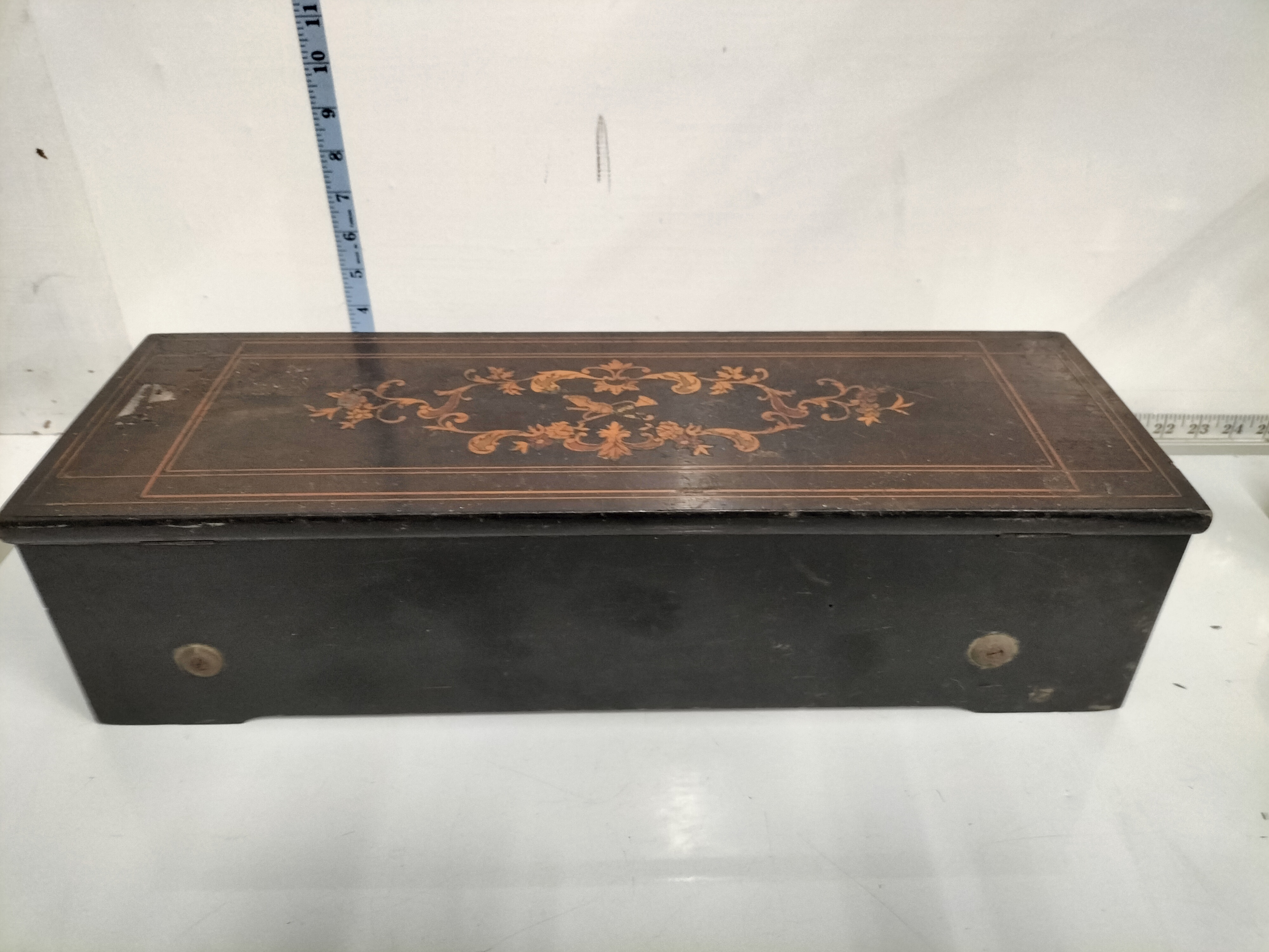 A Swiss cylinder music box housed in a dark brown inlaid wooden case with floral marquetry to the lid, measuring approximately 53cm in length.