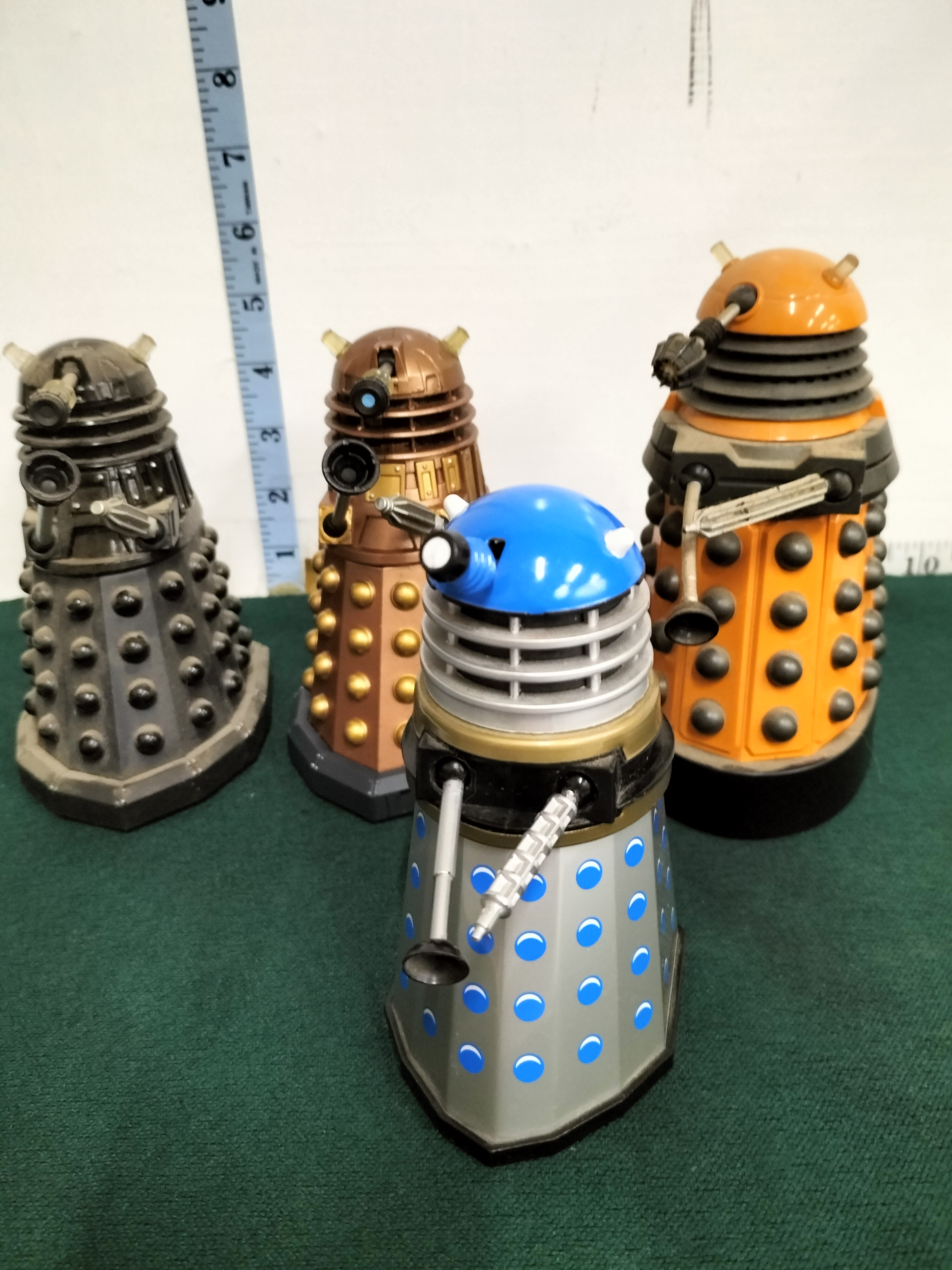 A collection of Dalek action figures in various colours including bronze, black, orange, and silver with blue accents, measuring approximately 5 to 6 inches in height.