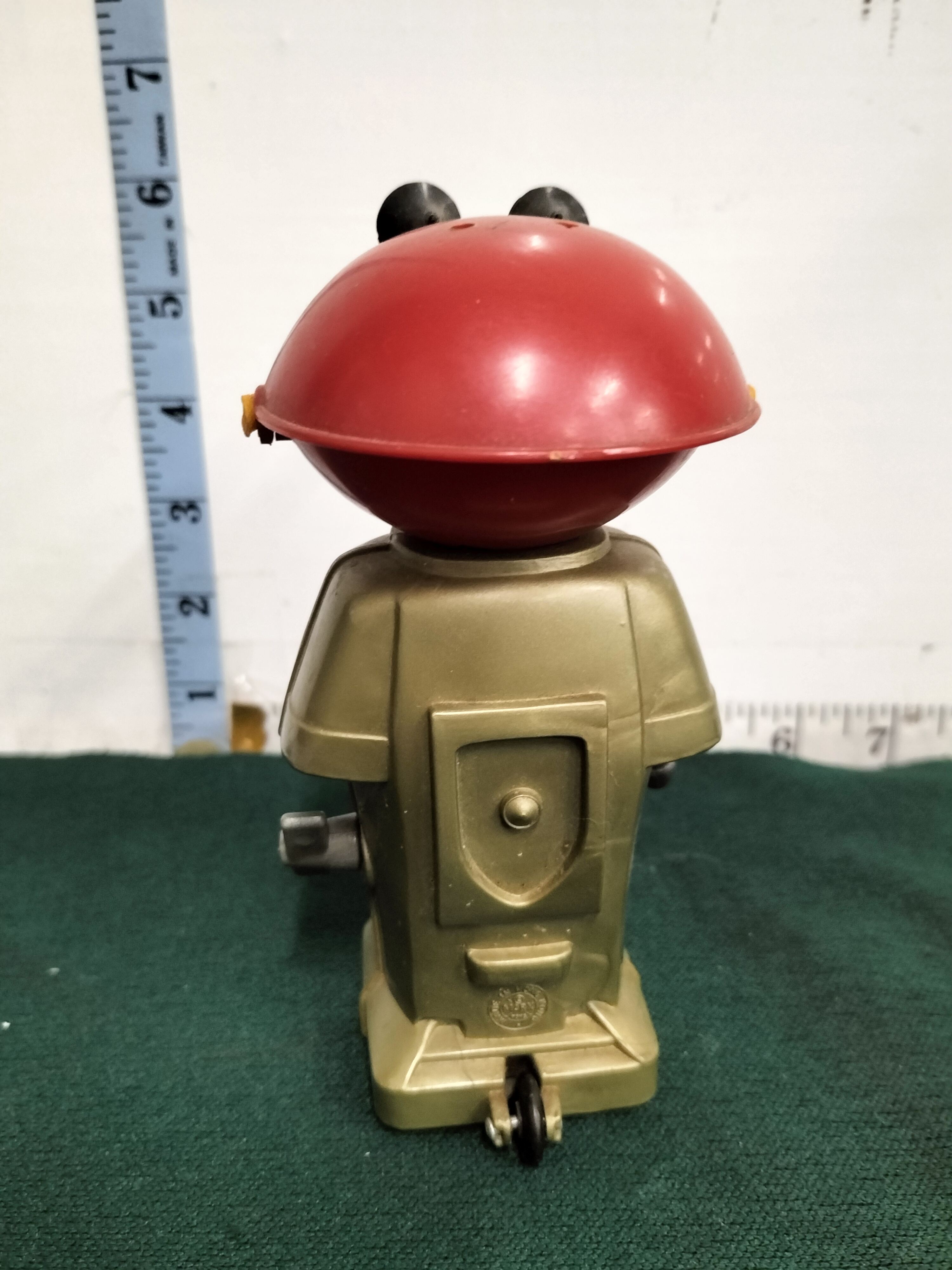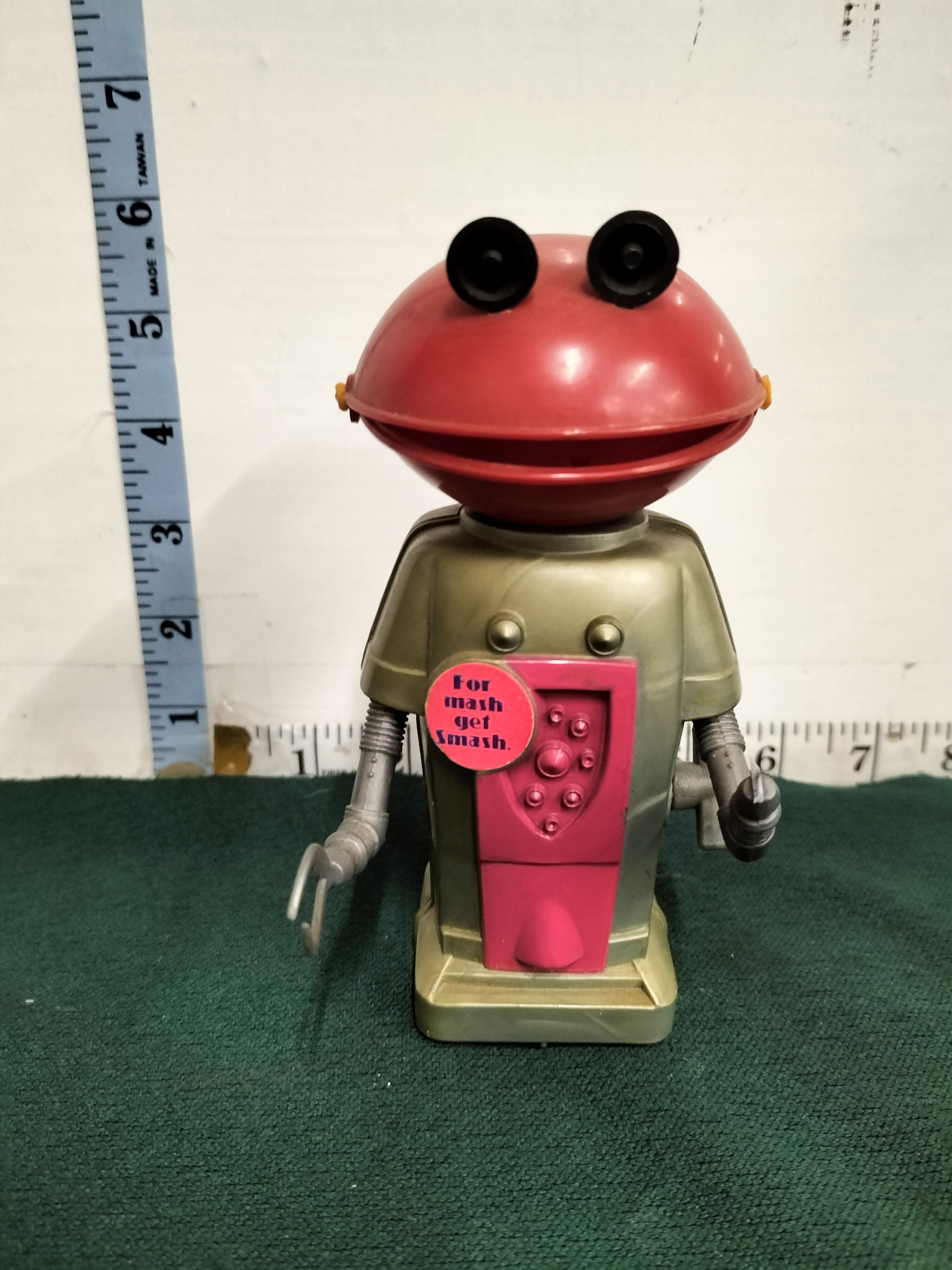 A vintage gold-coloured plastic clockwork Smash Martian robot with a red head and pink sticker, measuring approximately 6 inches in height.