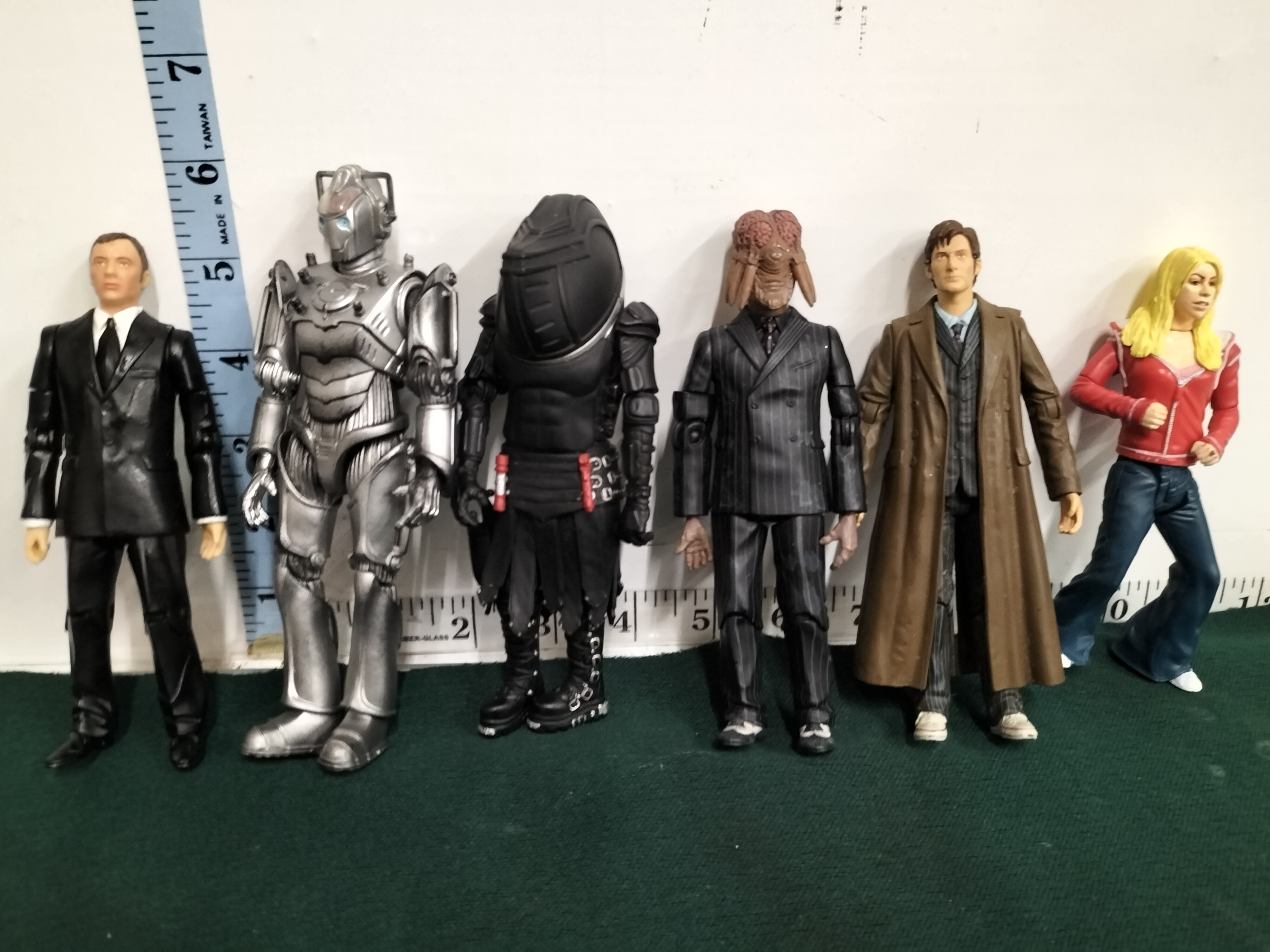 A collection of multi-coloured plastic action figures based on the Doctor Who television series, measuring approximately 5 to 6 inches in height.