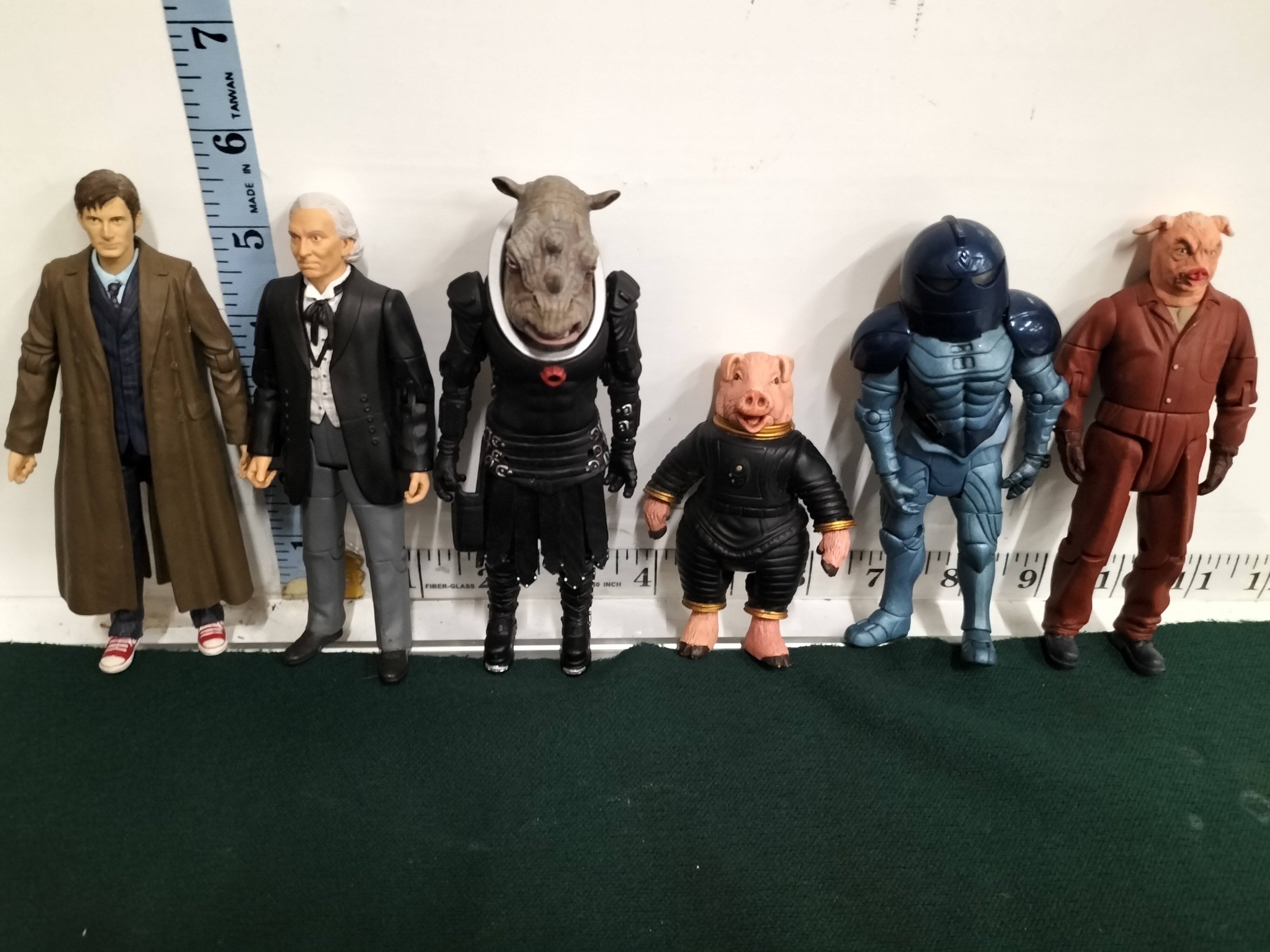 A collection of multi-coloured Doctor Who action figures depicting various characters and aliens, measuring between 4 and 6 inches in height.