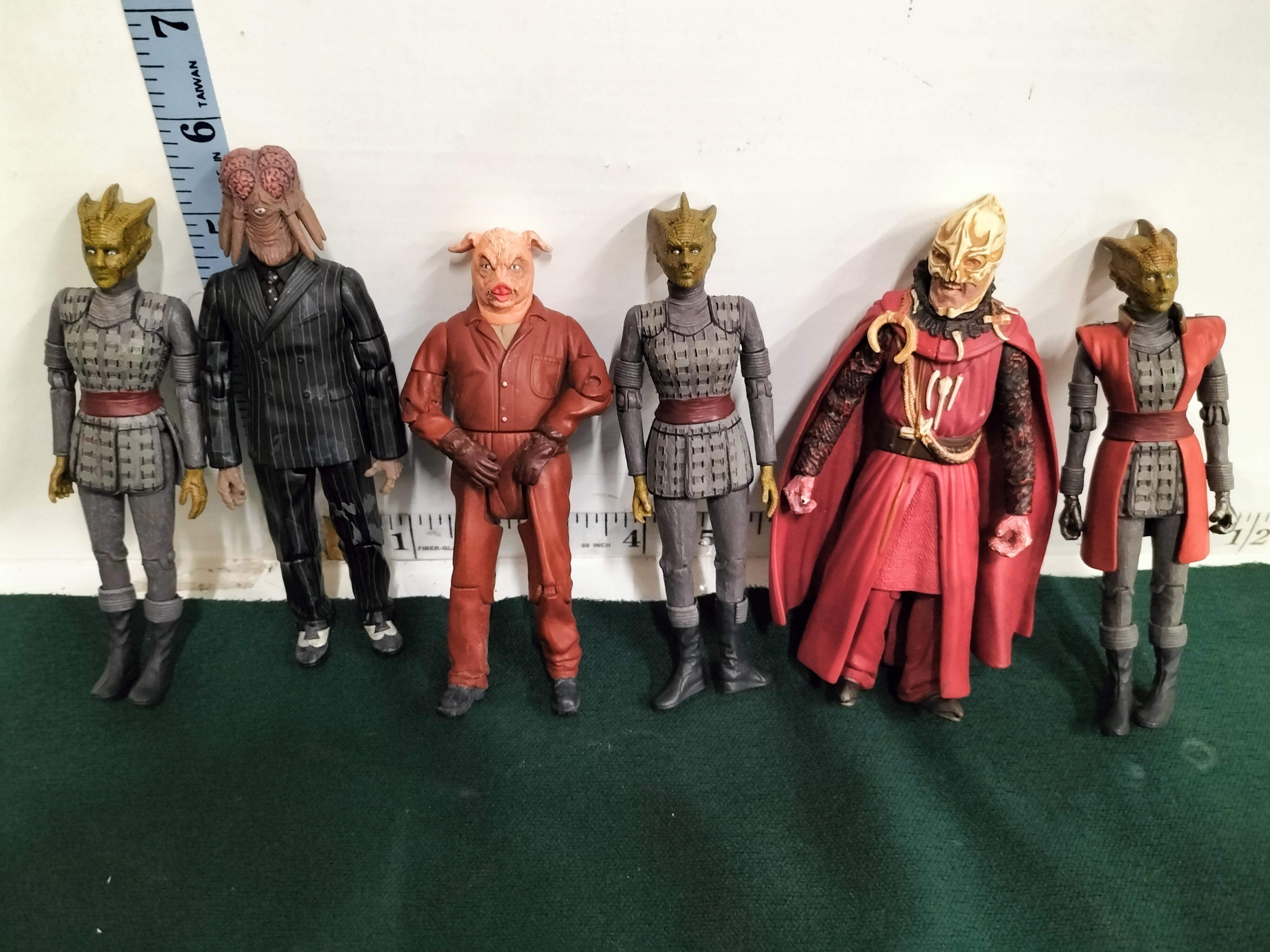 A collection of character action figures featuring various alien and humanoid designs in grey, black, orange, and red, measuring approximately 5 to 6 inches in height.