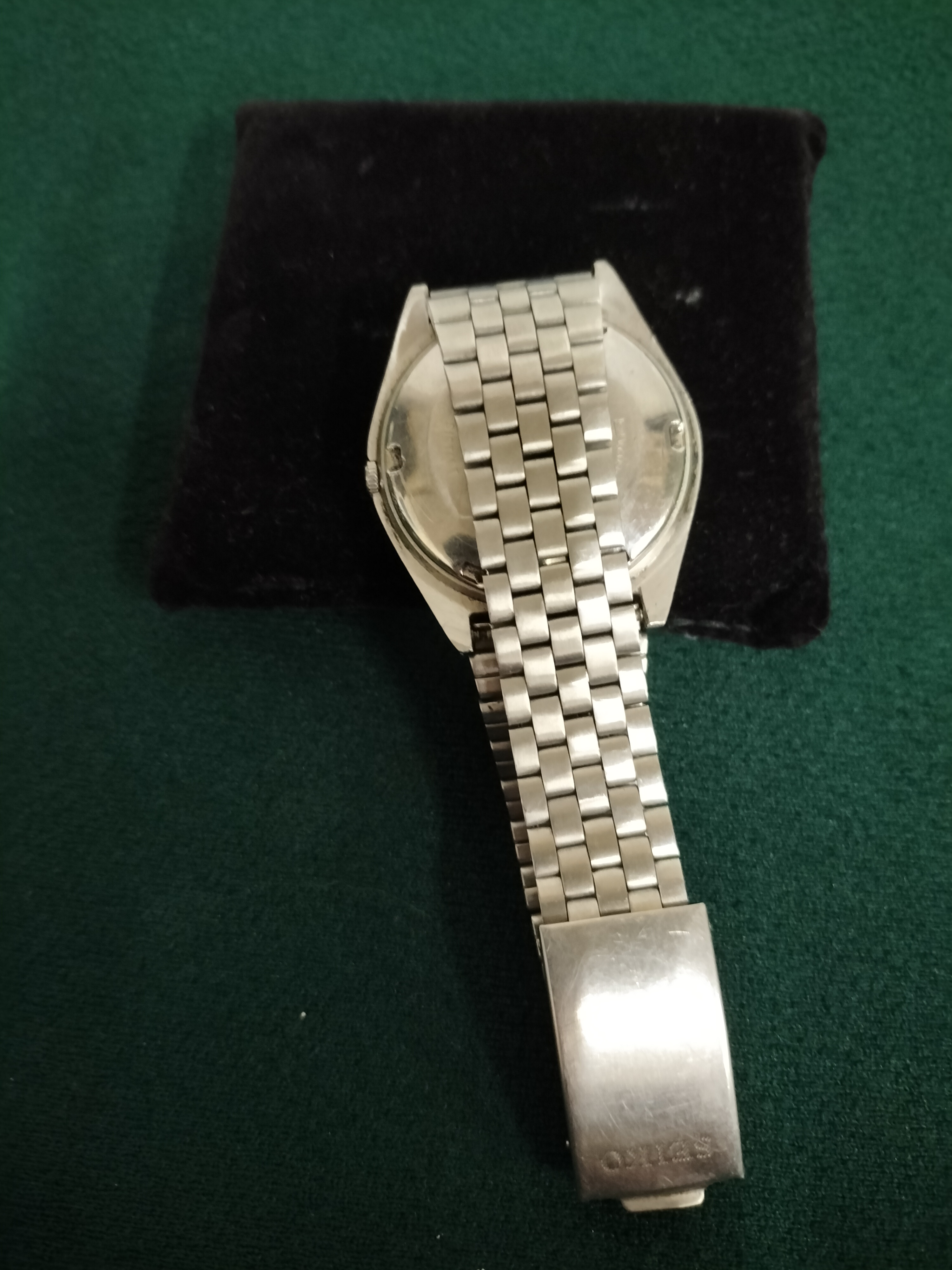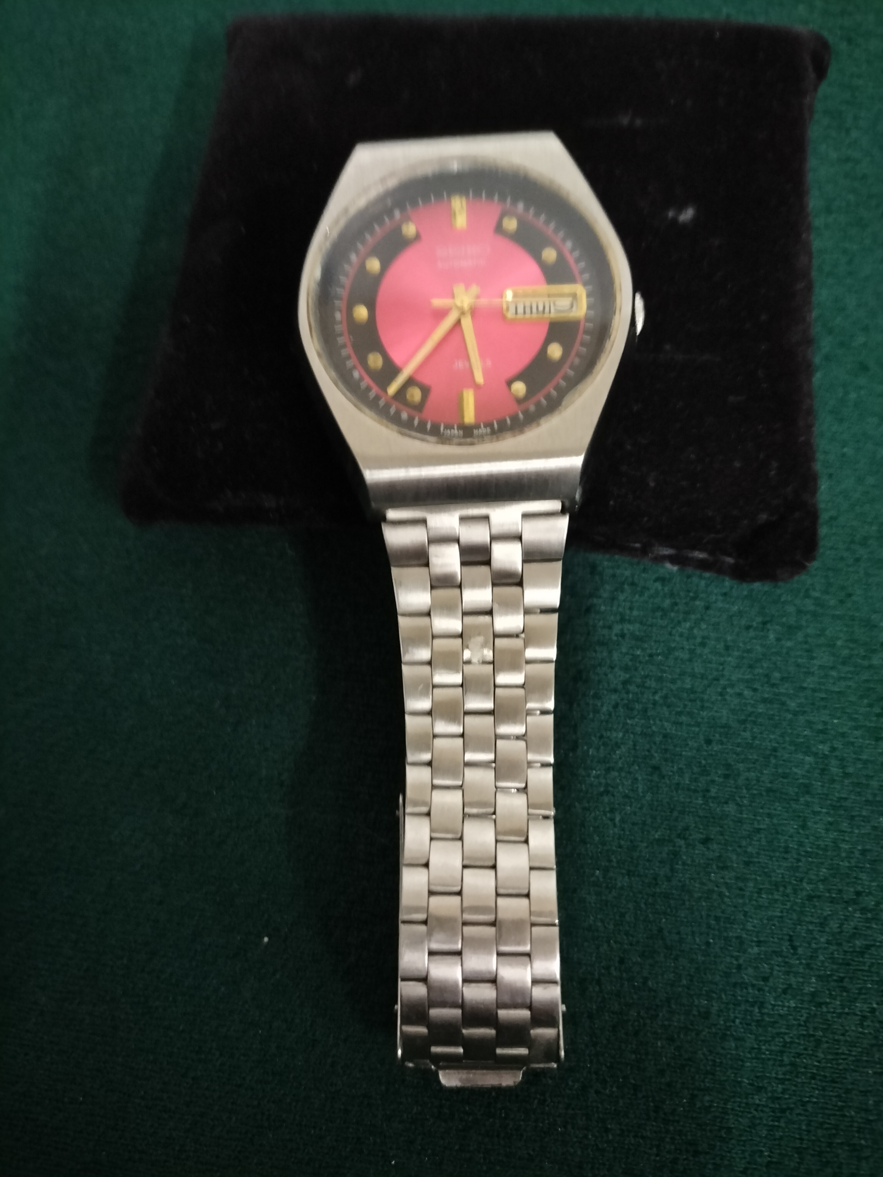 A silver-toned Seiko automatic wristwatch featuring a vibrant pink and black dial with gold-tone hands, a day-date window, and an integrated metal link bracelet.
