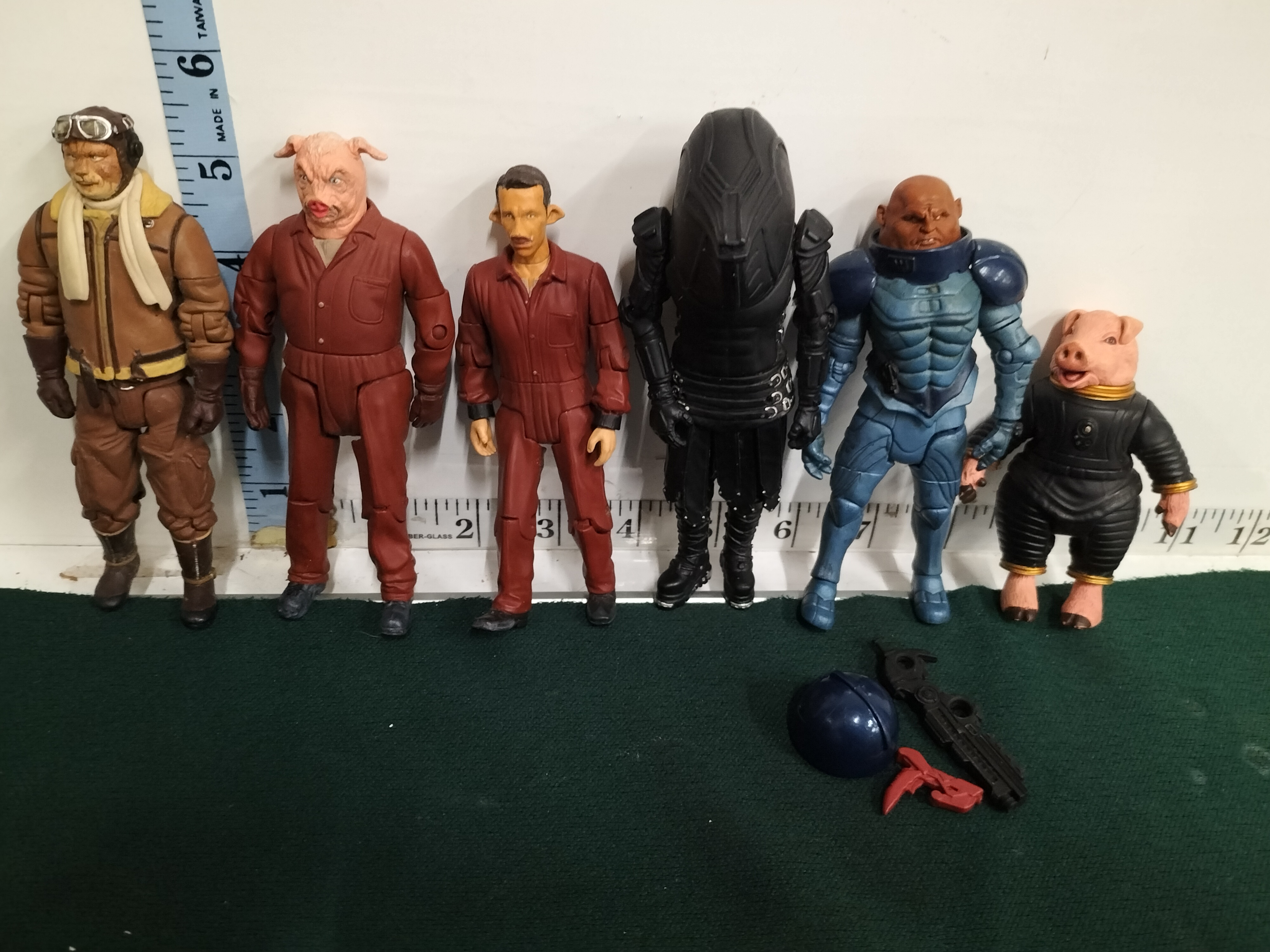 A collection of multi-coloured plastic action figures and accessories including characters in brown, red, black, and blue attire from the film The Fifth Element and the BBC series Doctor Who, measuring up to 6 inches in height.