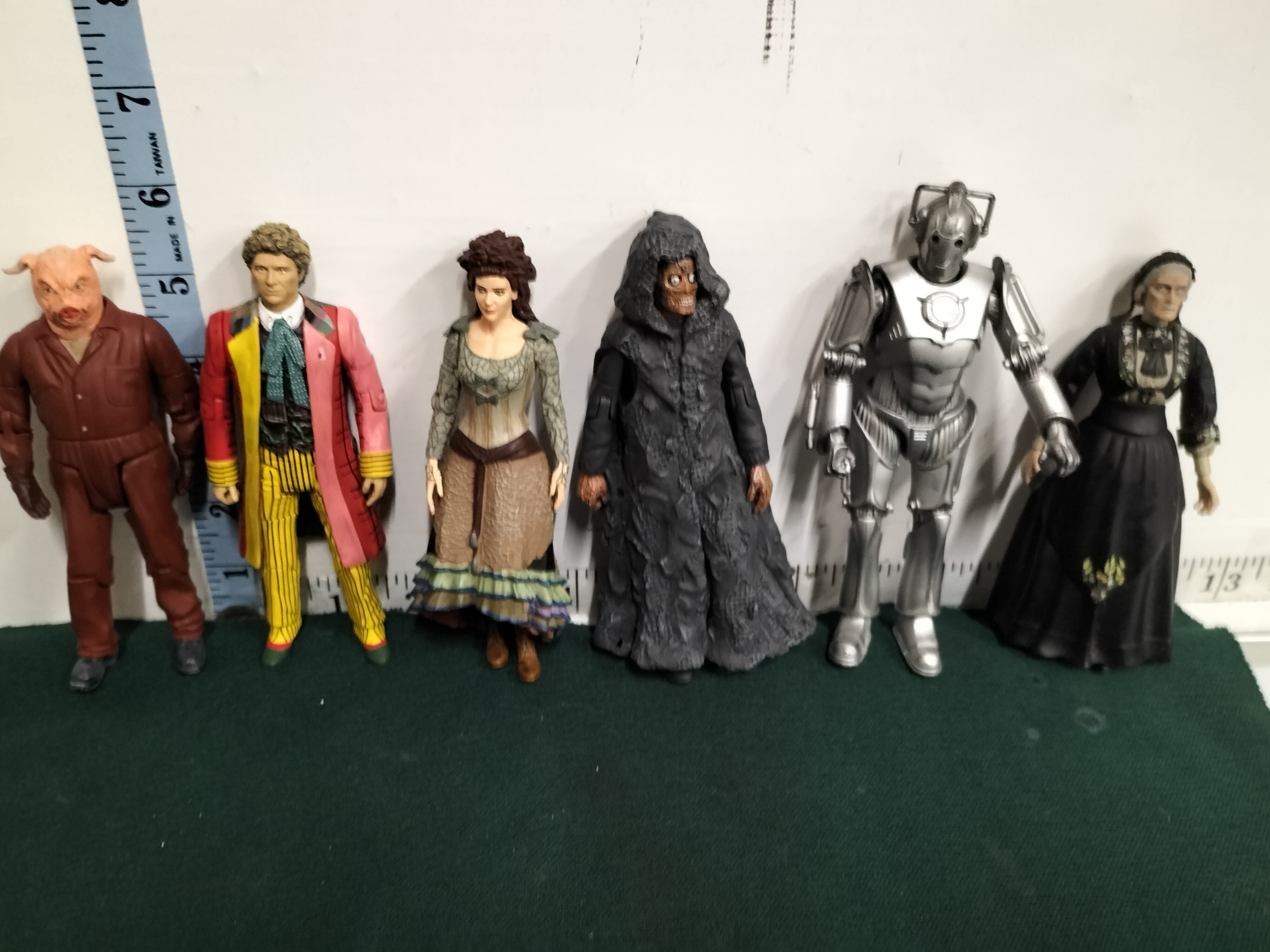 A collection of multicoloured plastic action figures representing various characters from the Doctor Who television series, including the Sixth Doctor and a Cyberman, measuring between 5 and 6 inches in height.