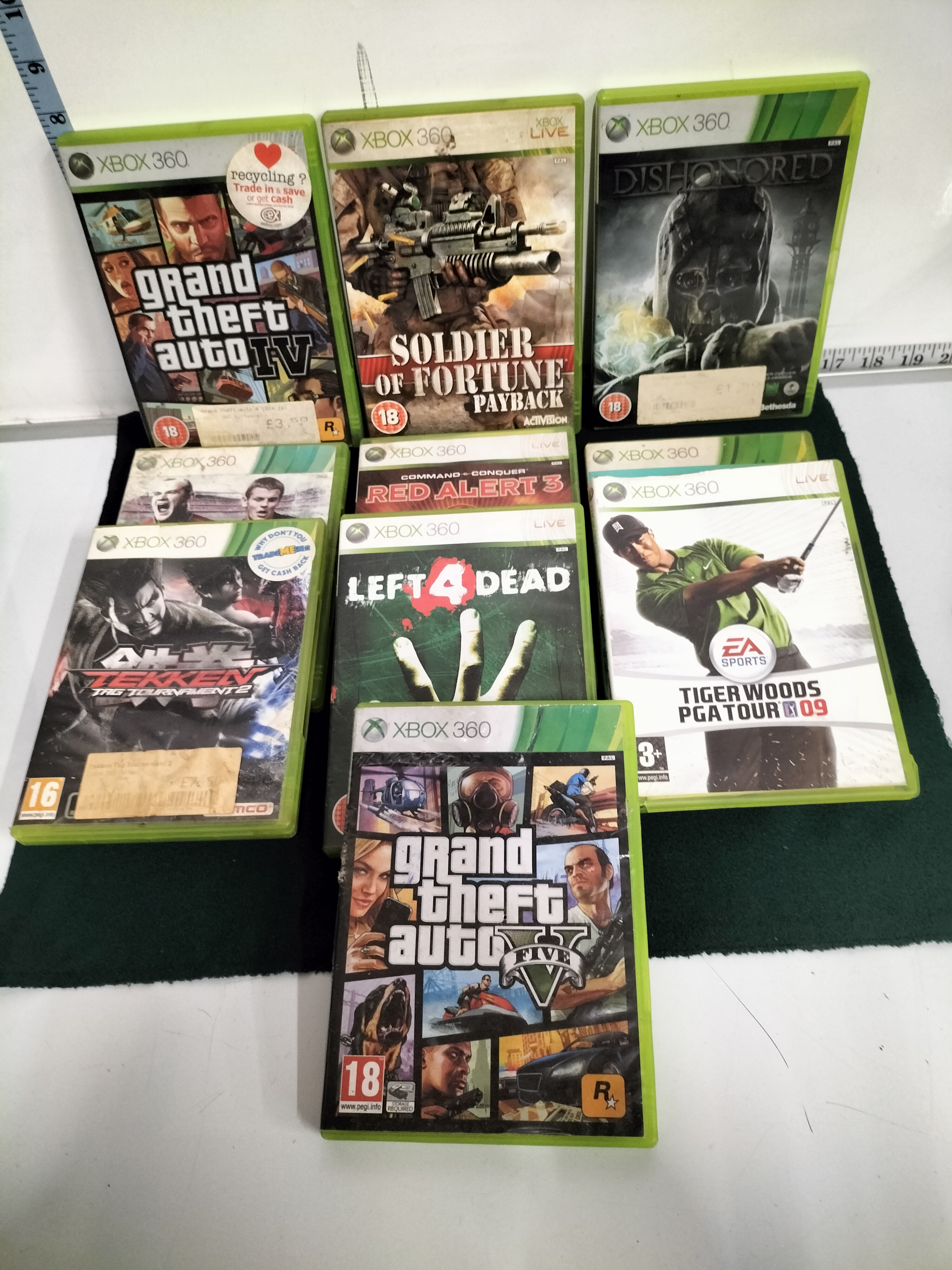 A collection of Xbox 360 video games including Grand Theft Auto IV, Grand Theft Auto Five, and Tekken Tag Tournament 2 in original green cases.