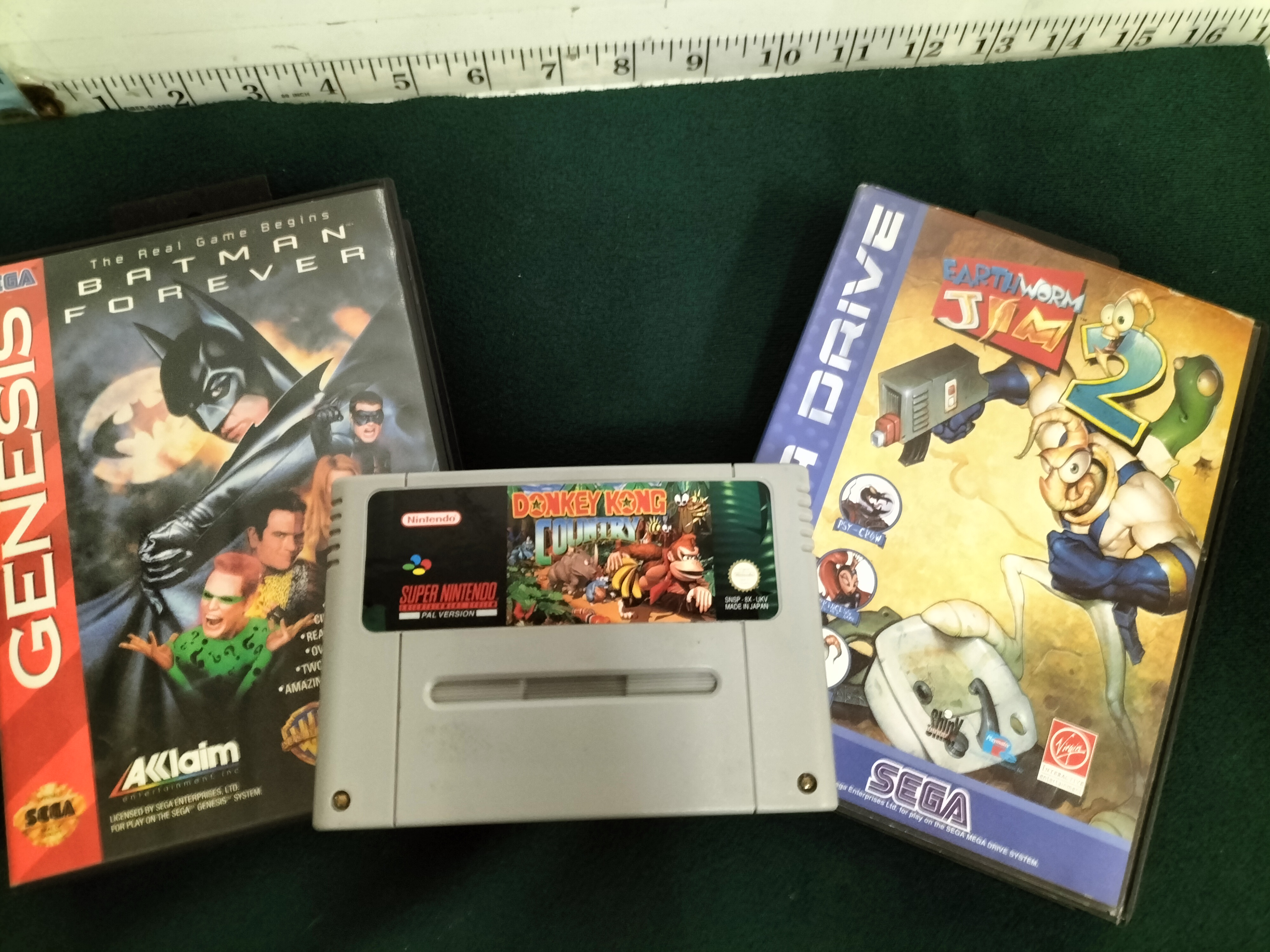 A trio of vintage video games including a Donkey Kong Country cartridge for Super Nintendo, a cased Batman Forever for Sega Genesis, and a cased Earthworm Jim 2 for Sega Mega Drive, with items measuring between 13cm and 19cm.