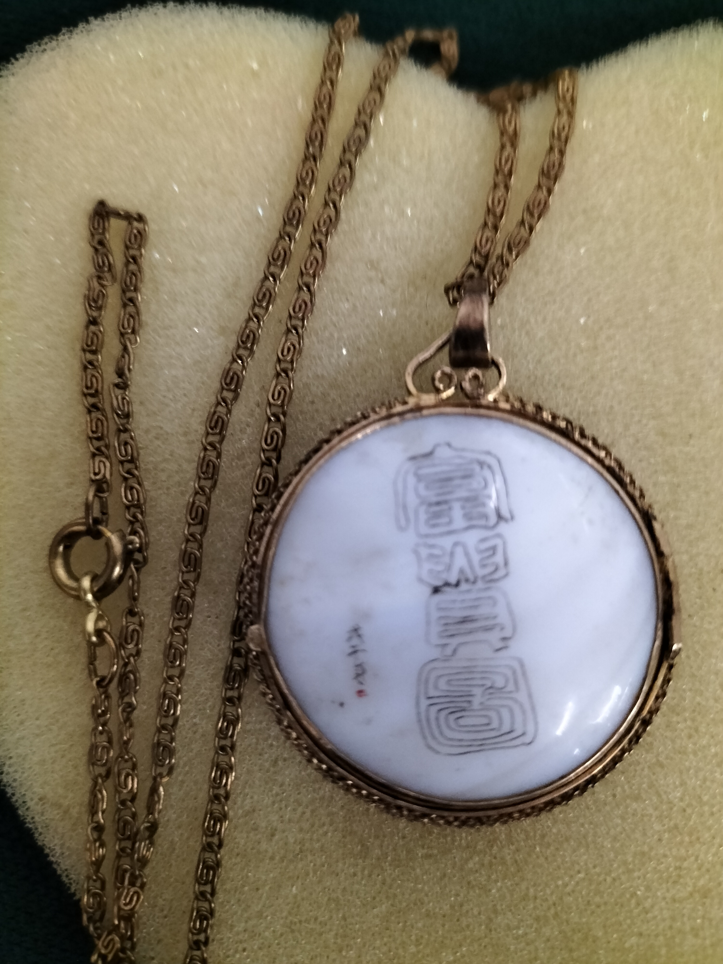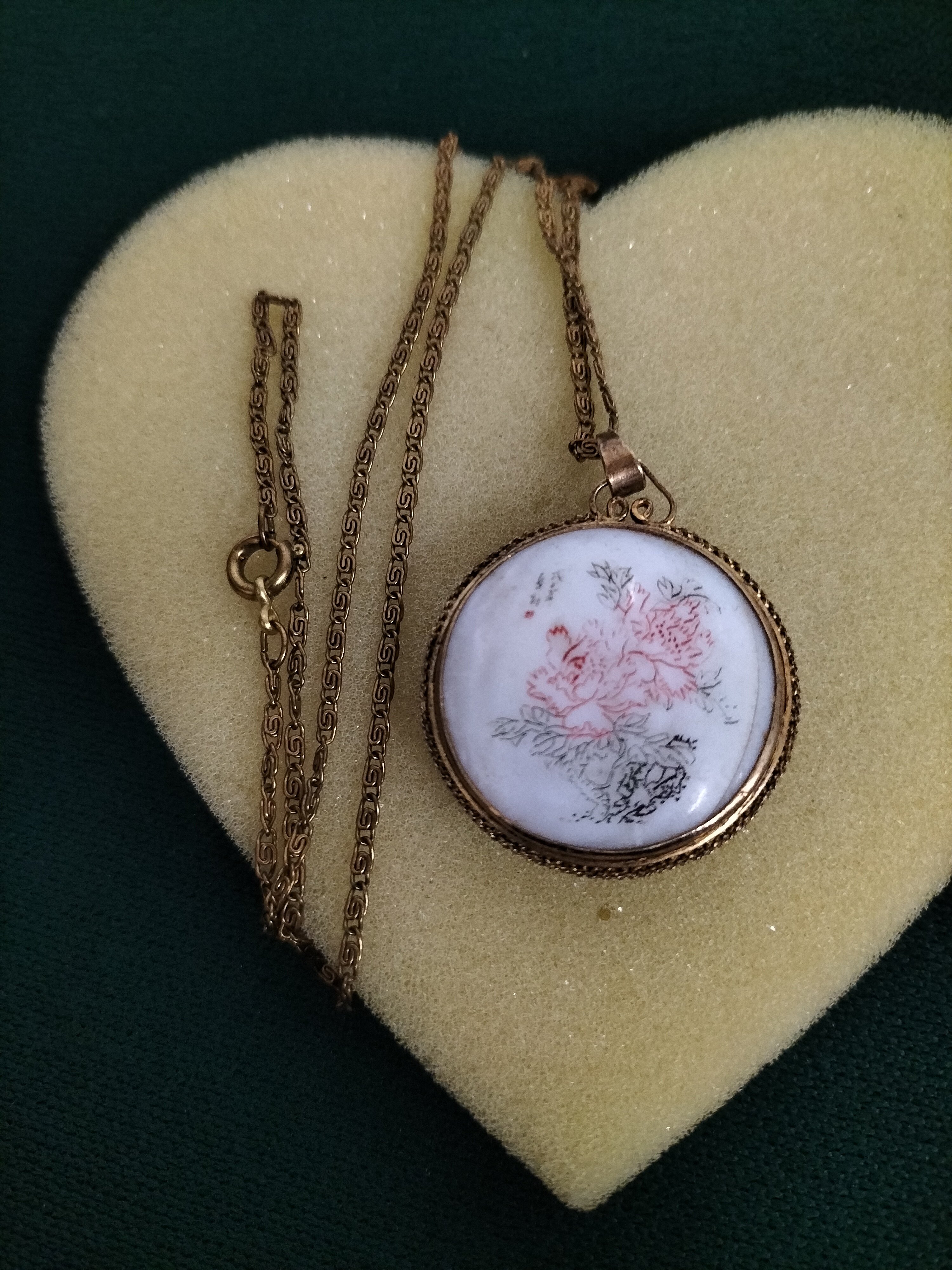 A gold-tone chain necklace featuring a circular white pendant decorated with a pink and black floral motif and Asian characters to the front, with seal script characters to the reverse.