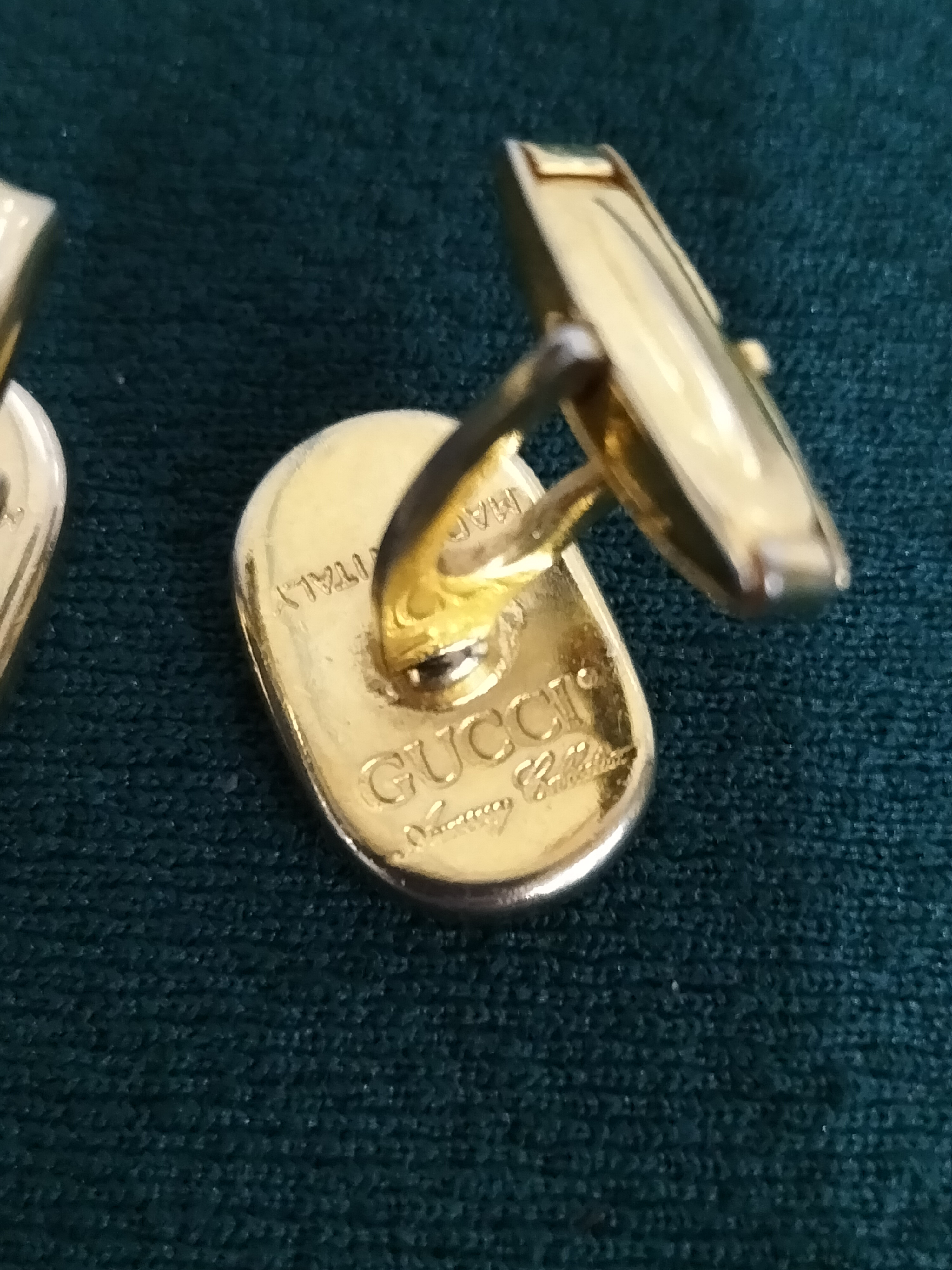 A pair of gold and silver-tone oval cufflinks featuring the interlocking G logo with a chain-link border, marked Gucci Italy Accessory Collection on the reverse.