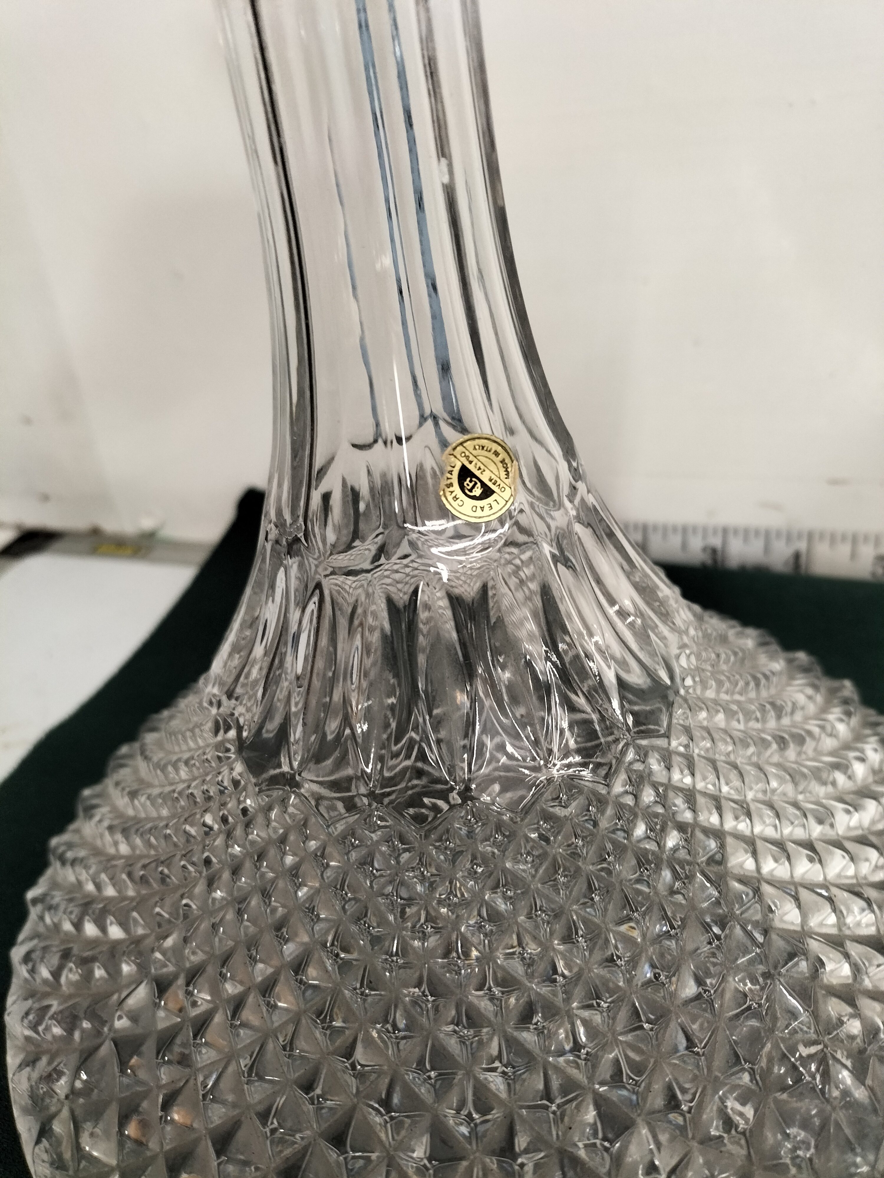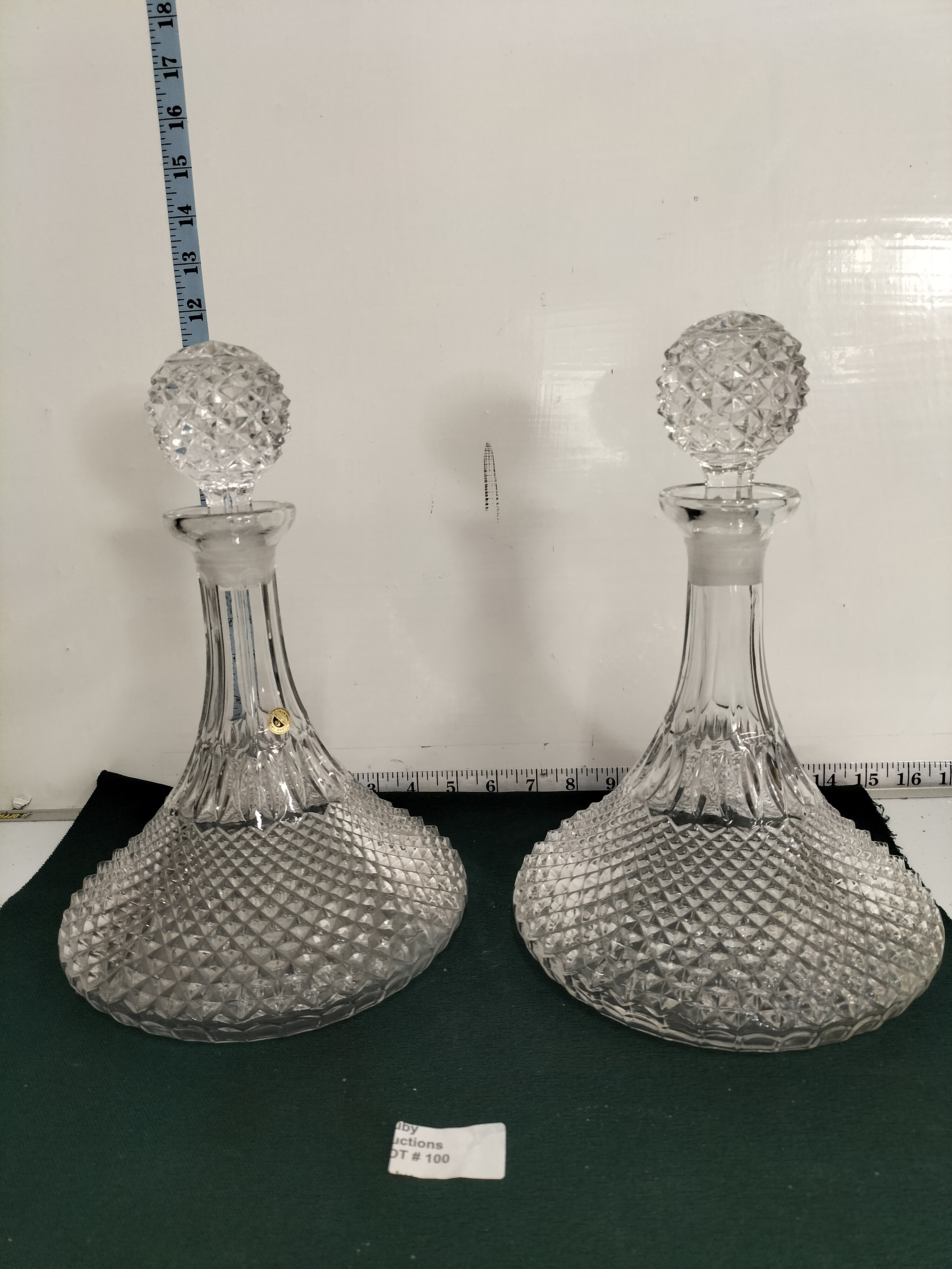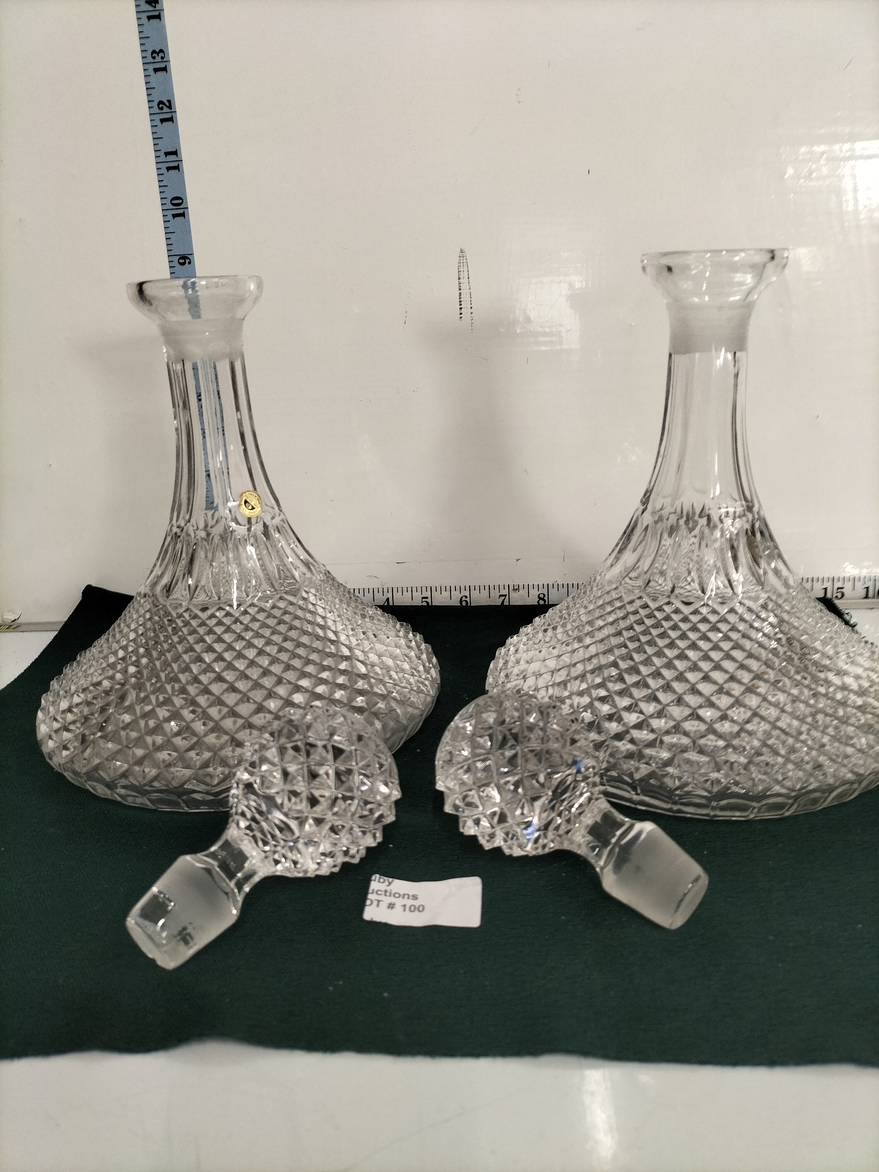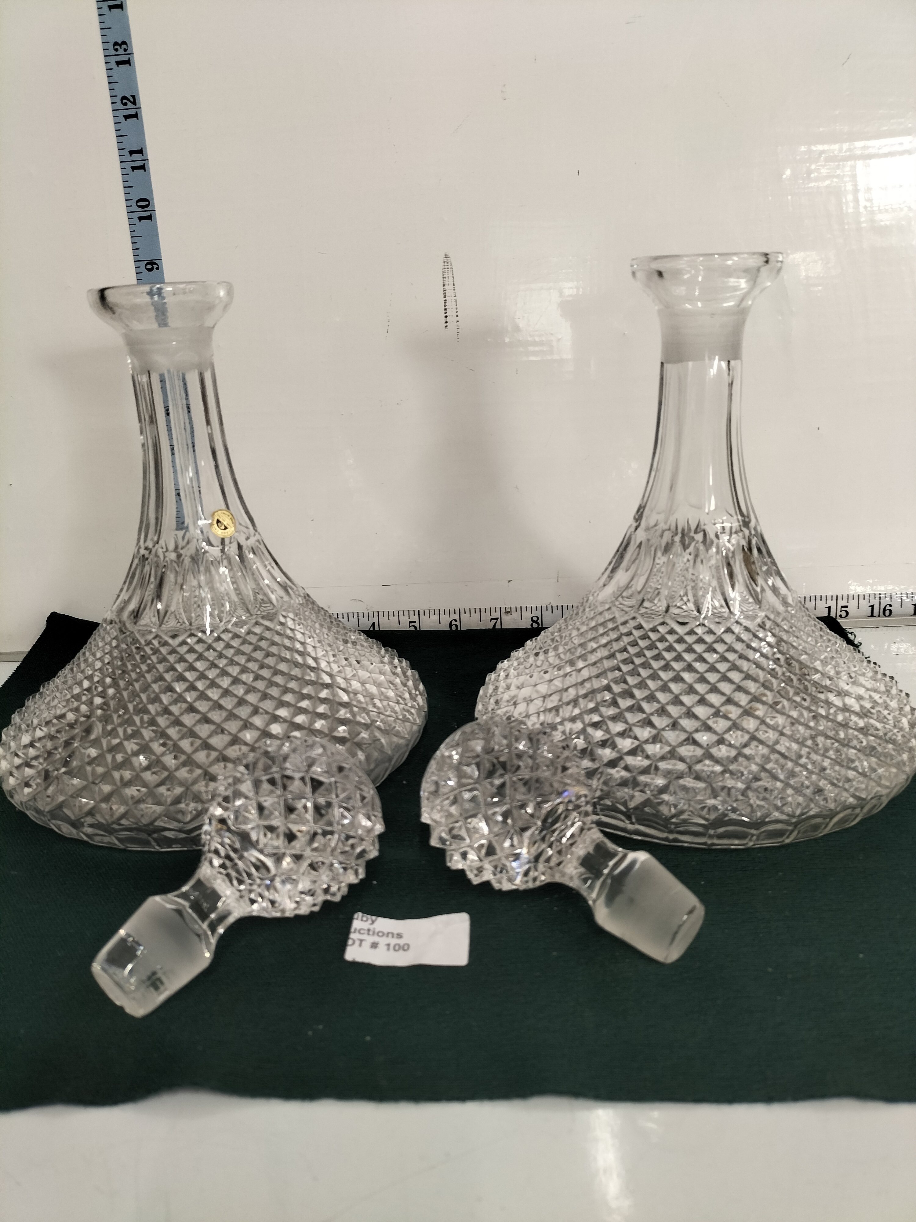 A pair of Italian lead crystal ships decanters with a diamond cut pattern and matching stoppers, measuring approximately 28cm in height.