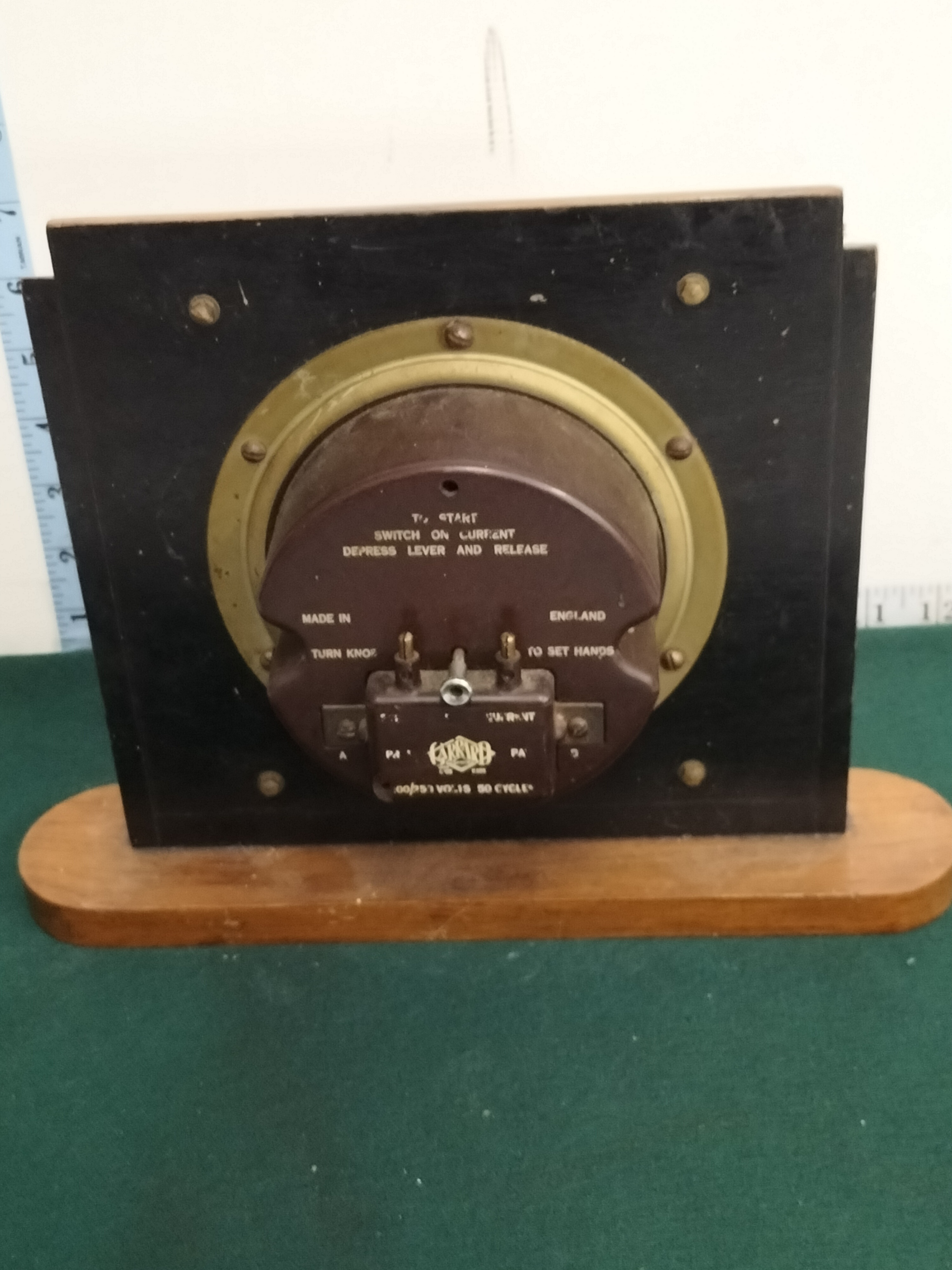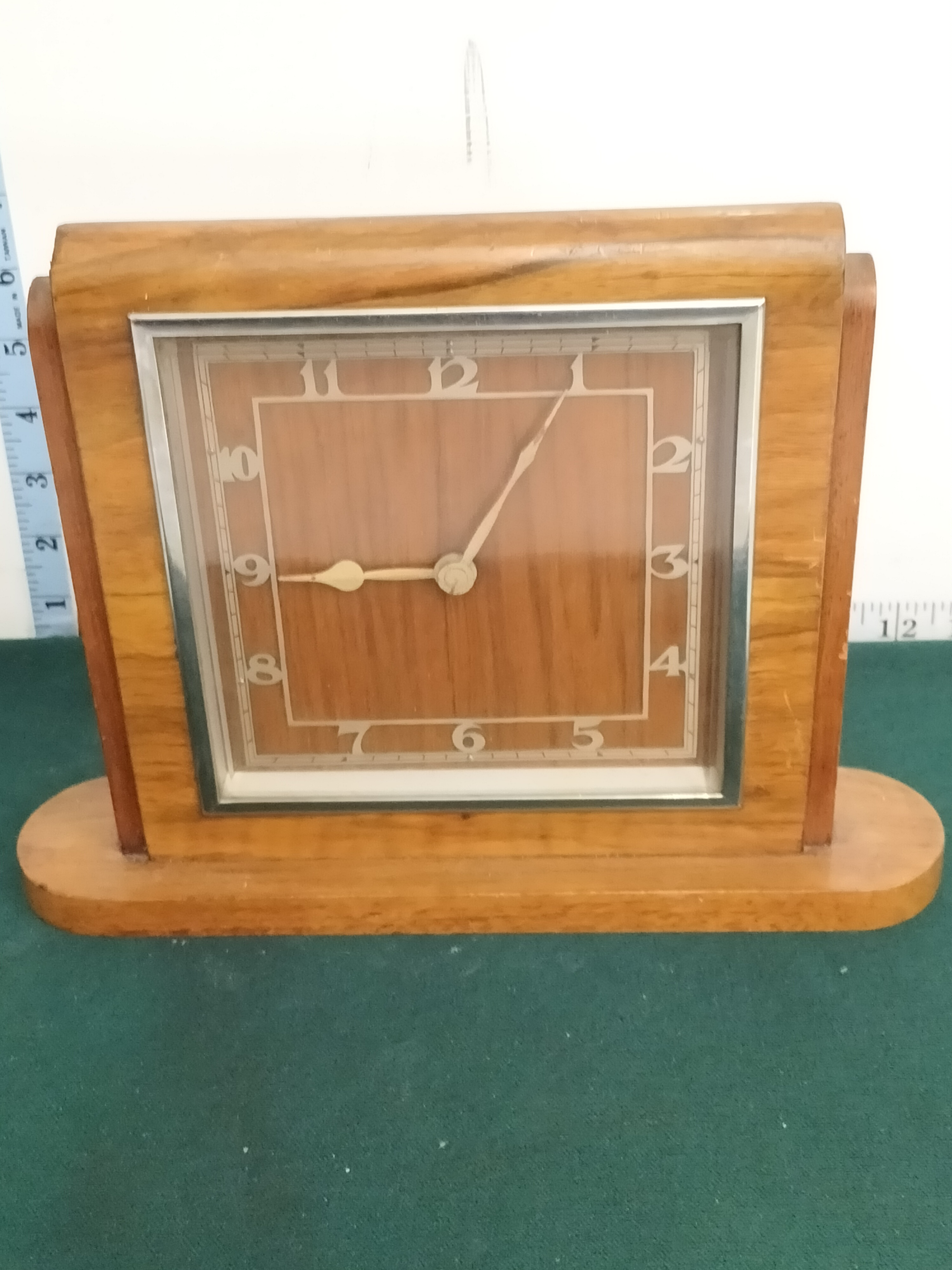 A light brown wood-cased Art Deco mantel clock with chrome accents and a Garrard electric movement, measuring approximately 6 inches in height.
