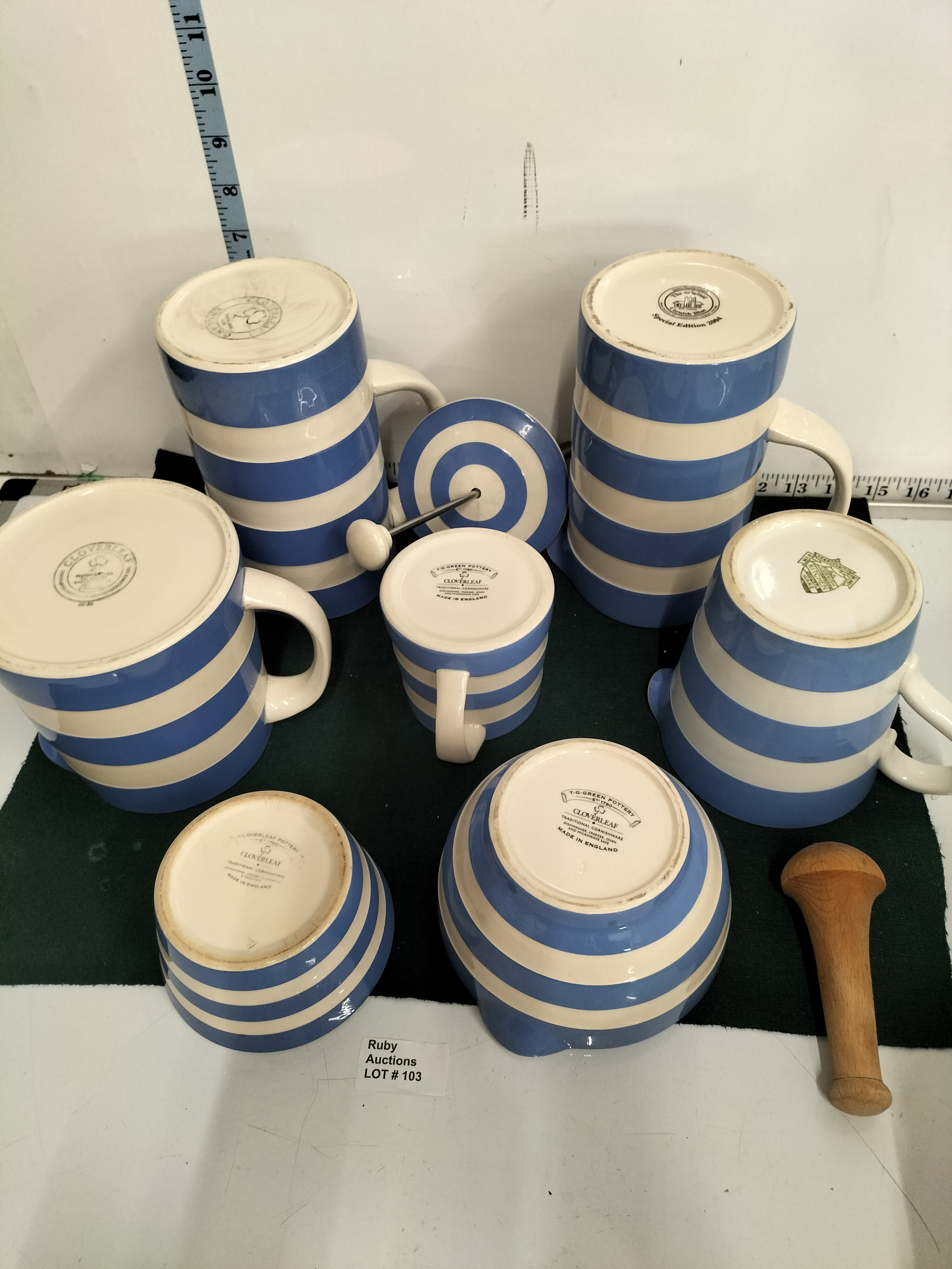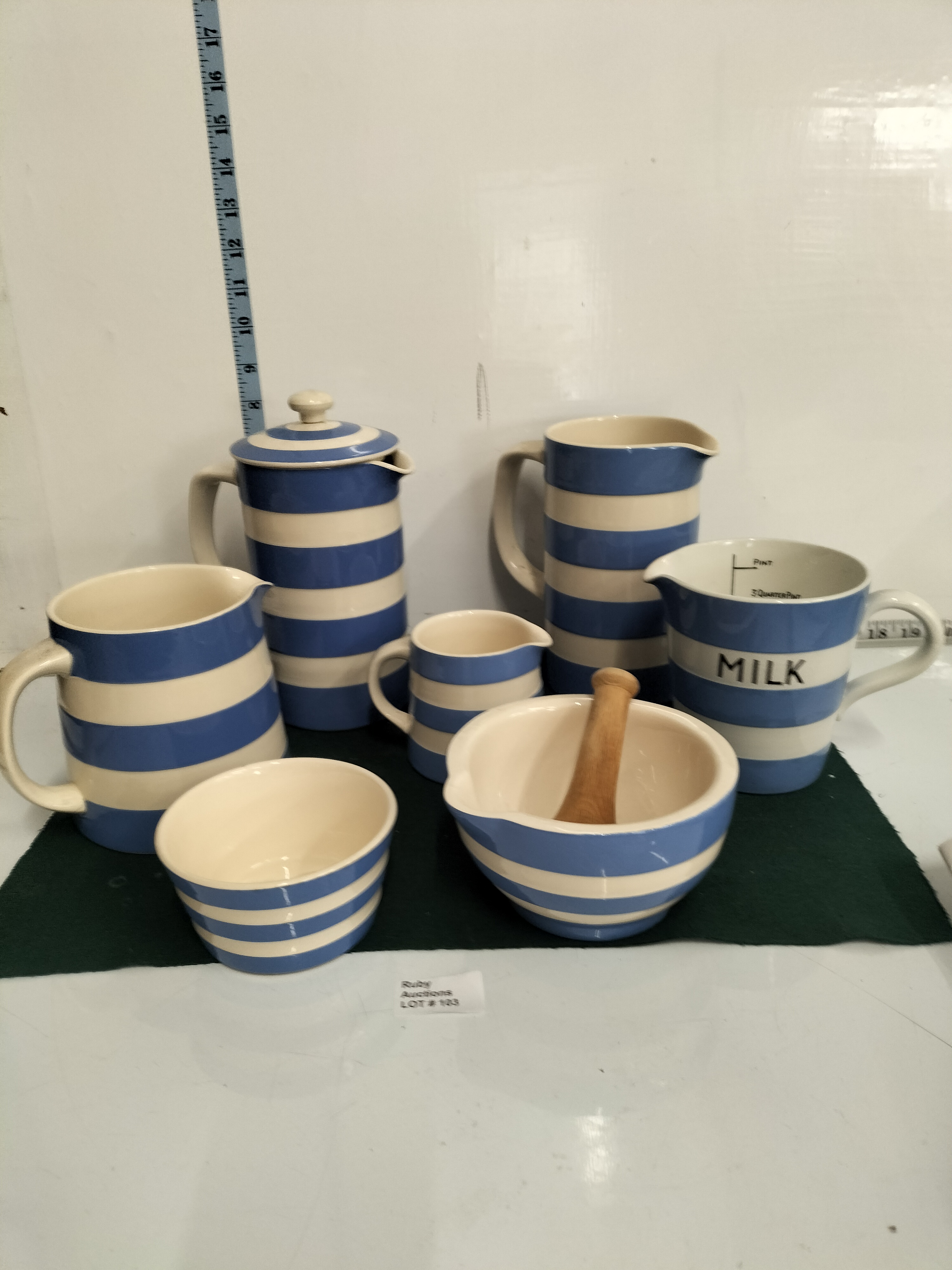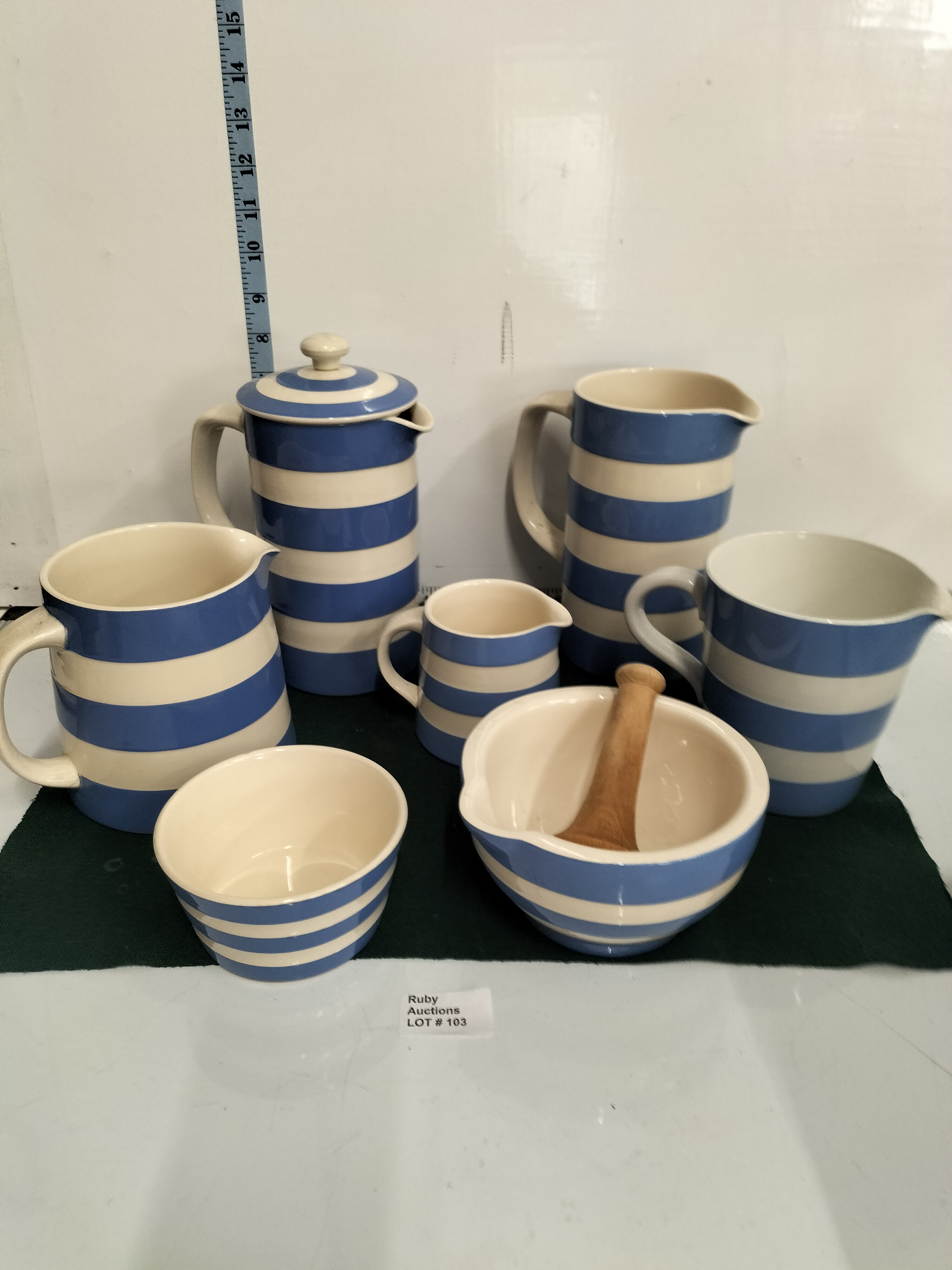 A collection of blue and white striped ceramic kitchenware including various pitchers, bowls, and a mortar with wooden pestle, featuring maker’s marks for T.G. Green and Cloverleaf, with the tallest item measuring approximately 16 cm in height.