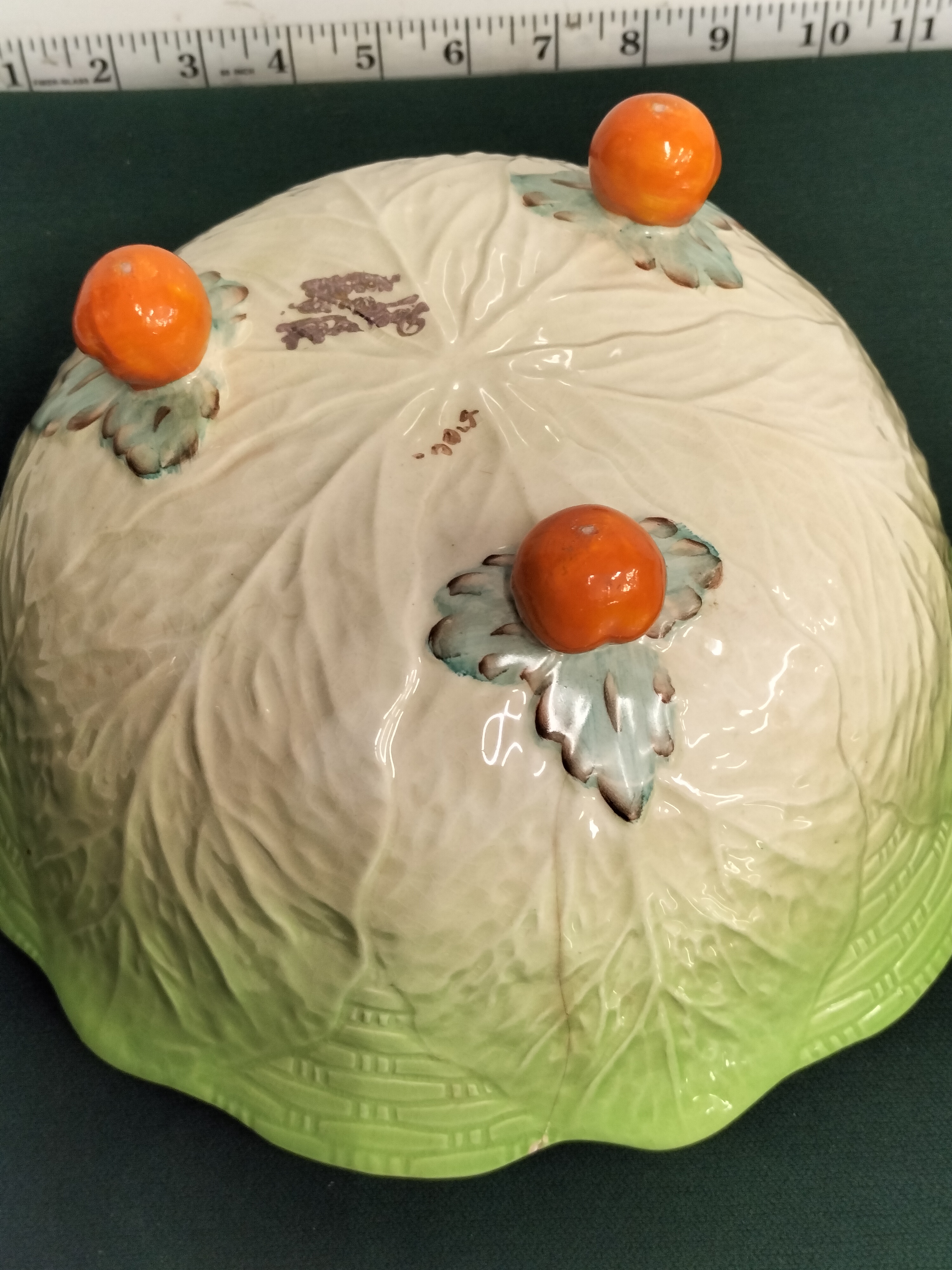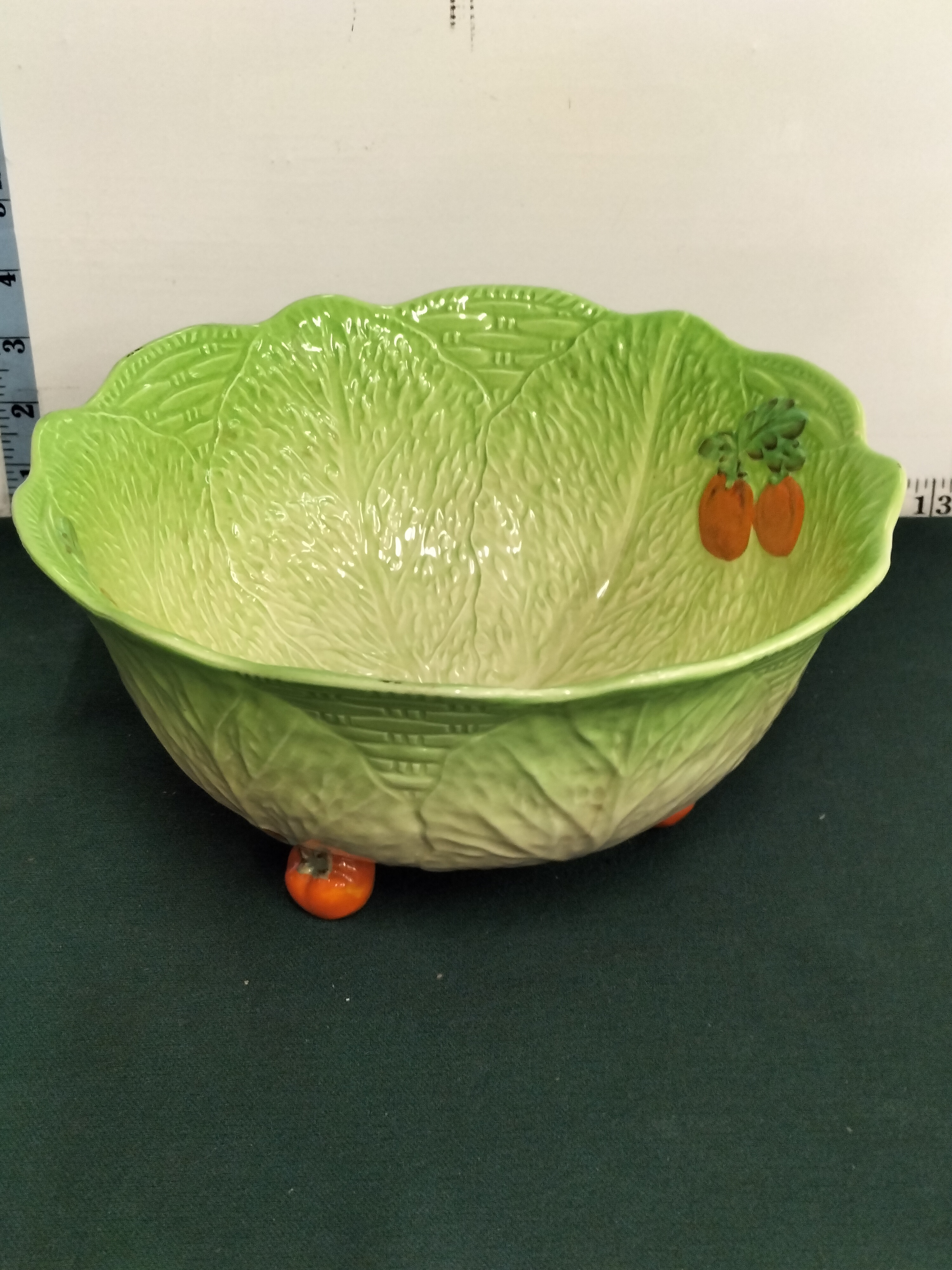 A green and cream ceramic cabbage-ware bowl featuring orange tomato-style feet and interior accents, marked Maruhon Ware and 1015 to the underside, measuring approximately 9 inches in diameter.