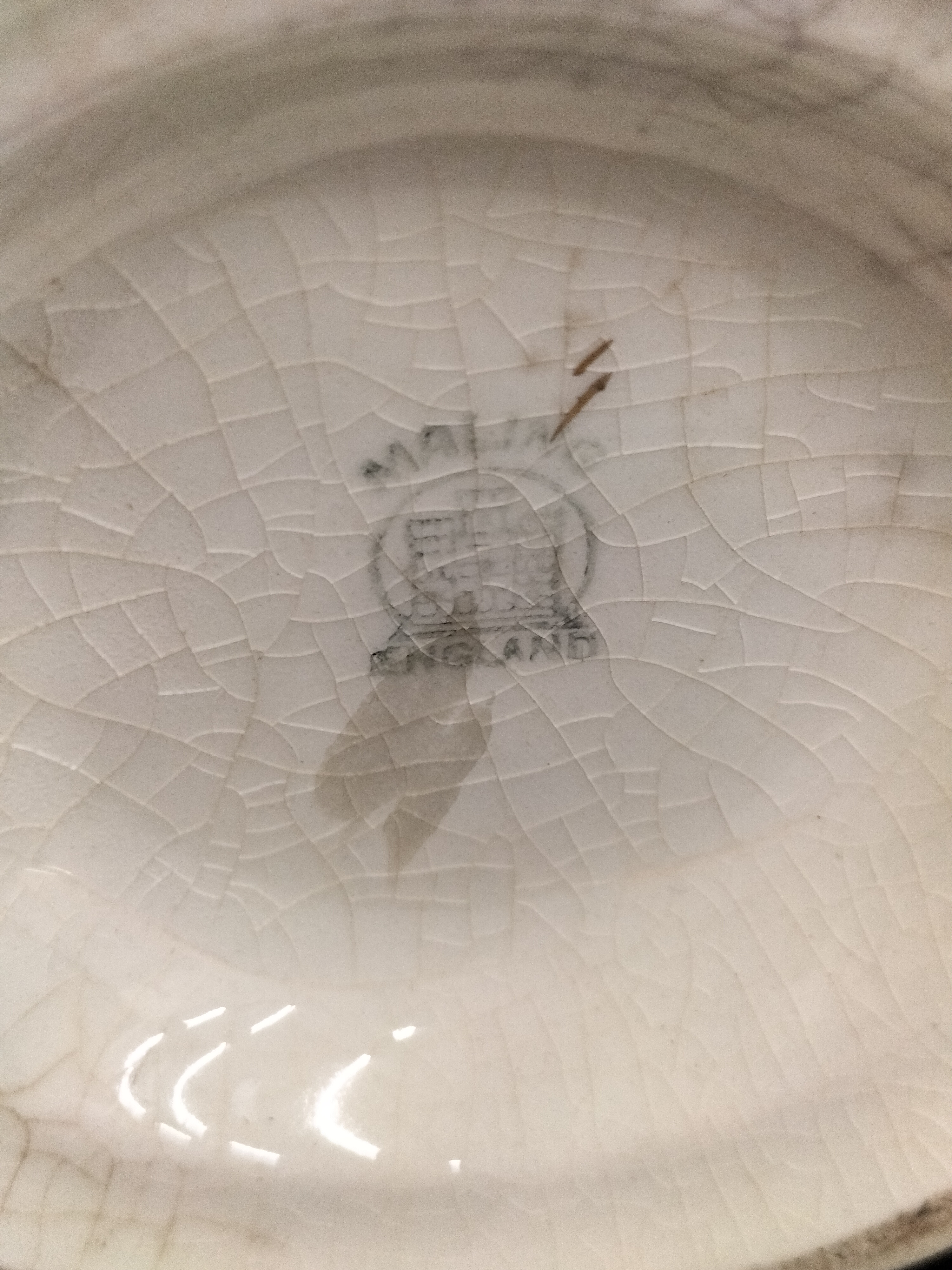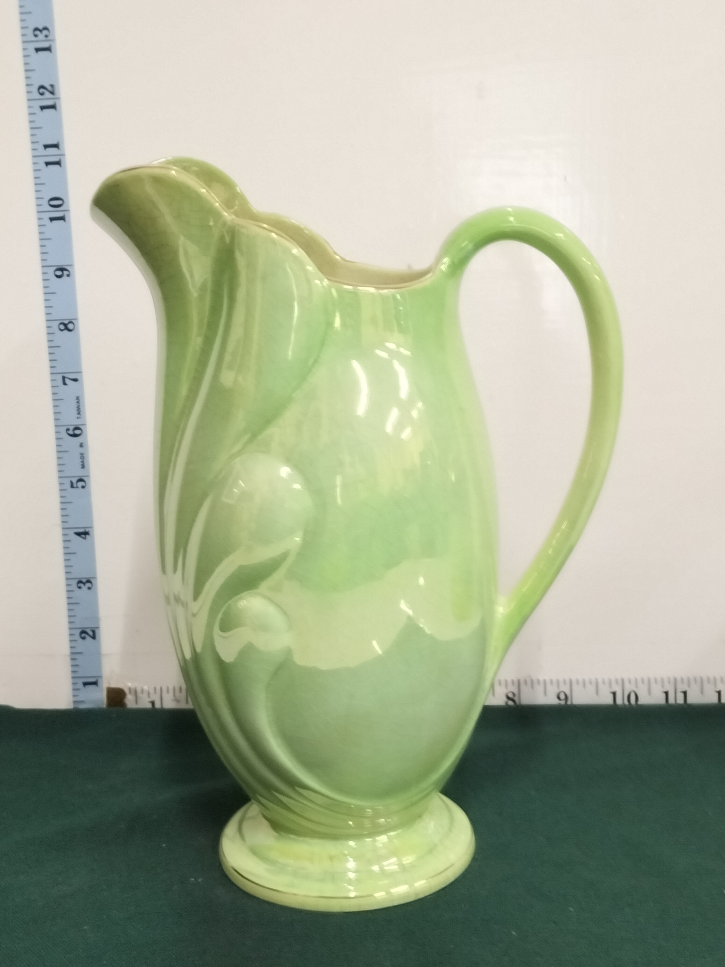 A light green ceramic pitcher featuring a flowing decorative design and a Maling England maker’s mark to the base, measuring approximately 10.5 inches in height.