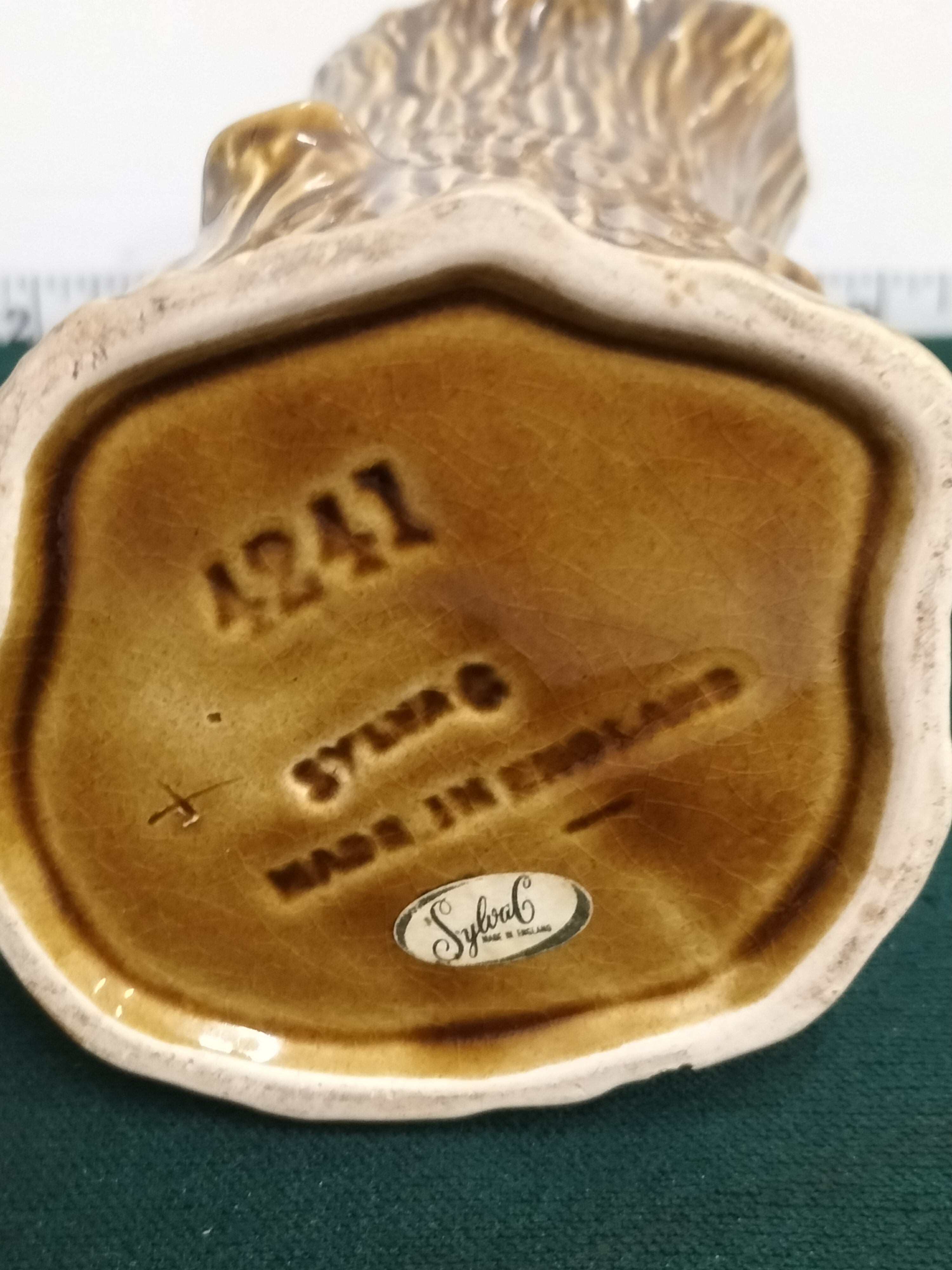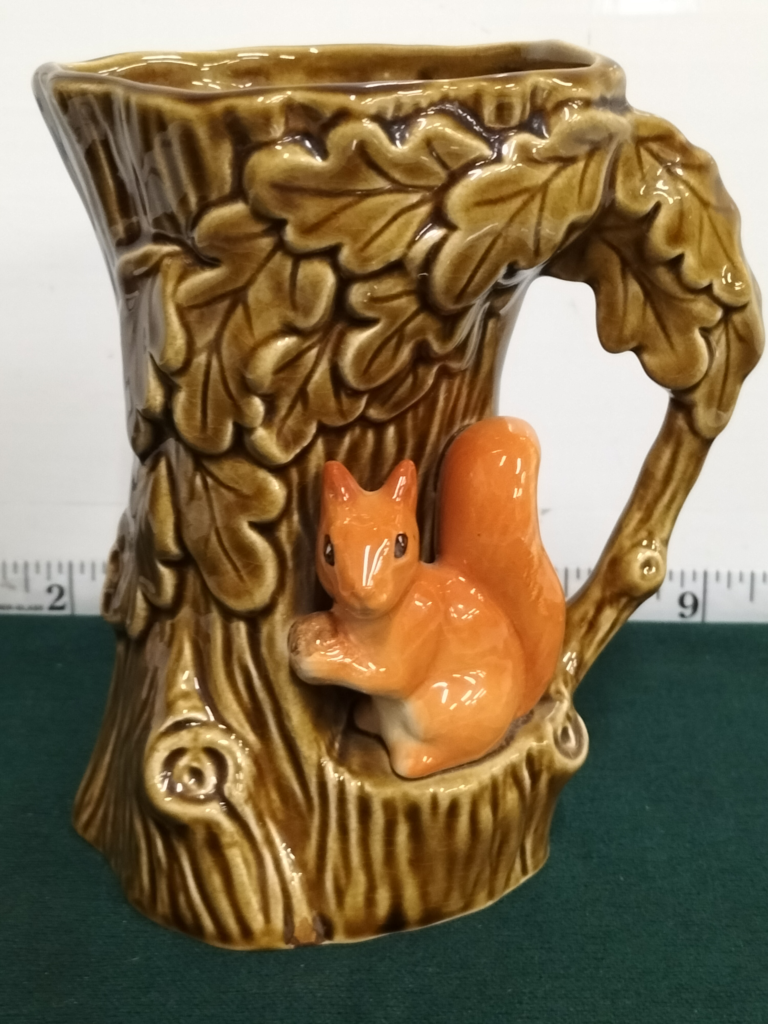 A SylvaC olive-brown and orange ceramic pitcher shaped like a tree trunk with an attached squirrel figurine, measuring approximately 9 inches in height.