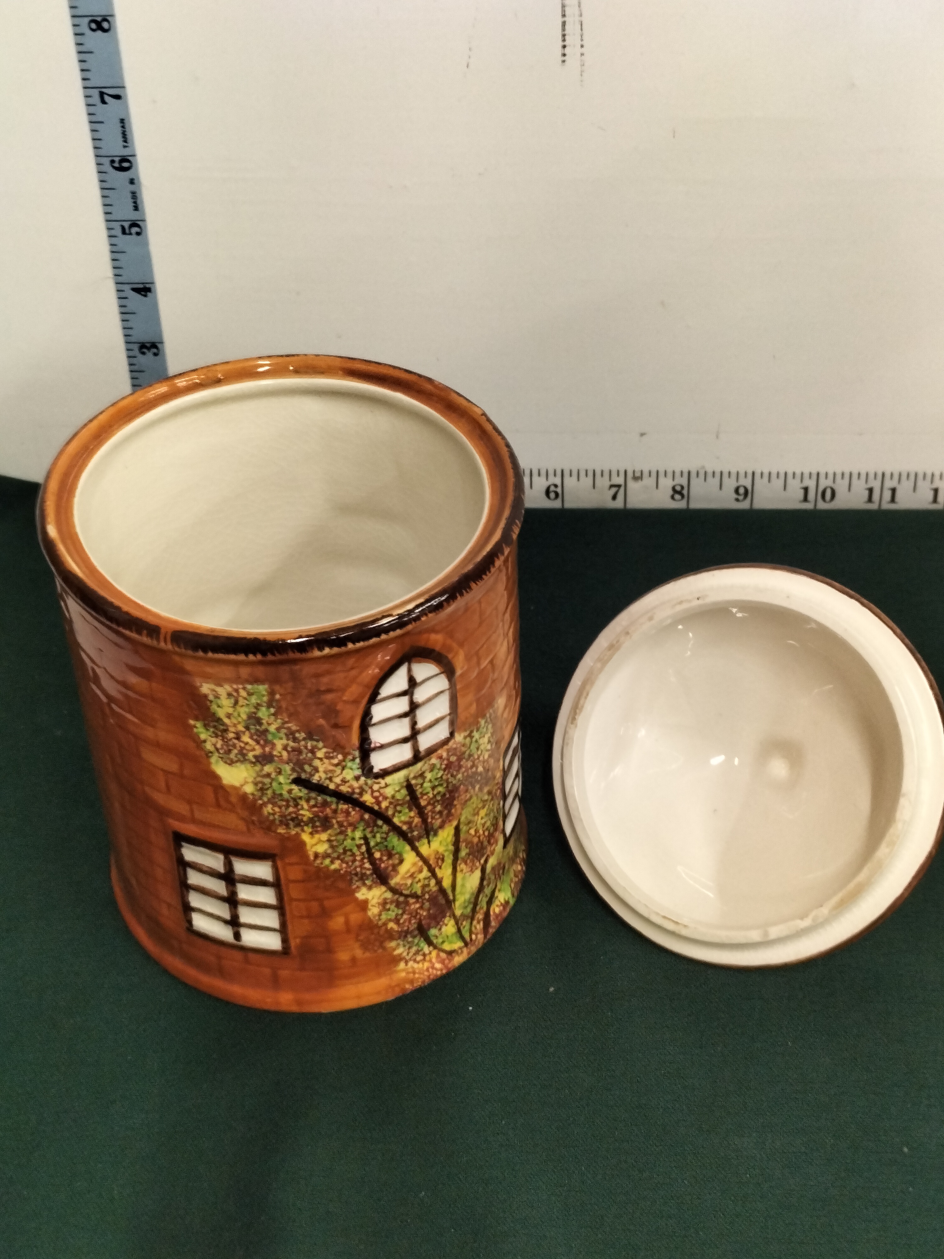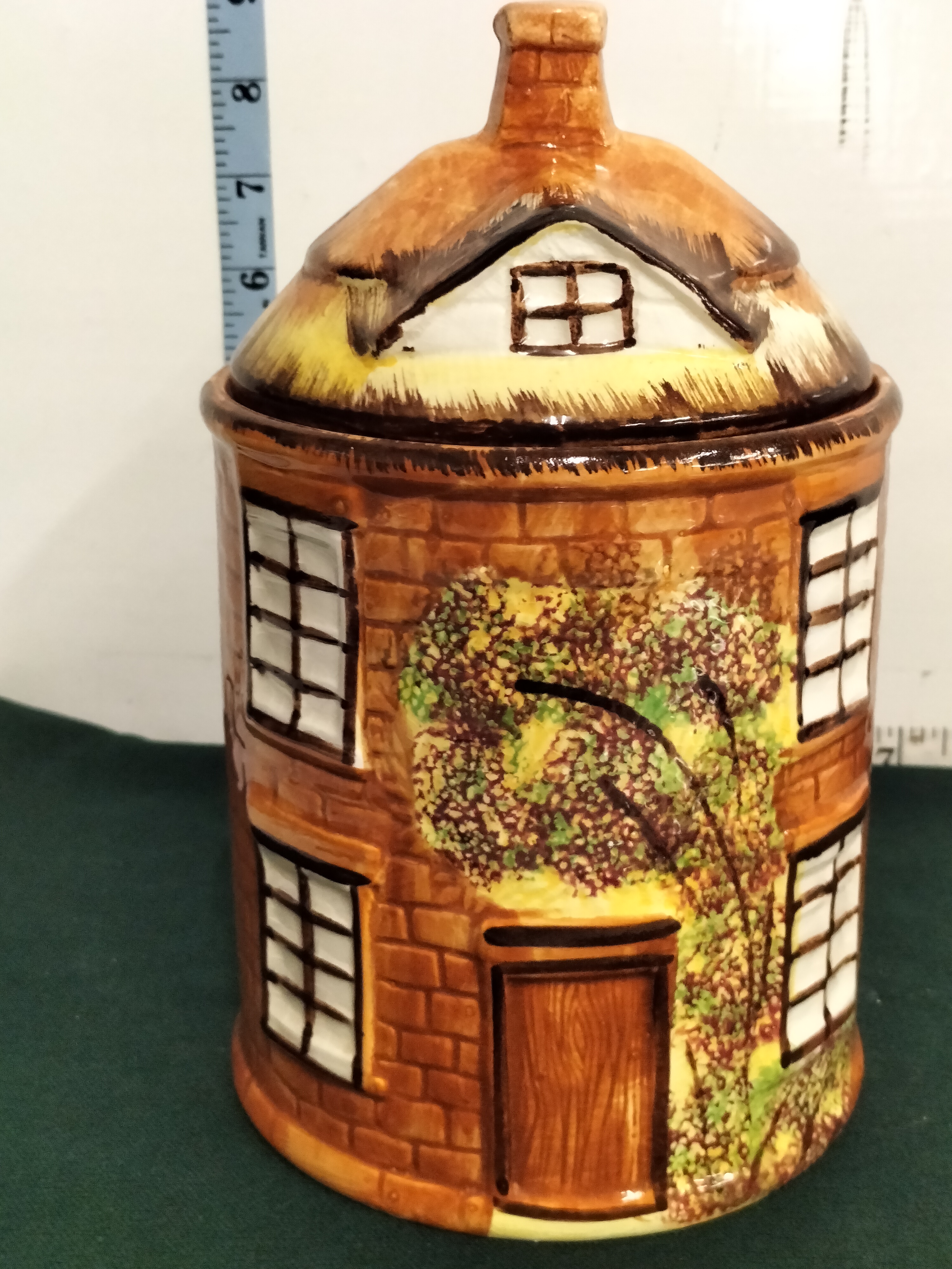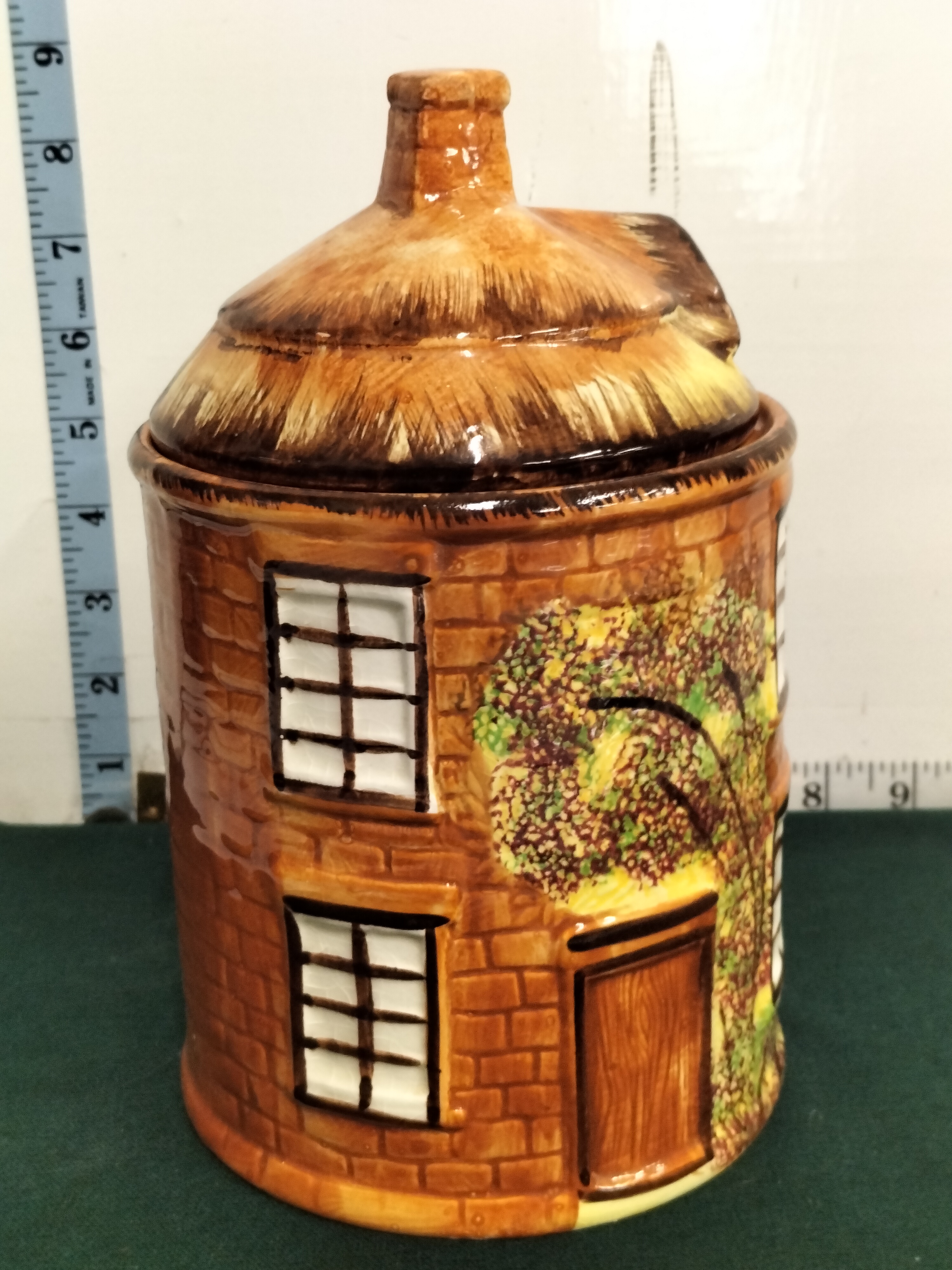 A brown and tan ceramic canister designed as a thatched cottage with green, yellow, and white decorative details, measuring approximately 9 inches in height.