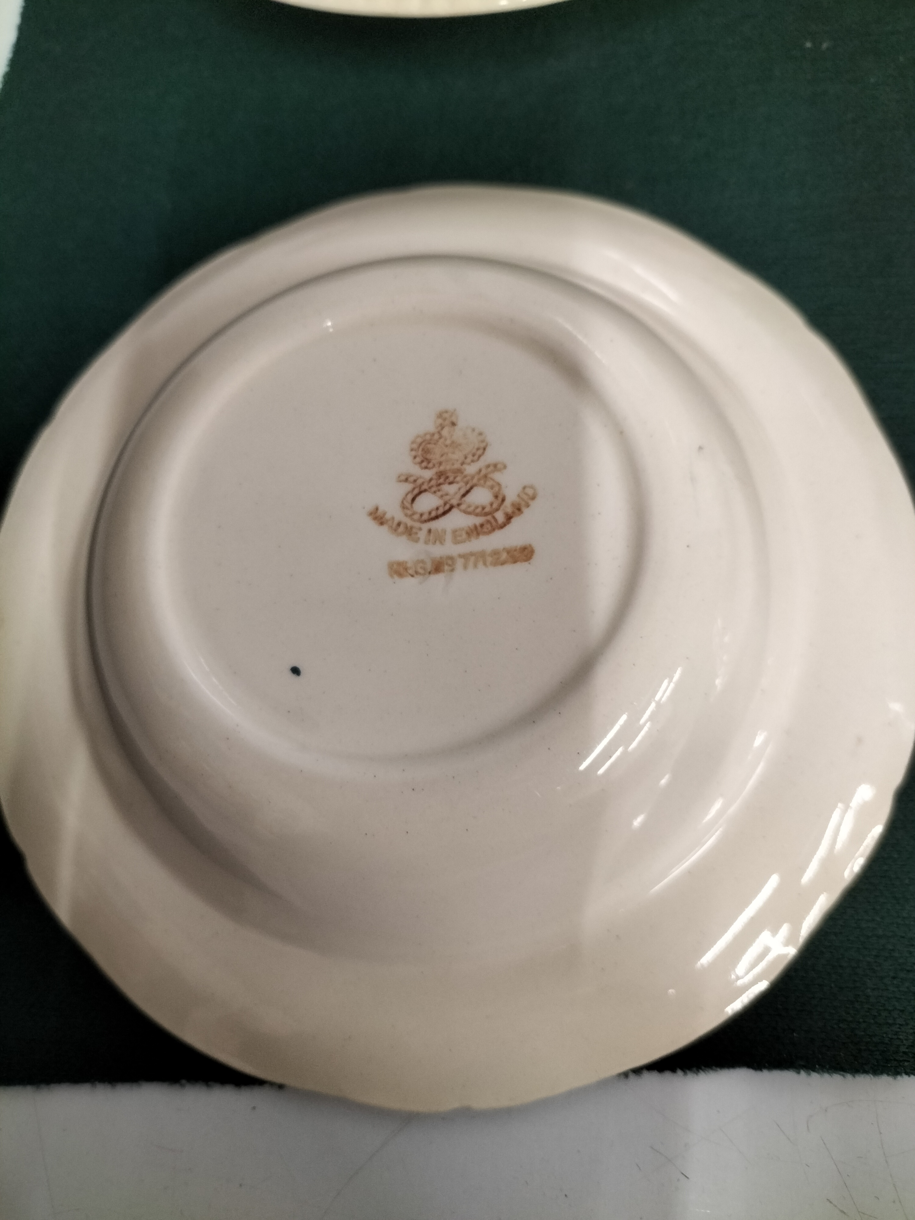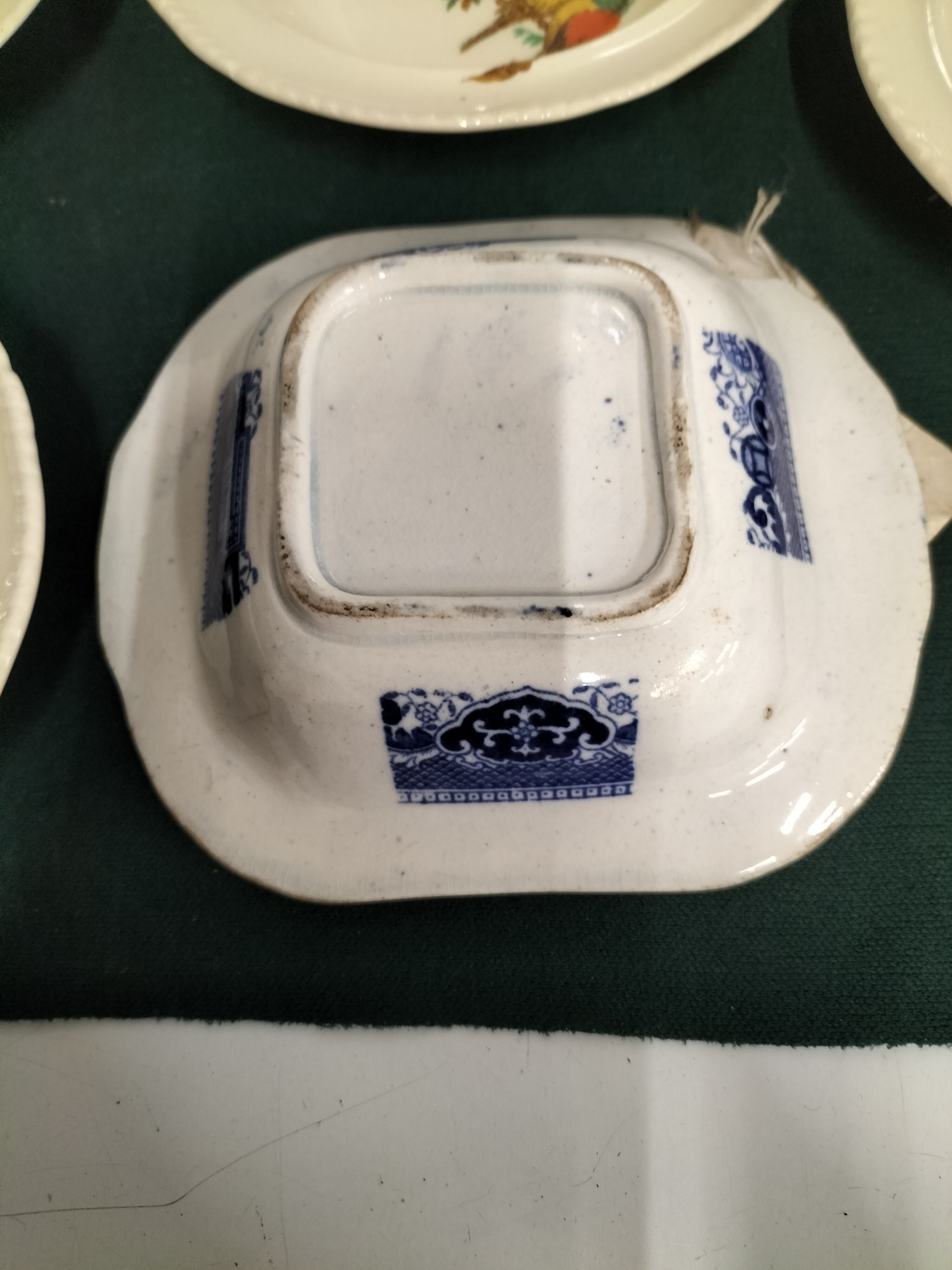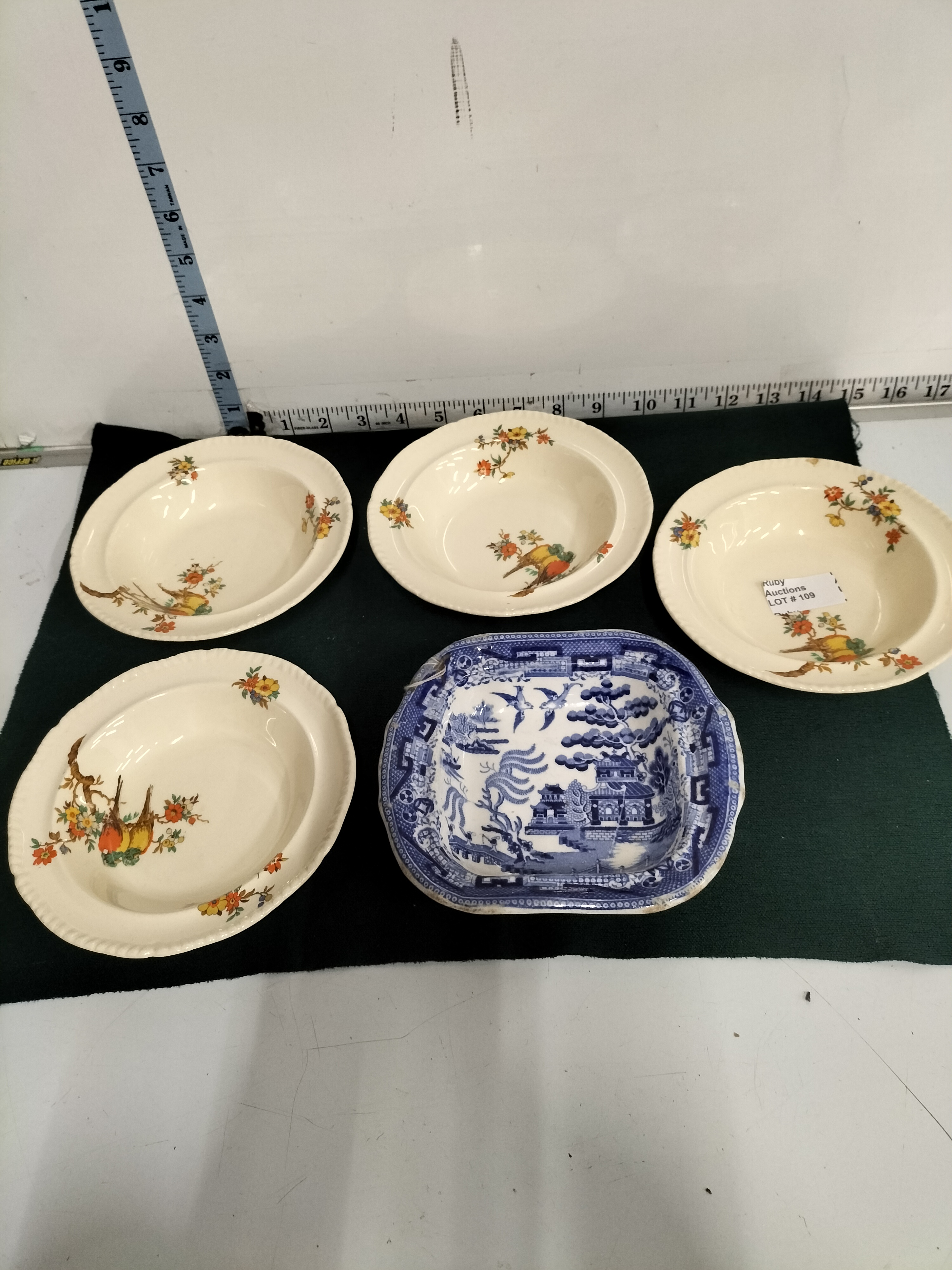 A collection of five ceramic bowls comprising four cream-coloured round bowls with bird and floral motifs marked with registration number 771239 and one square blue and white transferware bowl in the Willow pattern, measuring approximately 14cm to 16.5cm.
