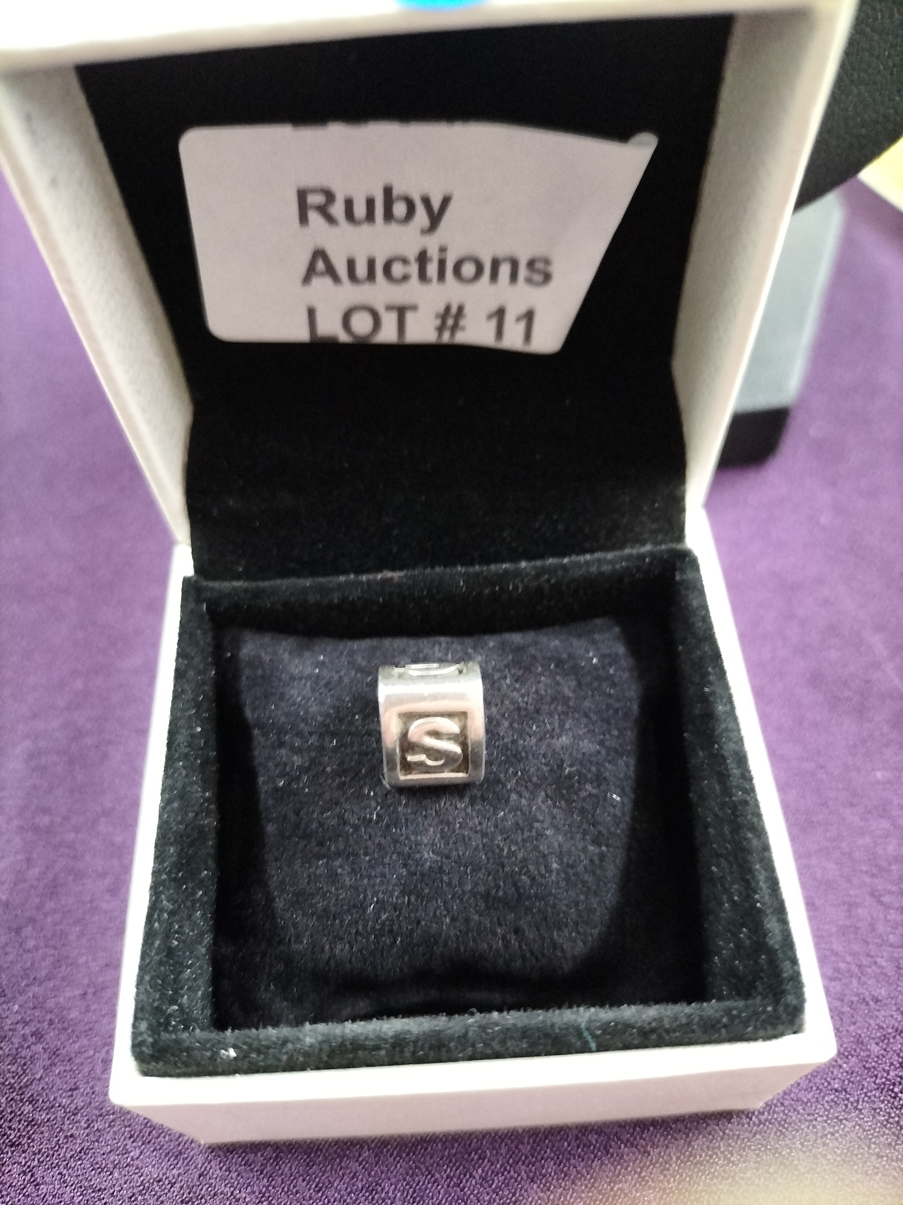 A Pandora silver initial charm featuring an embossed letter S, presented in a black-lined Pandora box.