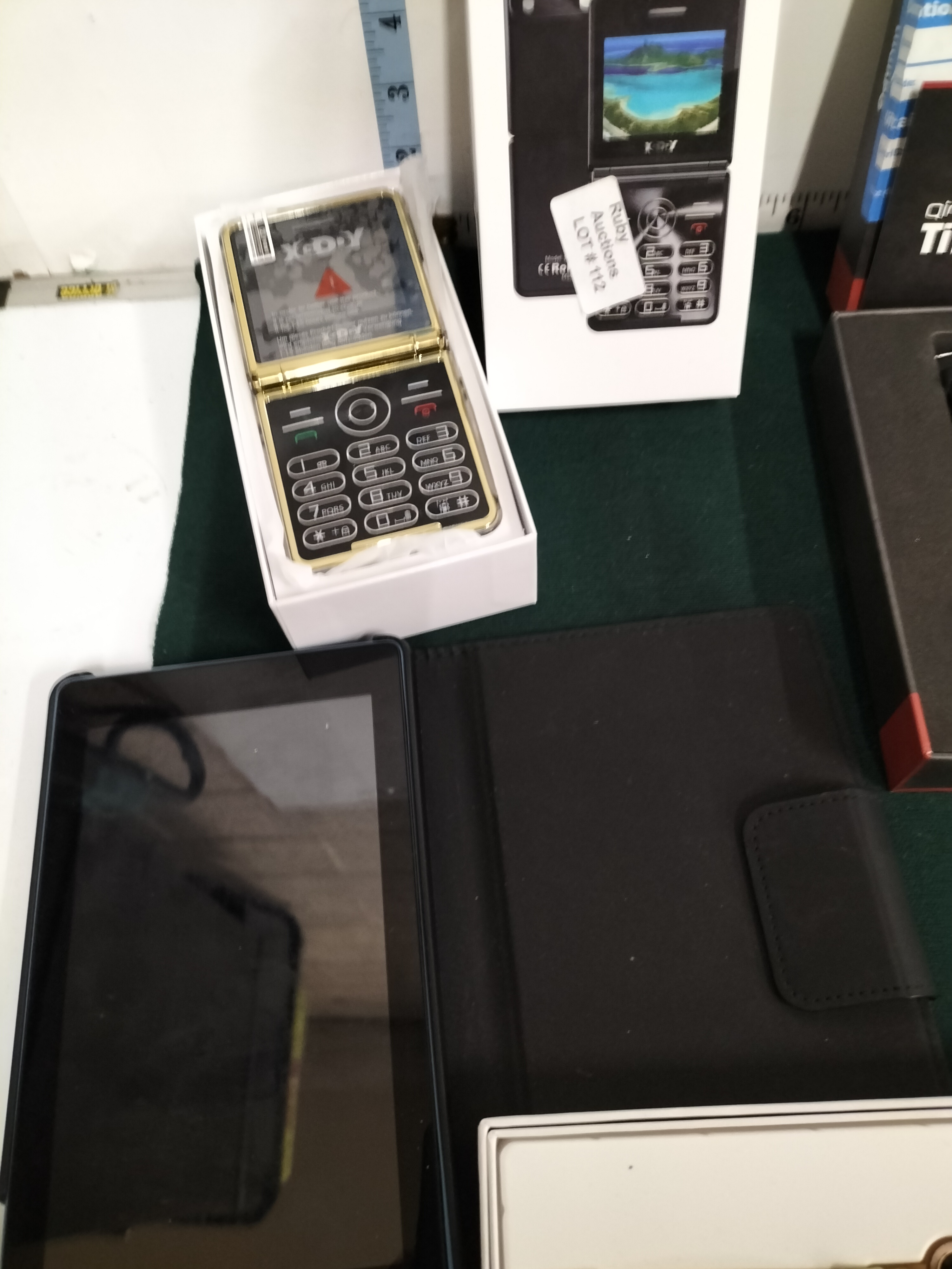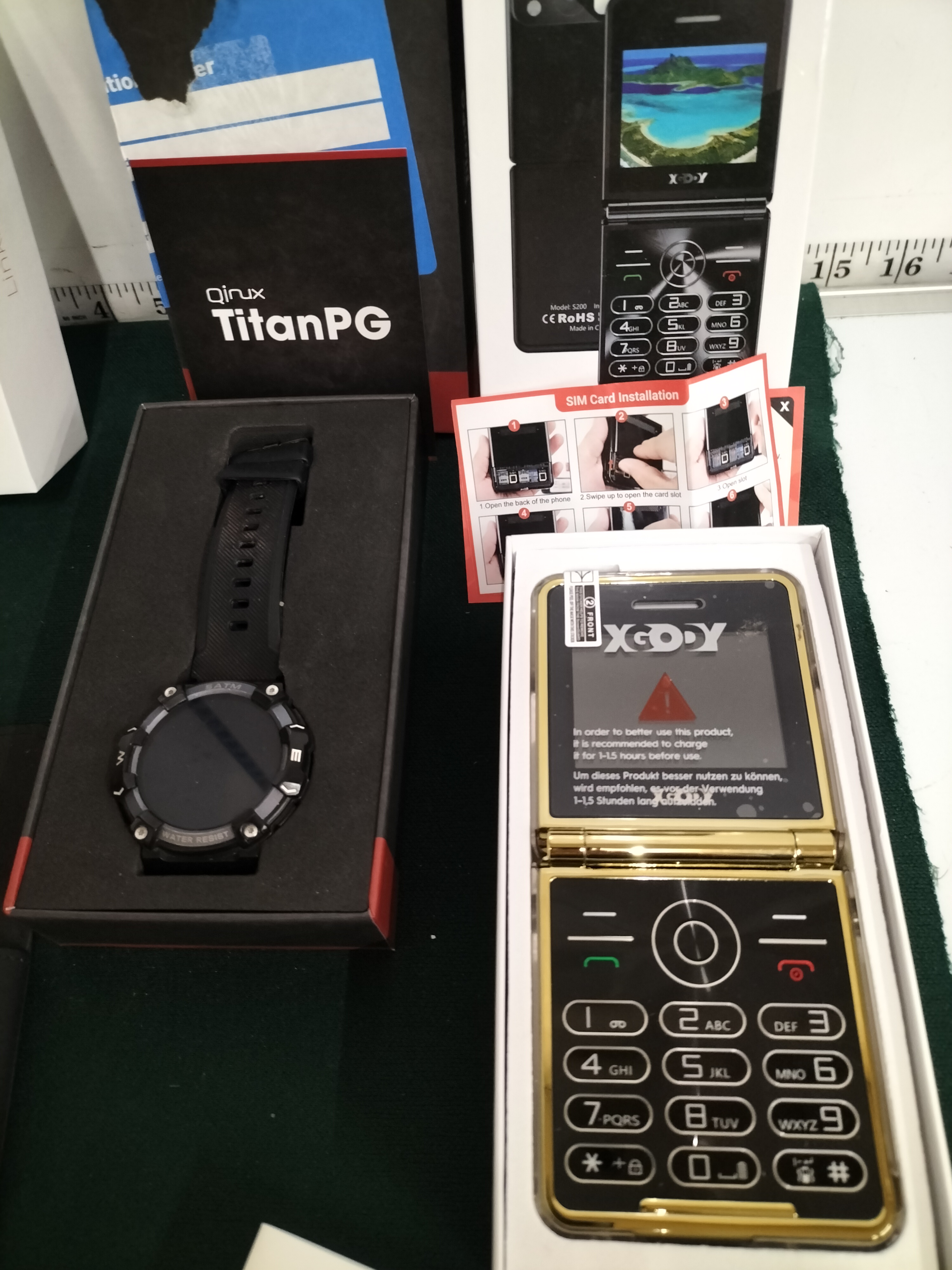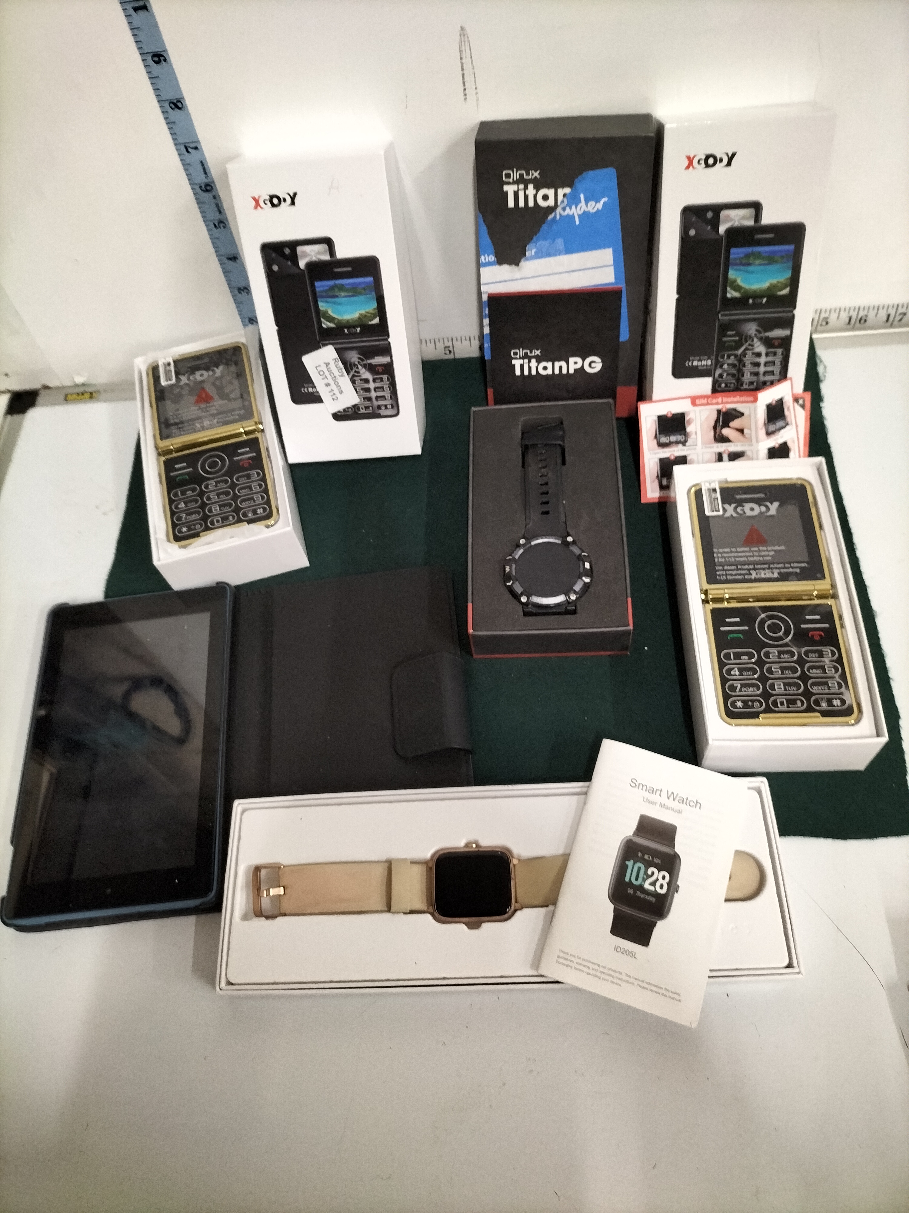 A collection of electronic devices featuring gold-tone XGODY flip phones, a qirux TitanPG smartwatch, an ID205L smartwatch with manual, and a black tablet with folio case.