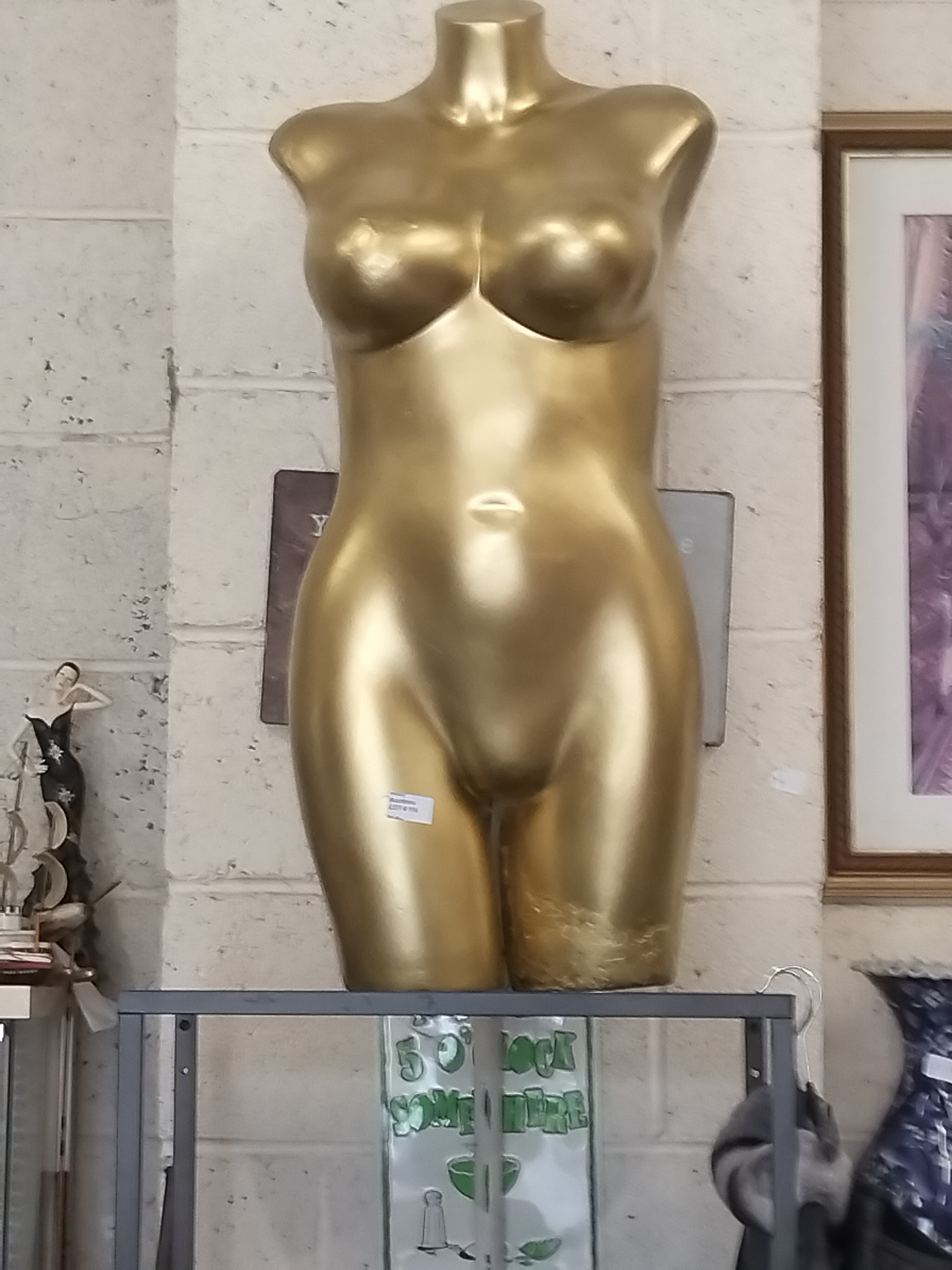 A gold-coloured plastic female torso mannequin form featuring anatomical contours and a smooth metallic finish.