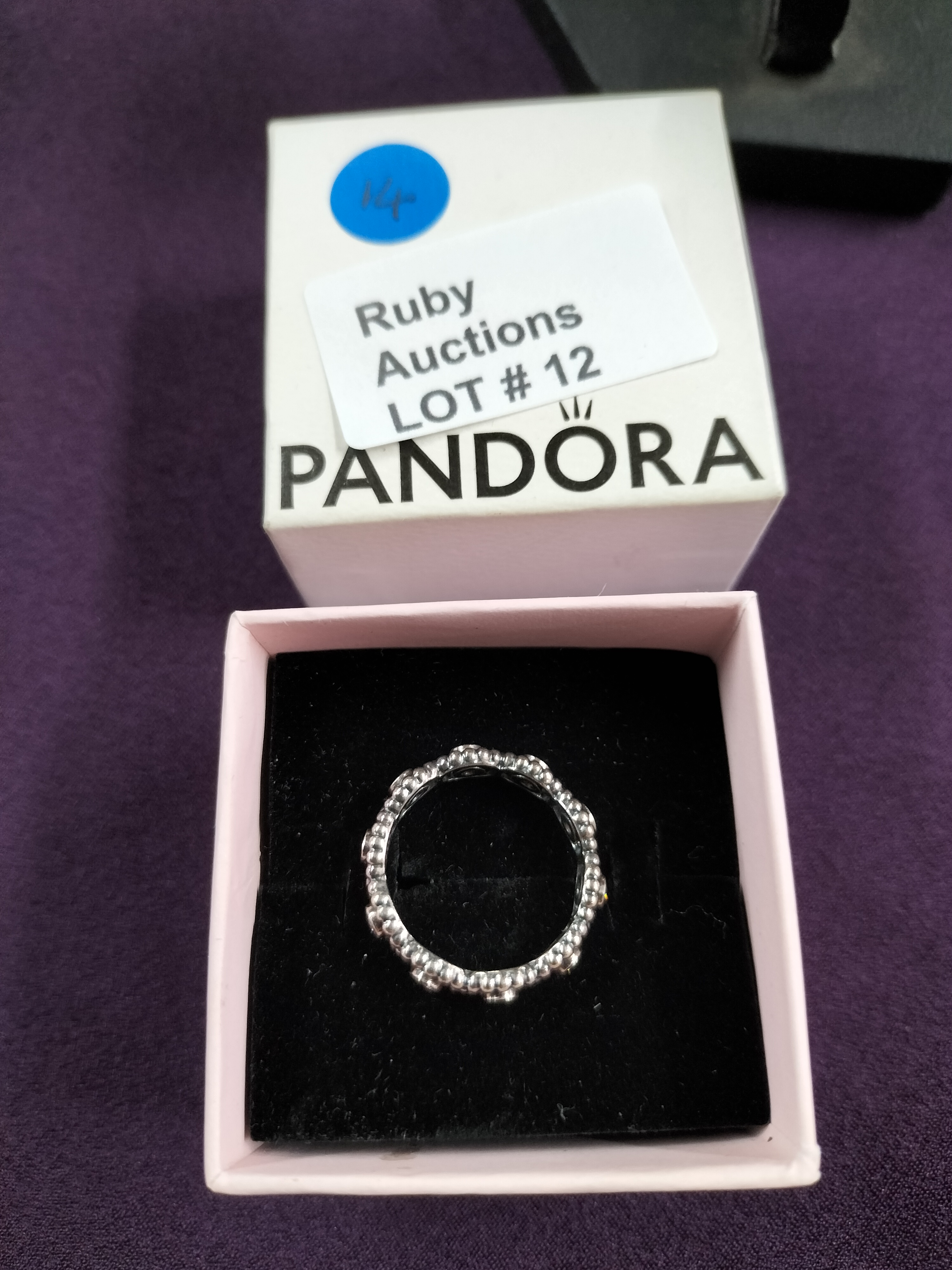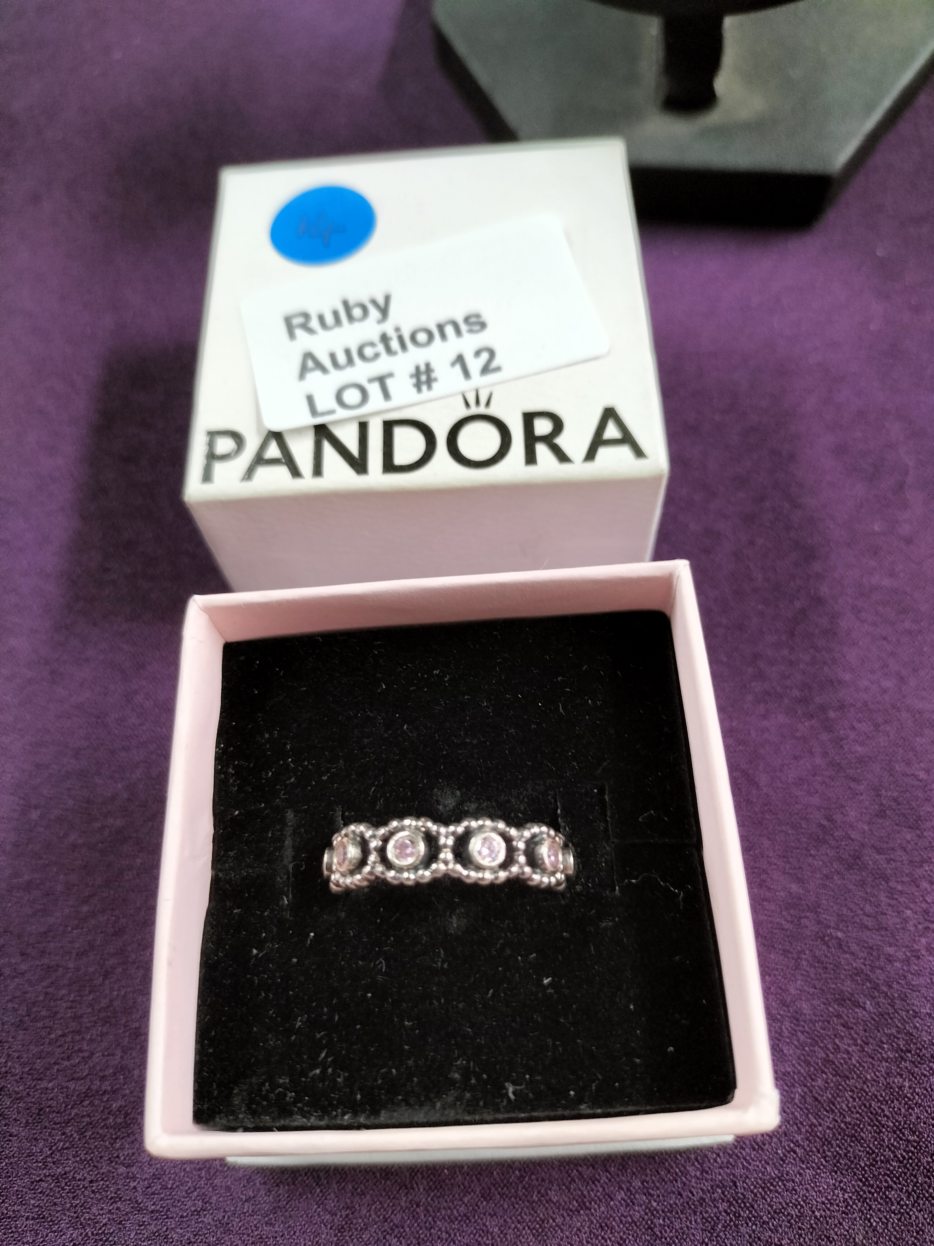 A silver Pandora ring set with several small pink stones, presented in its original white and black branded jewellery box.