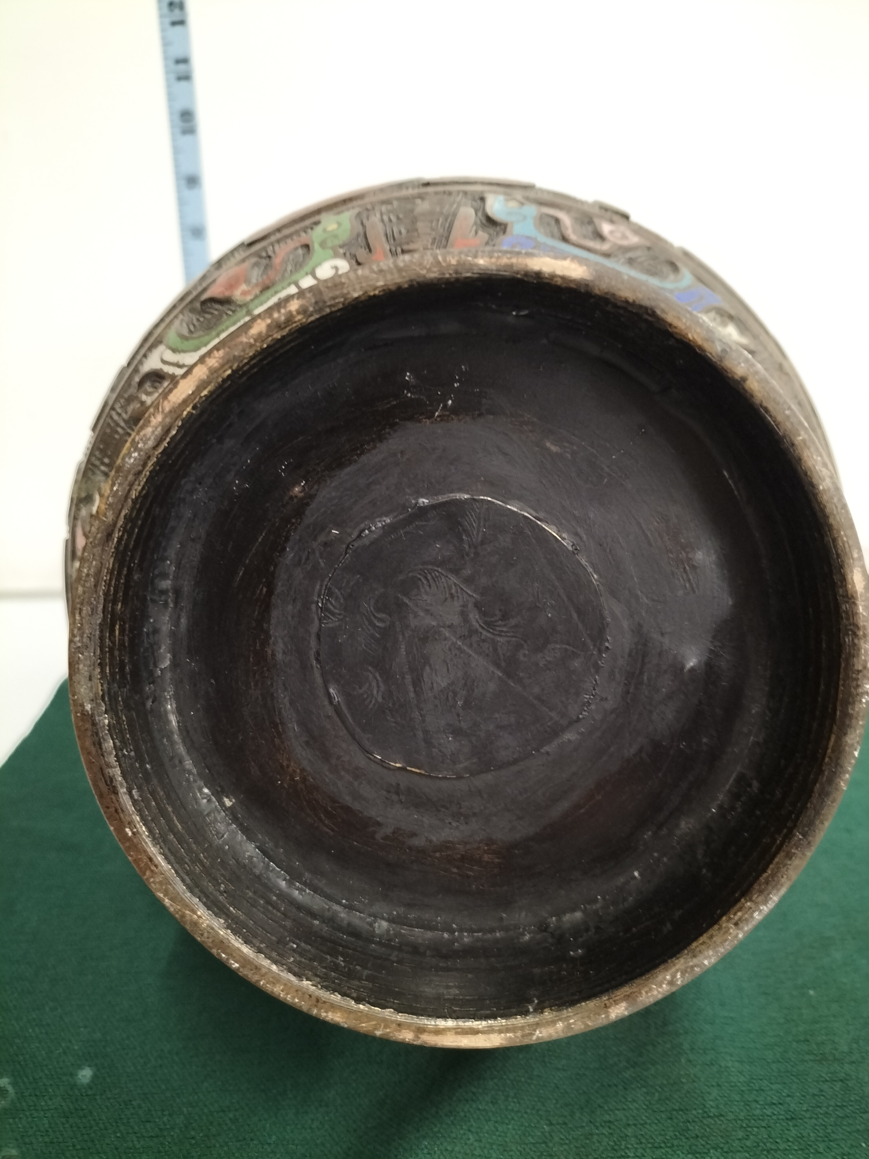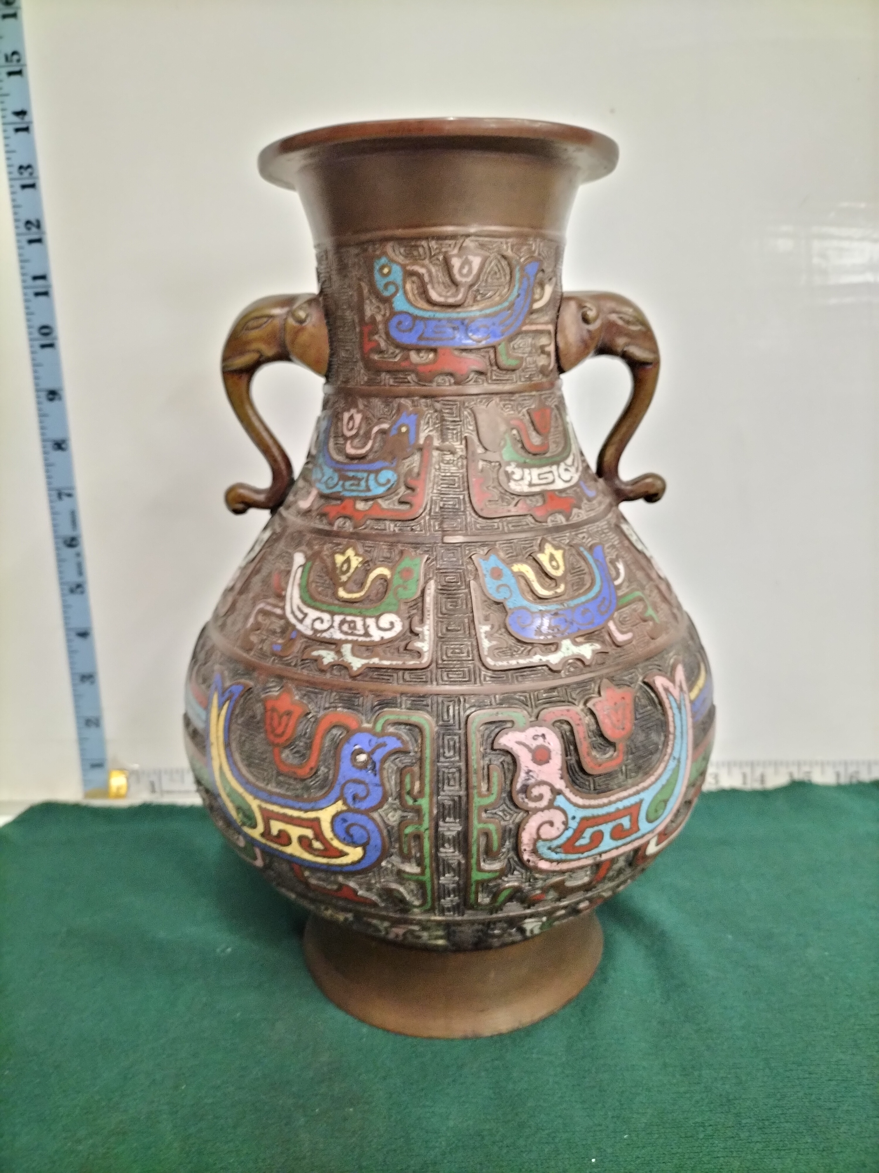 A Japanese champlevé enamel bronze vase featuring elephant-head handles and multi-coloured bird motifs, measuring approximately 37 cm in height.