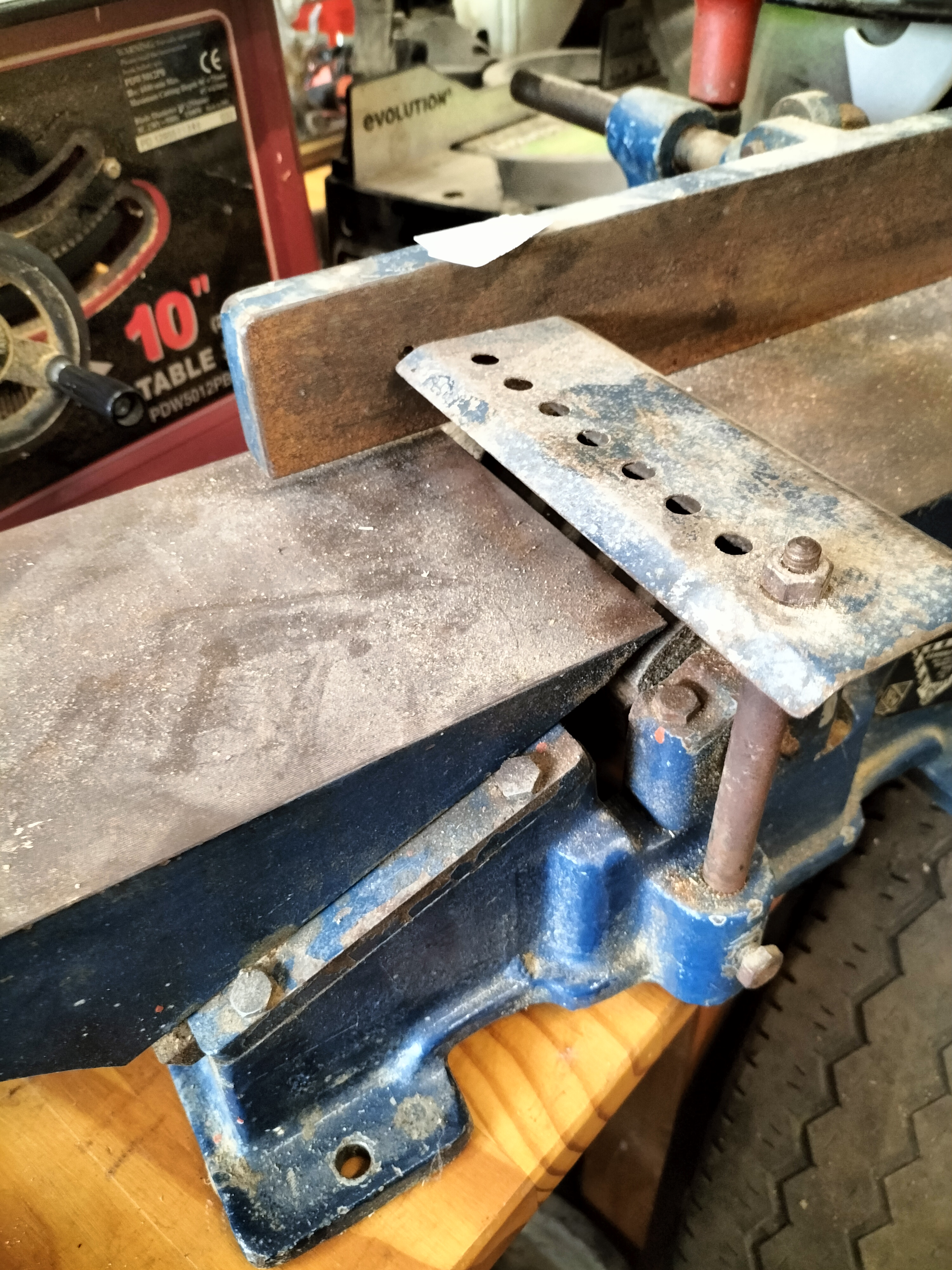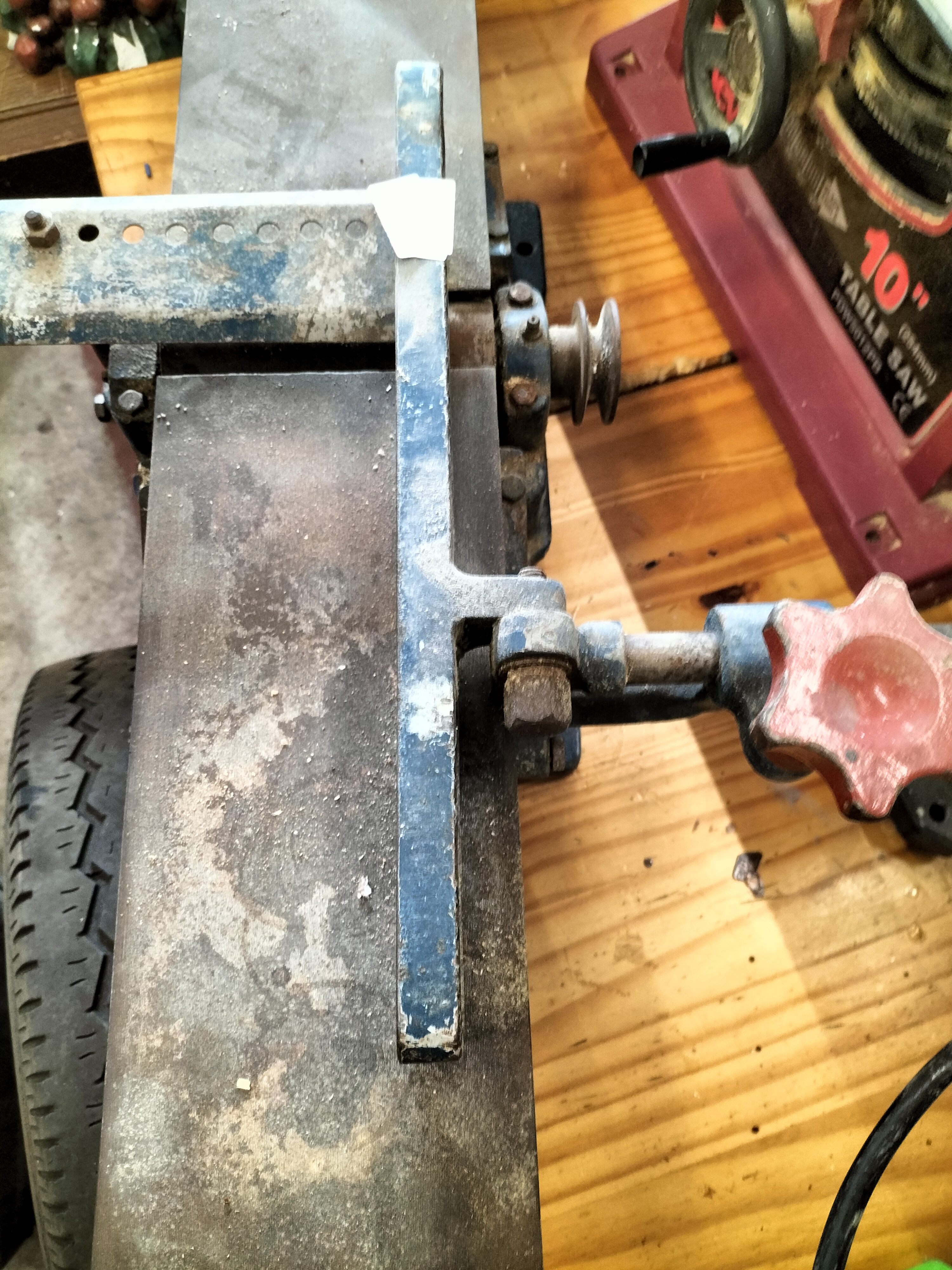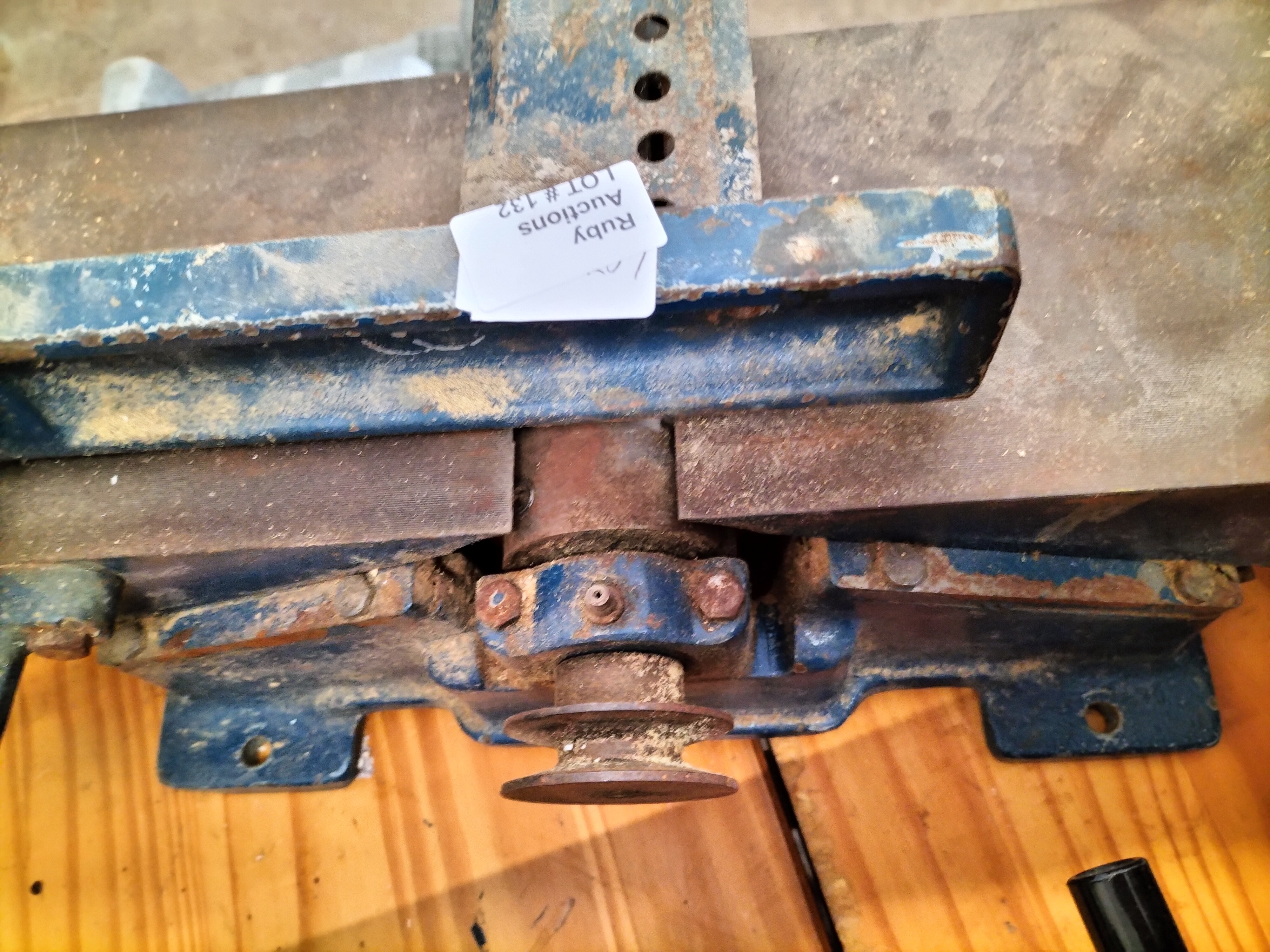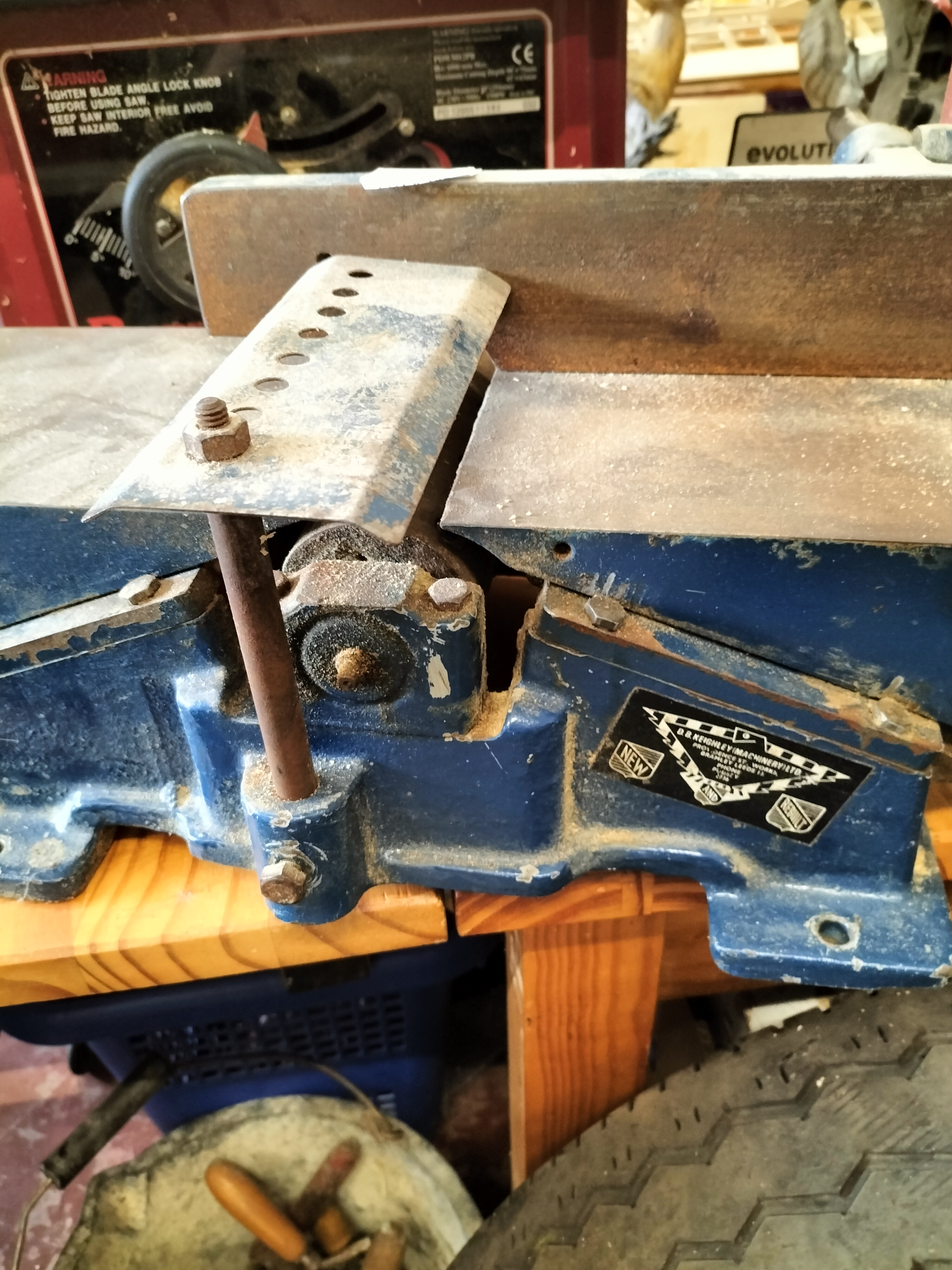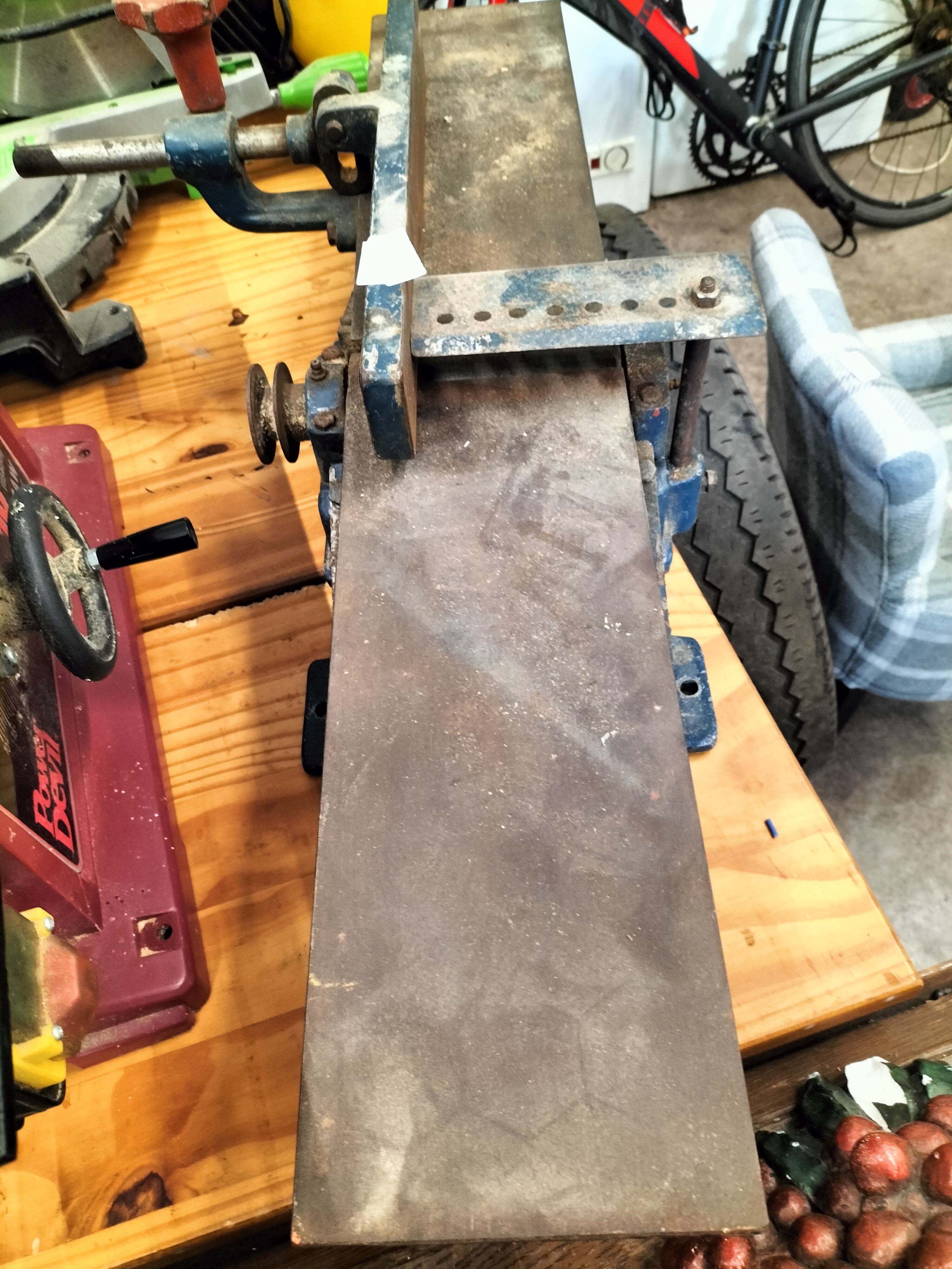 A vintage blue cast-iron woodworking jointer featuring an identifying label for D.B. Keighley Machinery Ltd. of Bramley, Leeds, with a pulley drive and adjustable fence.