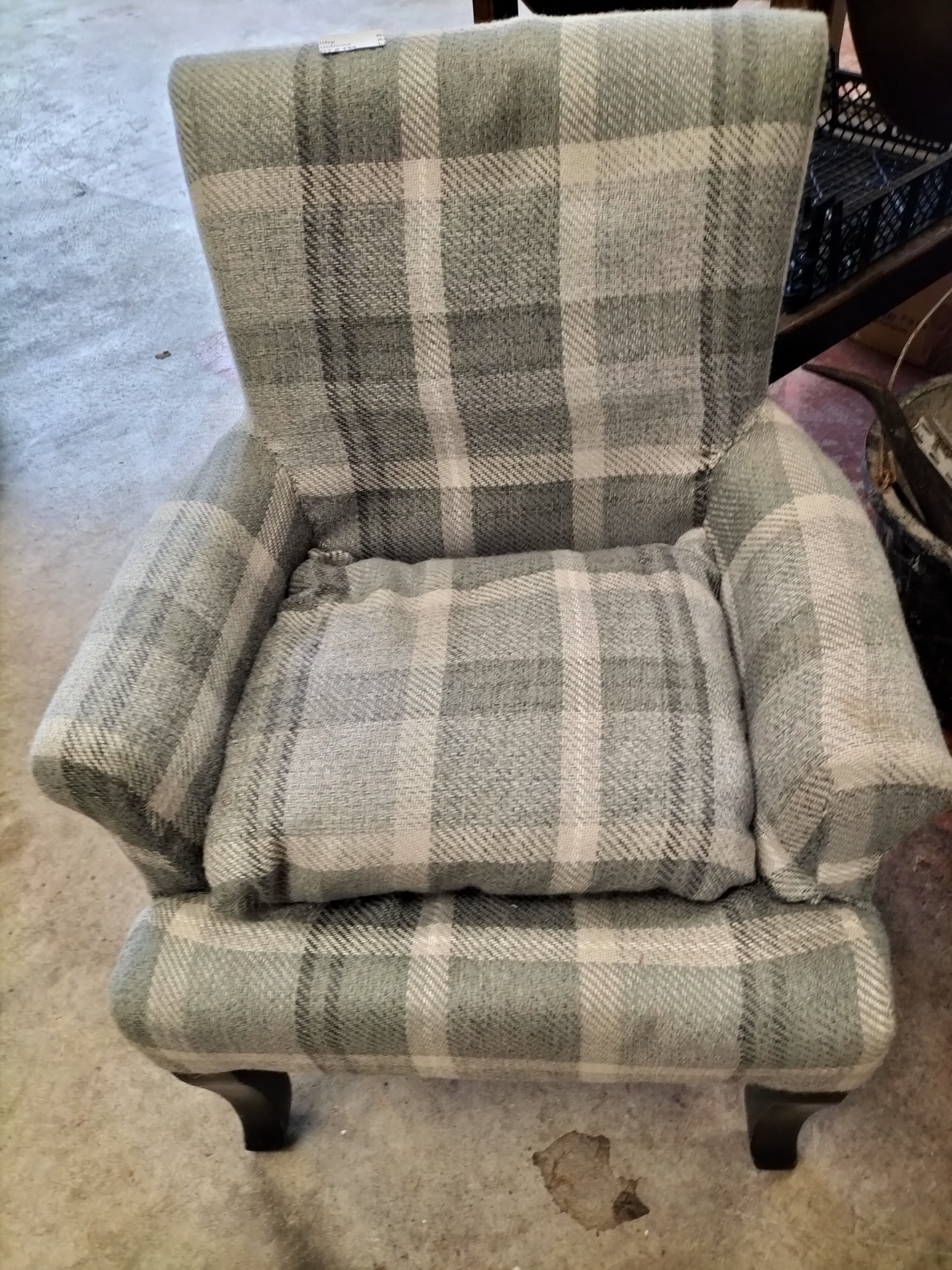 An upholstered Childs armchair featuring a grey and white checkered plaid pattern with dark wood legs and a loose seat cushion.
