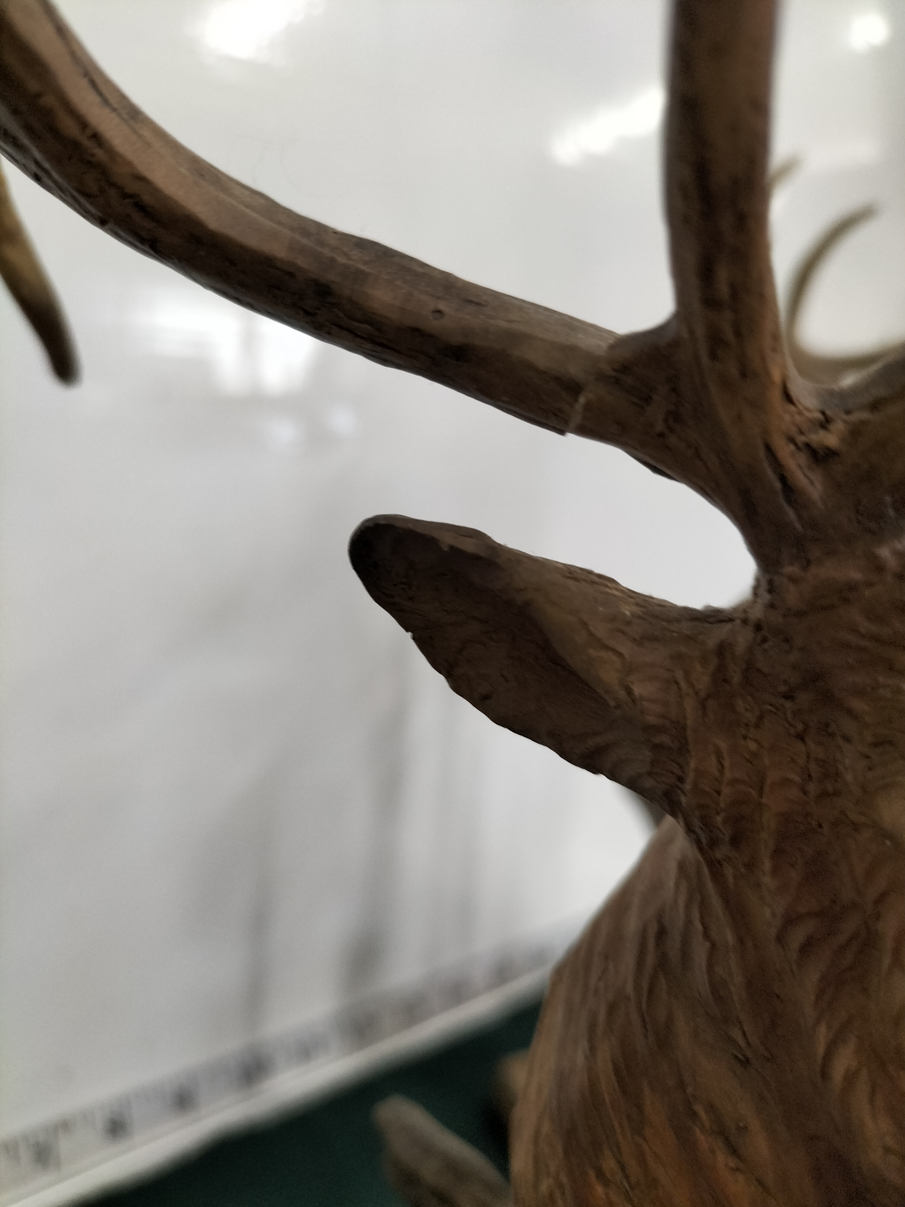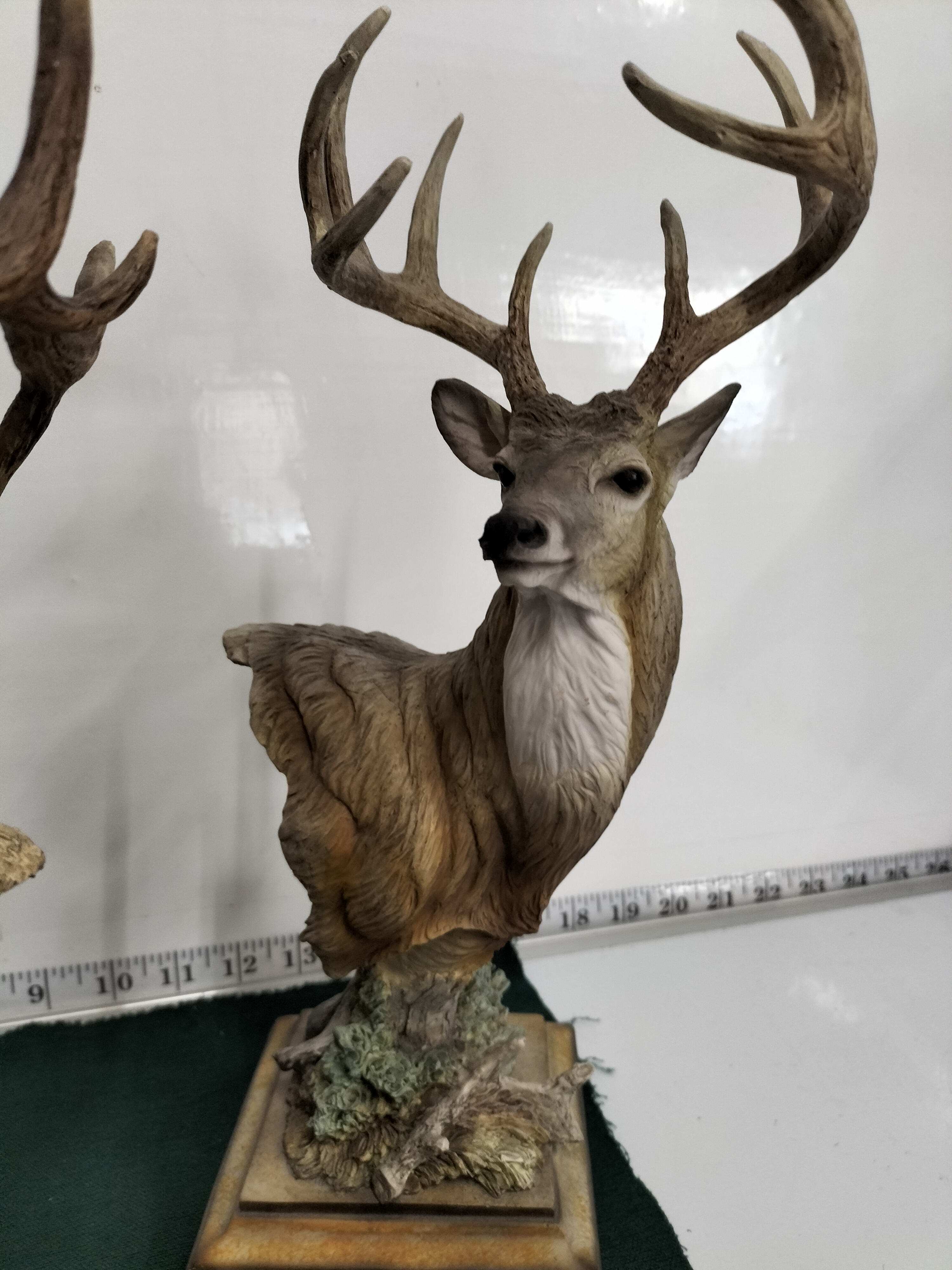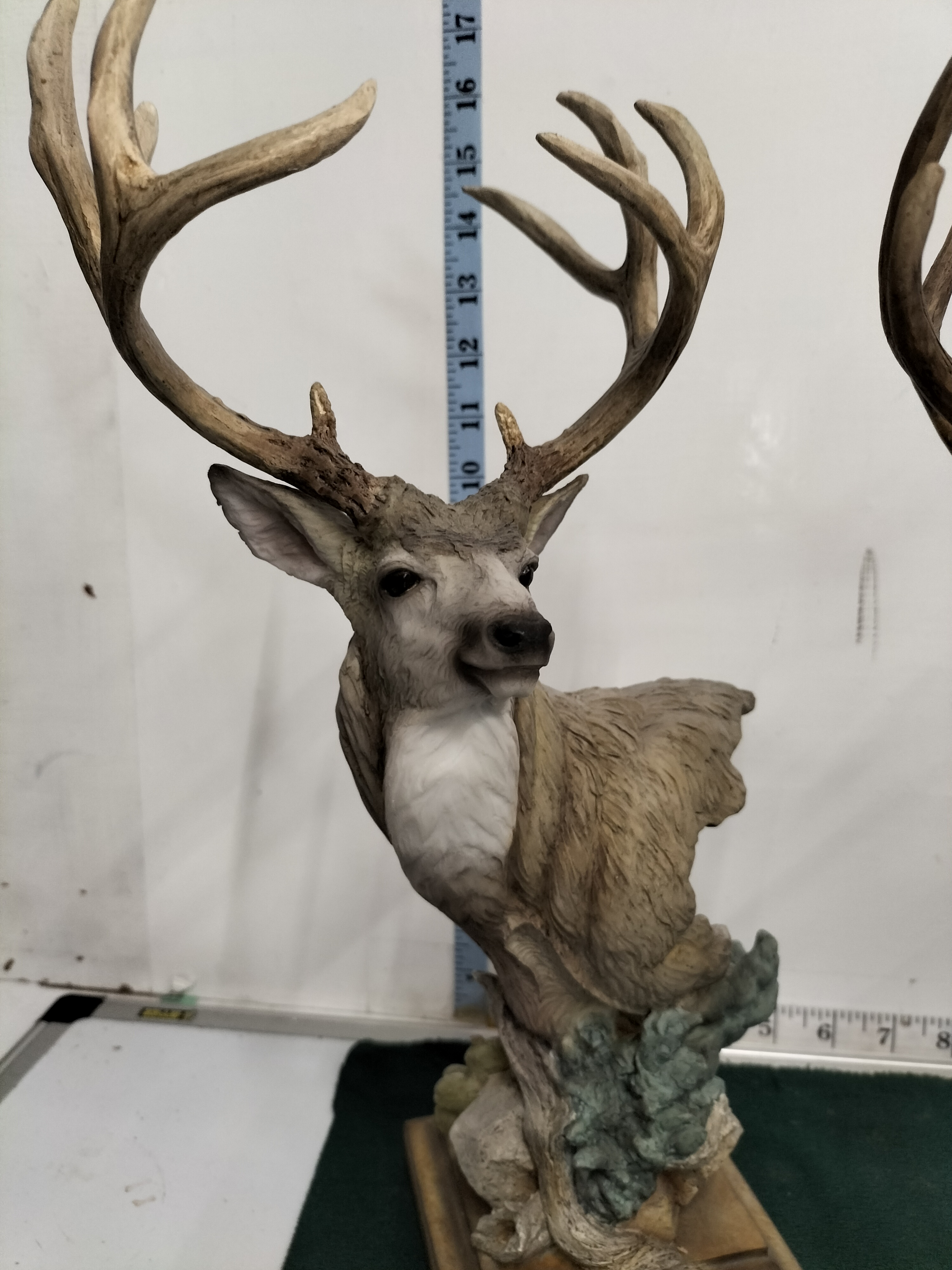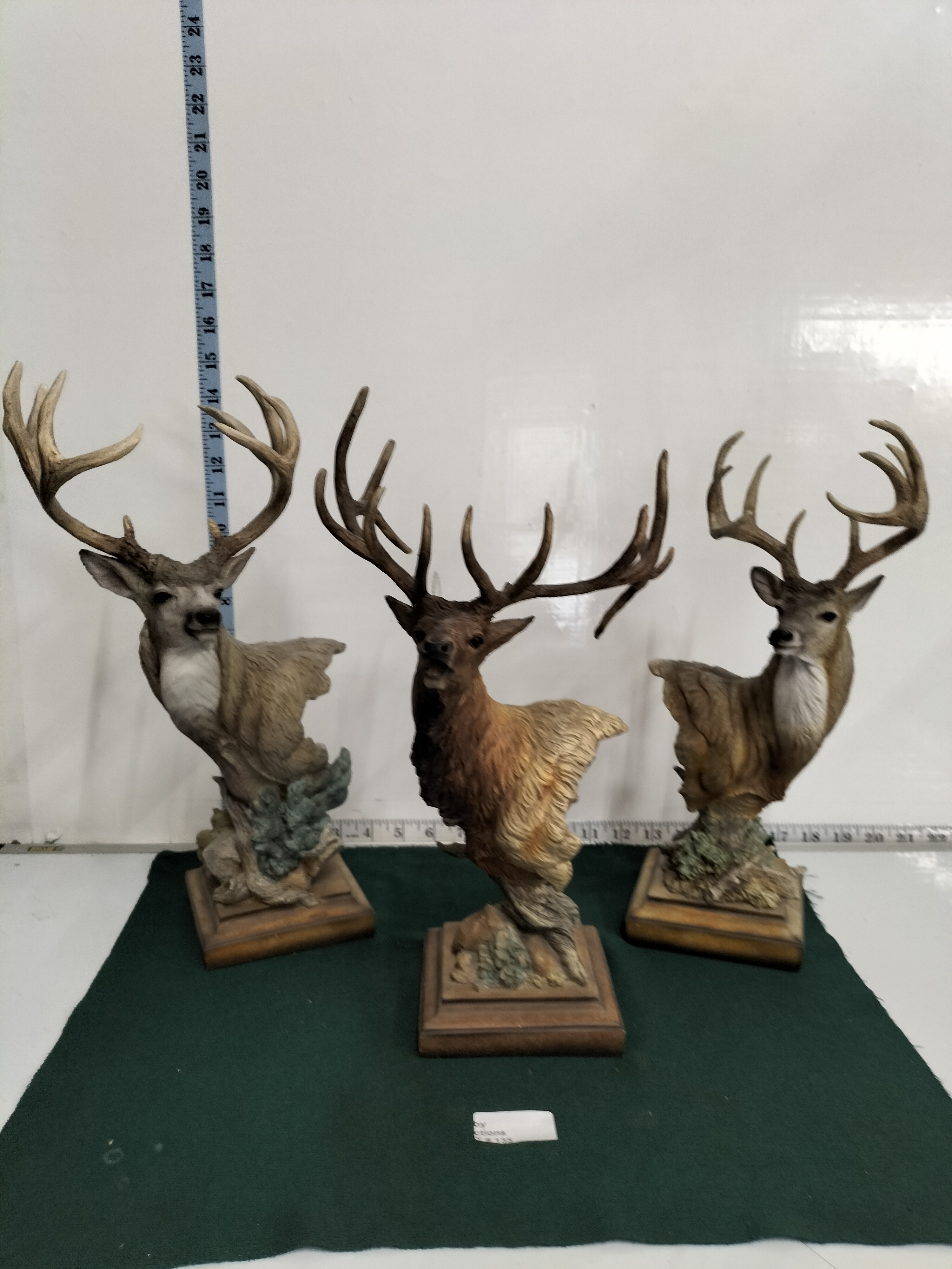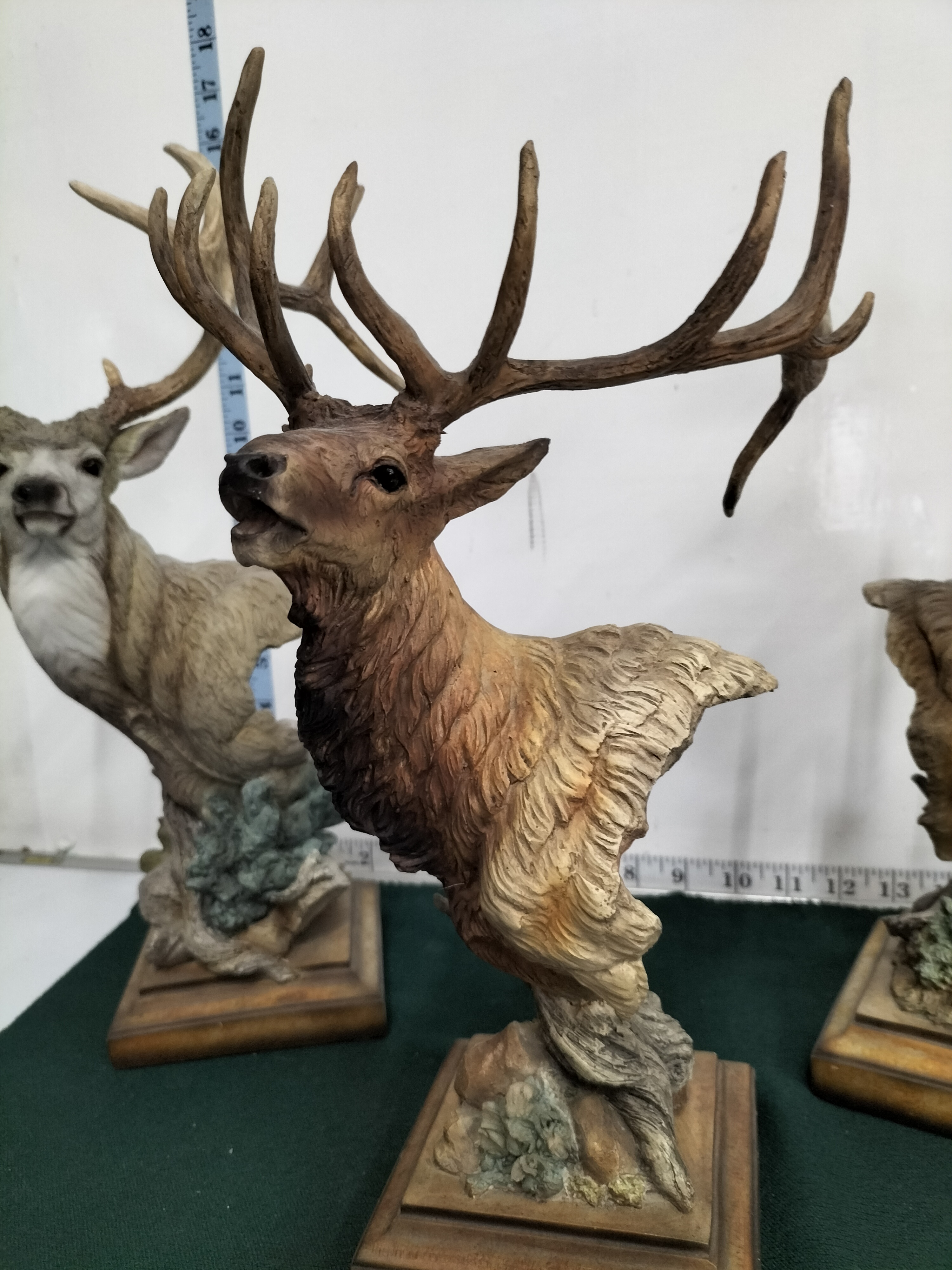 A trio of painted resin wildlife busts depicting an elk and two species of deer, each mounted on a wooden base, with heights ranging from approximately 15 to 17 inches.