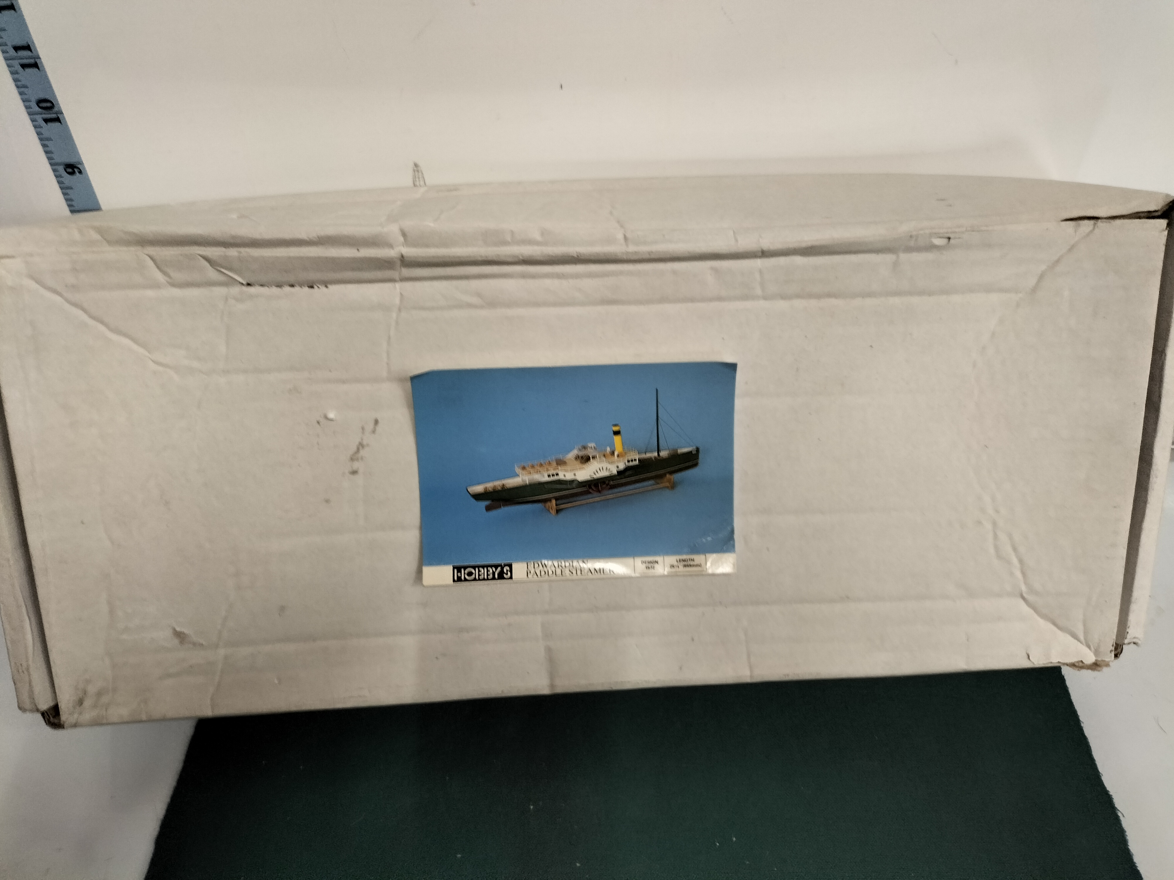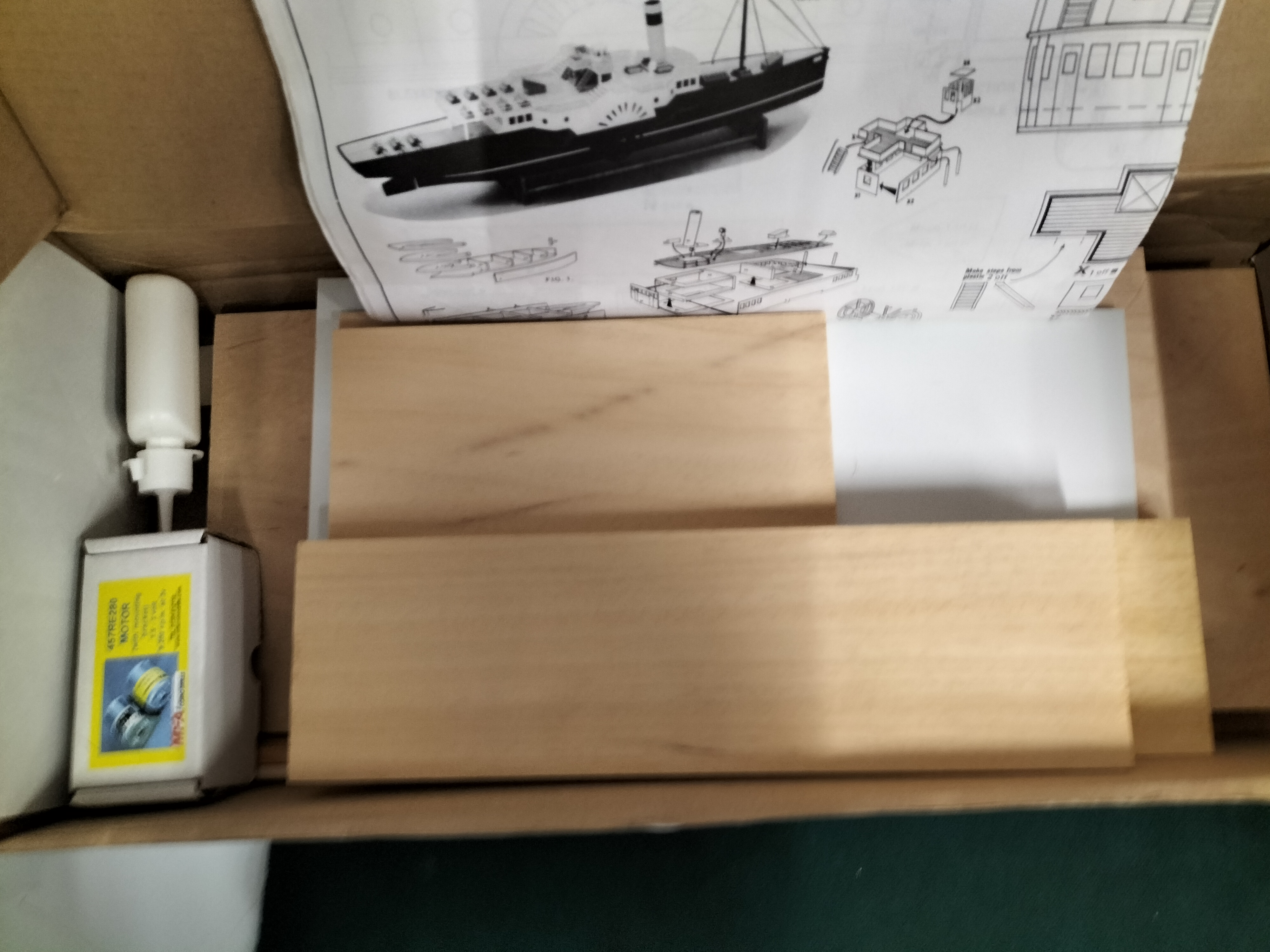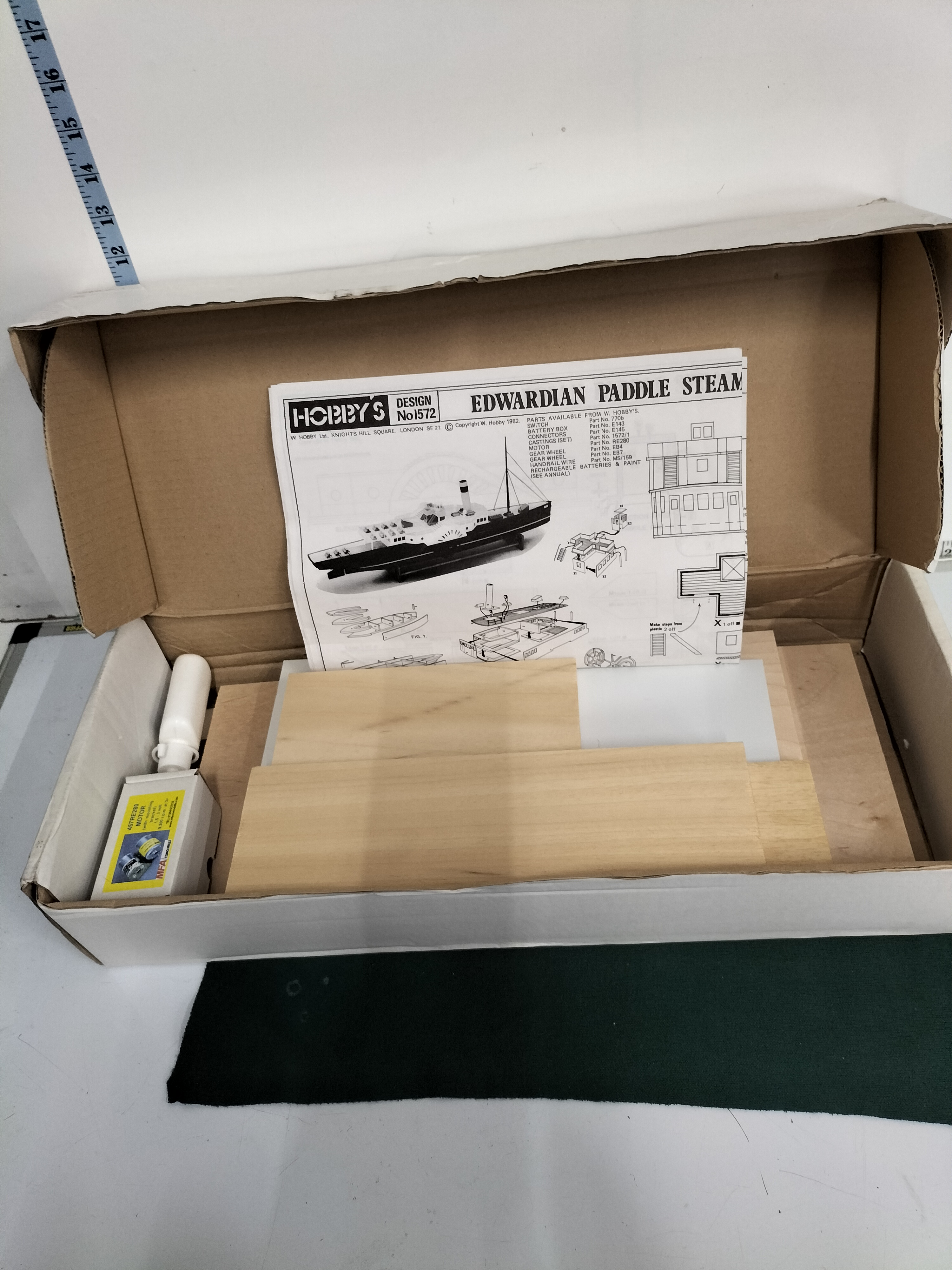 A vintage wooden model ship kit for an Edwardian Paddle Steamer, Design No. 1572, comprising multiple natural wood and white pieces, an instruction manual dated 1982, and an MFA 457RE280 motor, contained within the original box measuring approximately 43cm in length.