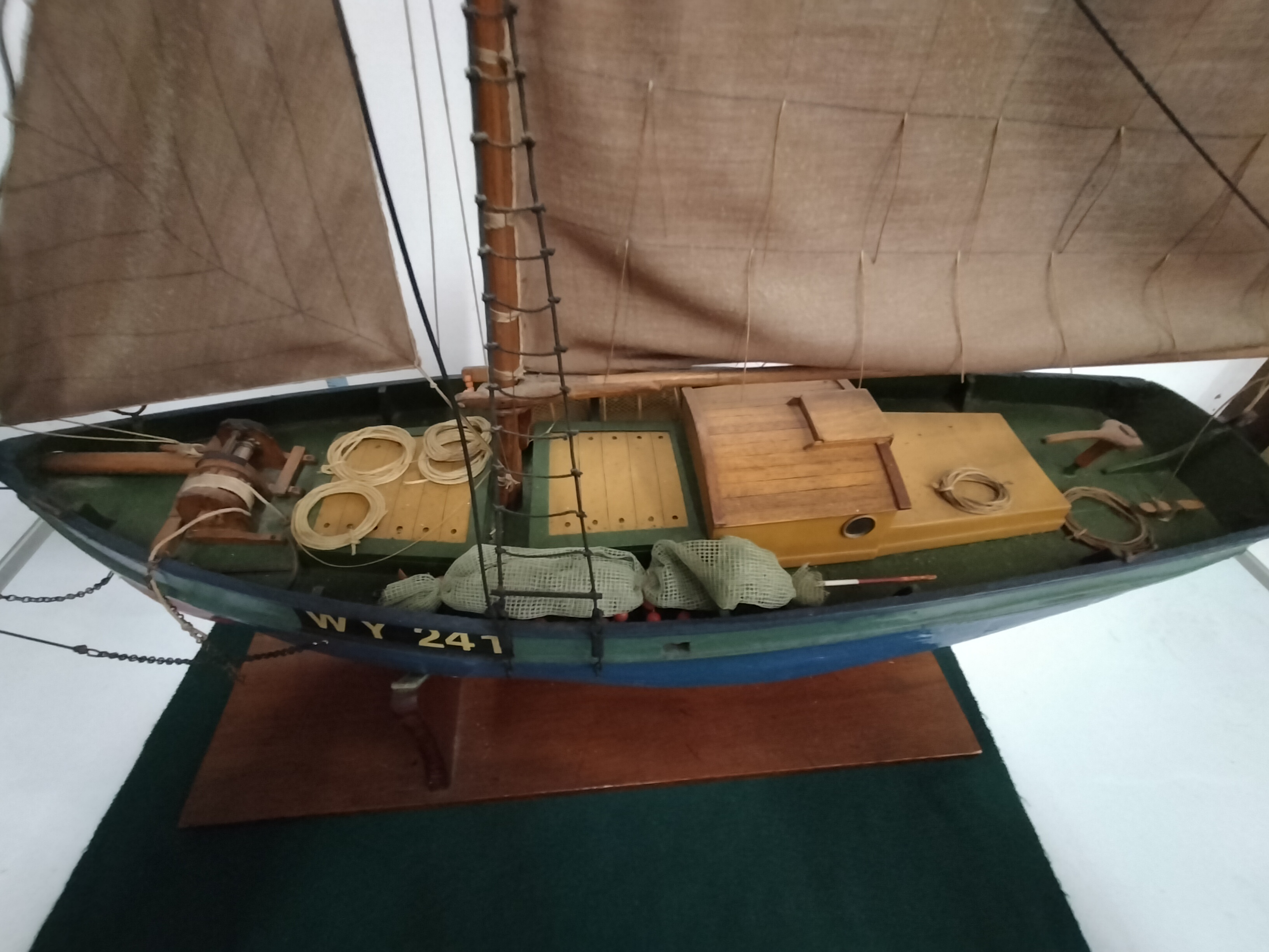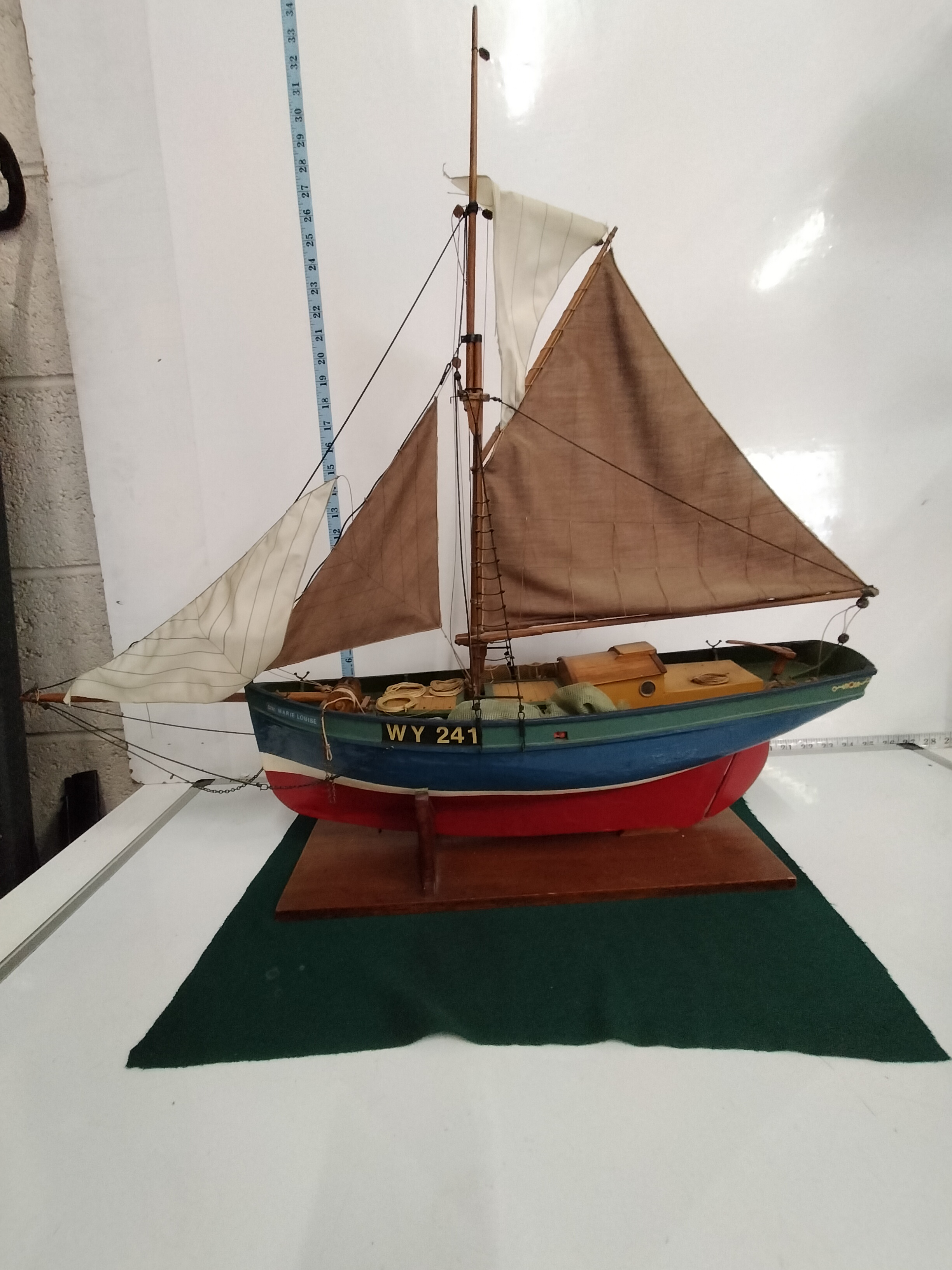 A large wooden model sailing boat featuring a red, blue, and green hull with tan fabric sails and deck accessories, measuring approximately 86cm in height and 71cm in length.